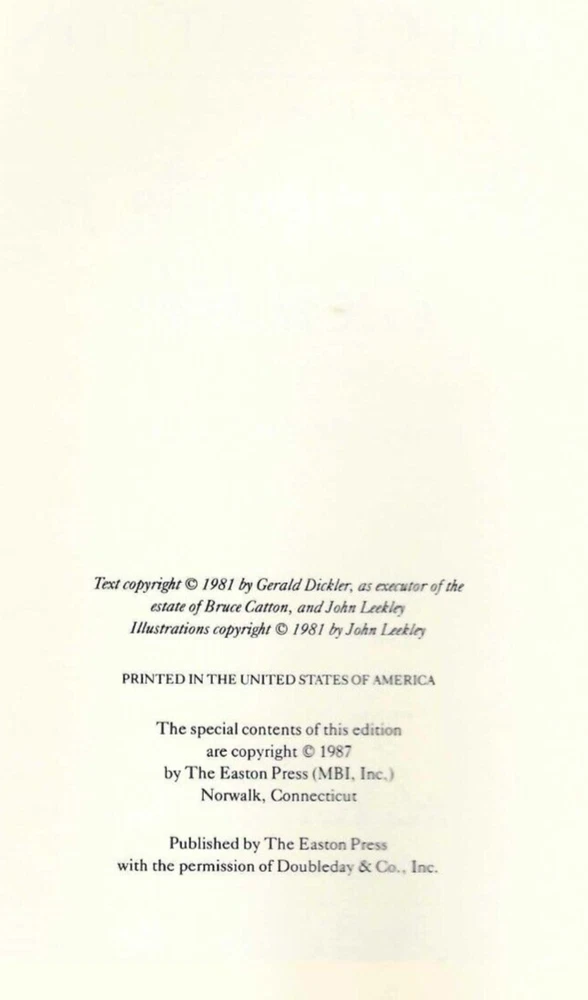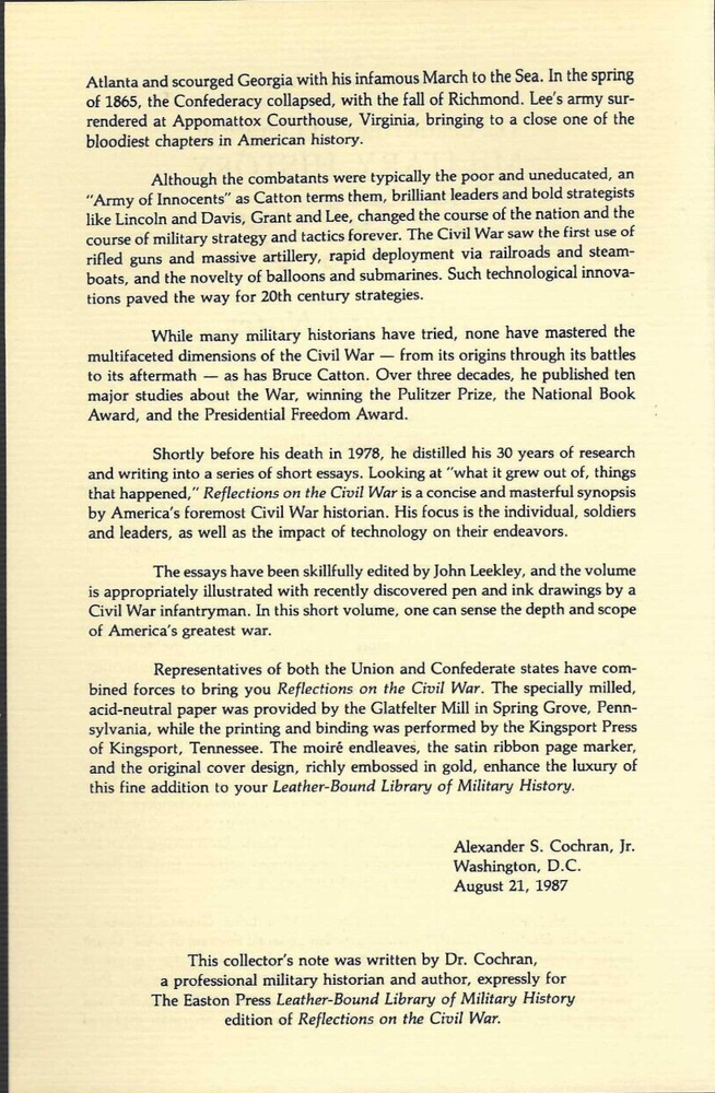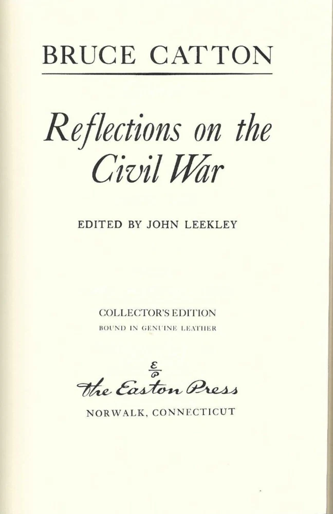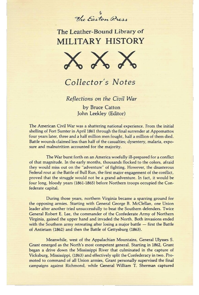 For auction is Reflections on the Civil War by Bruce Catton. This volume was published by The Easton Press, as part of the Leather-Bound Library of Military History. The book was published by Easton Press in 1987, and was copyrighted and originally published in 1981. Mr. Catton was renowned as a master of all aspects of the Civil War. He published ten major studies about the Civil War, and won the Pulitzer Prize, the National Book Award and the Presidential Freedom Award. Shortly before his death, Mr. Catton produced a series of short essays about the Civil War, addressing its origins and occurrences. John Leekley edited these essays to form this book. The book is illustrated with pen and ink drawing made by a Civil War infantryman. This volume is in excellent and unread condition. The front and back covers are both in pristine condition and the gilded page edges show virtually no wear. The photographs of the book are the actual book itself, not stock photographs. The book consists of 246 pages, including the index. This book comes with a blank bookplate on which you can insert your name and attach it to the book. Also included are the Collector’s Notes. This book, like others in the Easton Press Leather-Bound Library of Military History is bound with premium leather and with heavy duty binding boards, which enhance the book’s durability. The pages are printed on high quality acid-neutral paper, which will not yellow with age, with Smyth-sewn pages for durability, and features a hubbed spine, accented in 22 kt gold, moiré fabric end-sheets, gilded page edges and a satin ribbon page marker. The book was printed and bound in the United States of America. The book will be shipped via Media Mail, carefully wrapped in bubble paper in a protective box. We shall be pleased to offer combined and reduced shipping for a purchaser of two or more books at the same time. Thank you for your interest in this excellent volume.