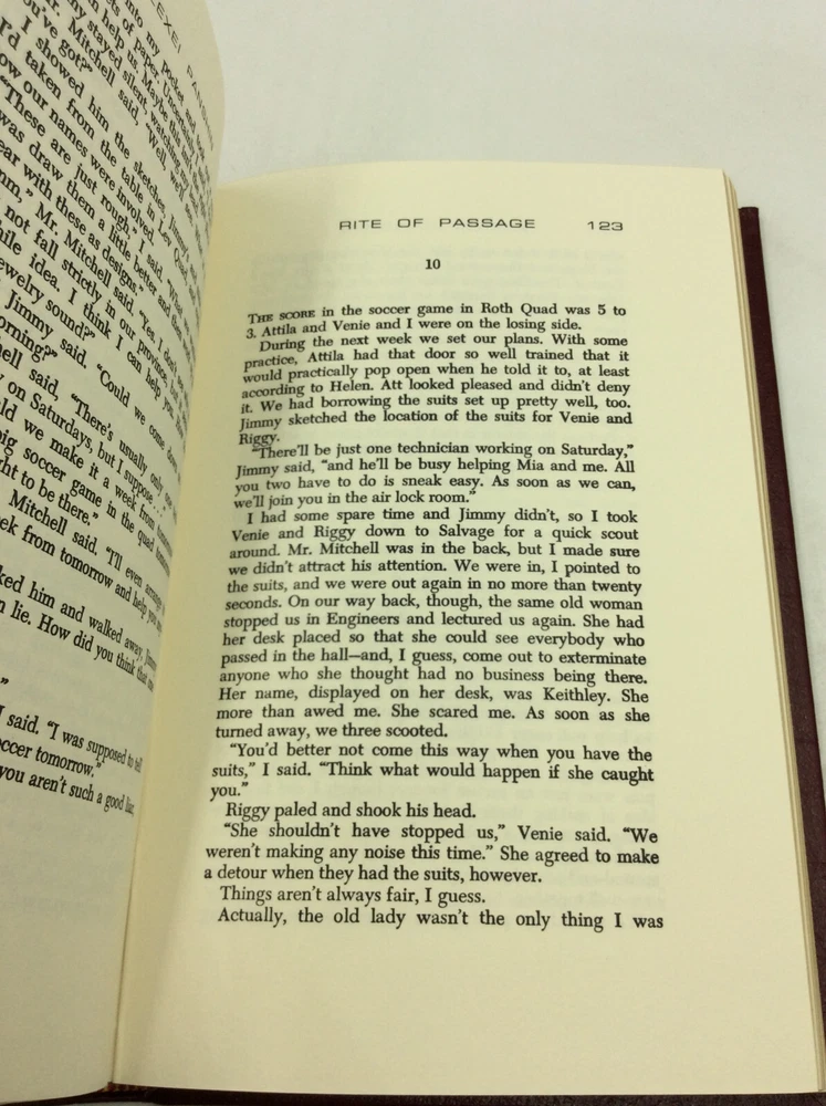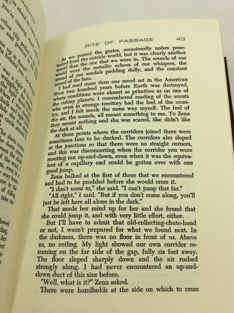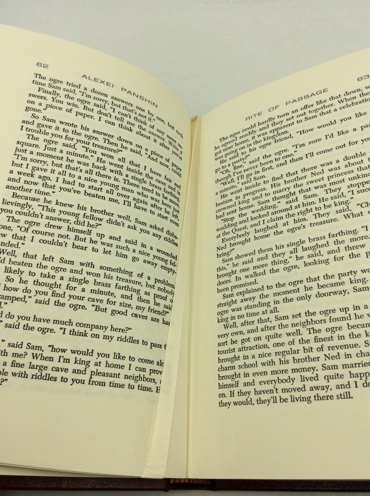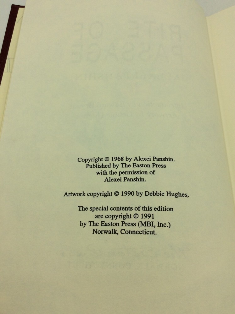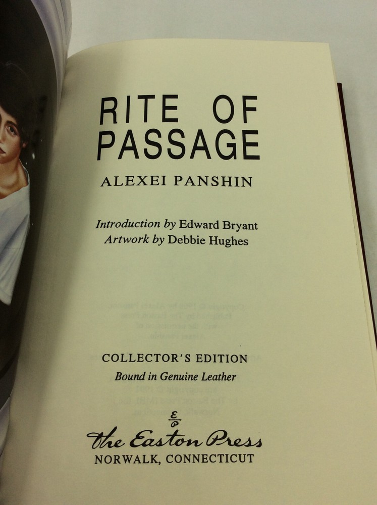 Alexi Panshin RITE OF PASSAGE Norwalk, Connecticut: The Easton Press, 1991. Collector's Edition. Leather_bound. 248 pgs. A new, unread hardcover book bound in red leather with gold debossed details on cover, gilded foredges, and an off-white ribbon. Item #202981