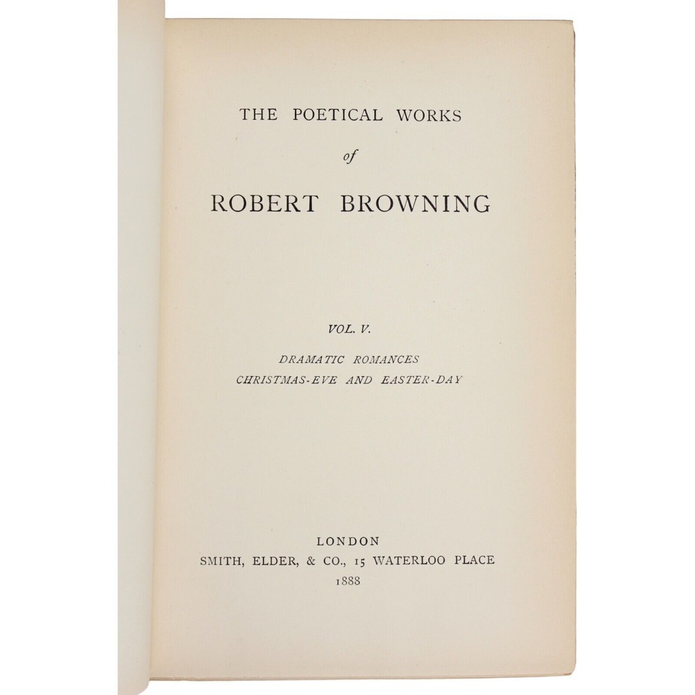 VOLUME 16 ONLY of The Poetical Works of Robert Browning Published by Smith, Elder, & Co., London, 1888 Vol. 16 ONLY (of a 16 Volume Set) FERISHTAH'S FANCIES, PARLEYINGS WITH CERTAIN PEOPLE Published by Smith, Eler, & Co. London, 1888. Very good, 3/4 leather binding with marbled boards and marbled endpapers, 5 raised spine bands, gilt titling and decoration to spine, top edge gilt. Very good hardcover, with tight binding, solid spine, previous owner's bookplate to front endpaper, clean unmarked text. 8vo, measures approx. 5-⅛” x 7-¼”. Photos are of VOLUME 5 - all volumes are in nearly identical condition - if you would like photos message me. Loc: A7 Store Add to Favorites Feedback ROBERT BROWNING LEATHER BOUND FINE BINDING POETRY 1888 Vo 16 ONLY SMITH ELDER UK VOLUME 16 ONLY of The Poetical Works of Robert Browning Published by Smith, Elder, & Co., London, 1888 Vol. 16 ONLY (of a 16 Volume Set) FERISHTAH'S FANCIES, PARLEYINGS WITH CERTAIN PEOPLE Published by Smith, Eler, & Co. London, 1888. Very good, 3/4 leather binding with marbled boards and marbled endpapers, 5 raised spine bands, gilt titling and decoration to spine, top edge gilt. Very good hardcover, with tight binding, solid spine, previous owner's bookplate to front endpaper, clean unmarked text. 8vo, measures approx. 5-⅛” x 7-¼”. Photos are of VOLUME 5 - all volumes are in nearly identical condition - if you would like photos message me. Loc: A7