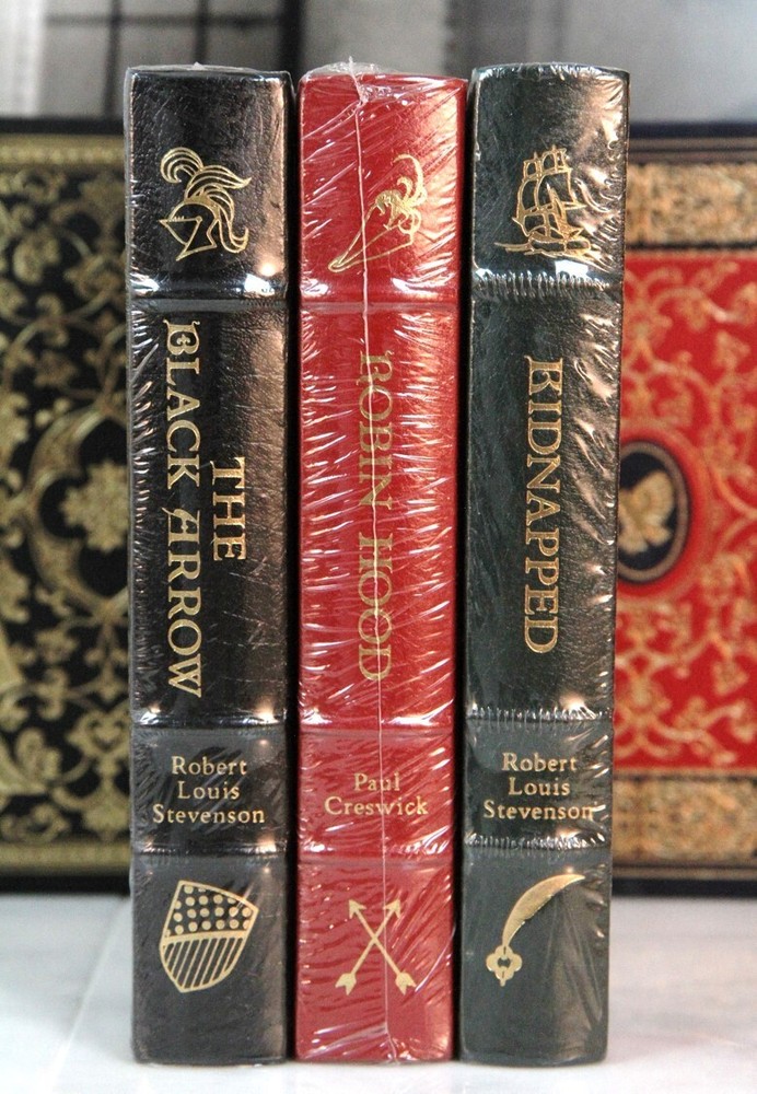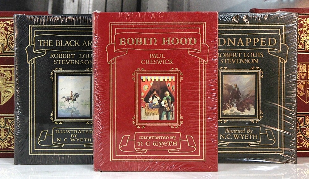 ***Copy of photos, personal formats, graphics, or text is prohibited . Ebay may drop listings with infractions. I review content regularly. N. C. Wyeth Illustrated Adventure Classics series Robin Hood - Black Arrow - Kidnapped Author: Robert Louis Stevenson, Paul Crestwick Illustrations by NC Wyeth Description : The N.C. Wyeth illustrated Adventure series has been issued in several iterations over the years. Now long out of print. This is a three volume set that was one of the earlier iterations. It generally matches the cover style of the larger collection, but does not have the NC Wyeth at the bottom of spine. But in place has a slightly larger icon indicative of the title, such as the shield, crossed arrows, and quill pen. It pairs the two R.L. Stevenson titles along with the Obligatory Paul Crestwick Robin Hood. This is a much more manageable collection and a great gift for readers young and young of heart. Condition : SEALED in original plastic. ***Stock photos of illustrations are from open copies I also had for sale. This Fine Leather Book Features: Top grade, gold embossed/ornamented leather Gilded page ends to protect against dust and moisture Decorative end papers Acid neutral archival paper to last generations