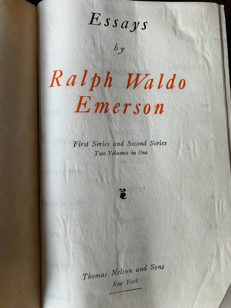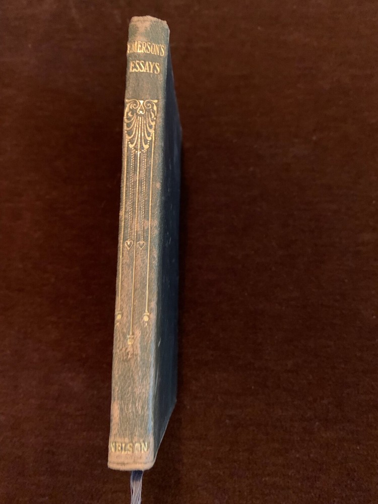 Lovely leather bound book from early 1900's. 4'X6 1/2" Excellent condition except for a little fading on spine of book. Gold on top of pages still good. Essays by Ralph Waldo Emerson. First Series and Second Series Two volumes in One. Thomas Nelsons and Sons Publisher Belonged to my husband's grandmother so we are only the second owners. I have listed another similar book : The Thoughts of The Emperor Marcus Aurelius Antoninus. If you buy both books there is a10% discount.