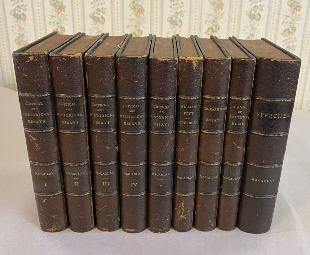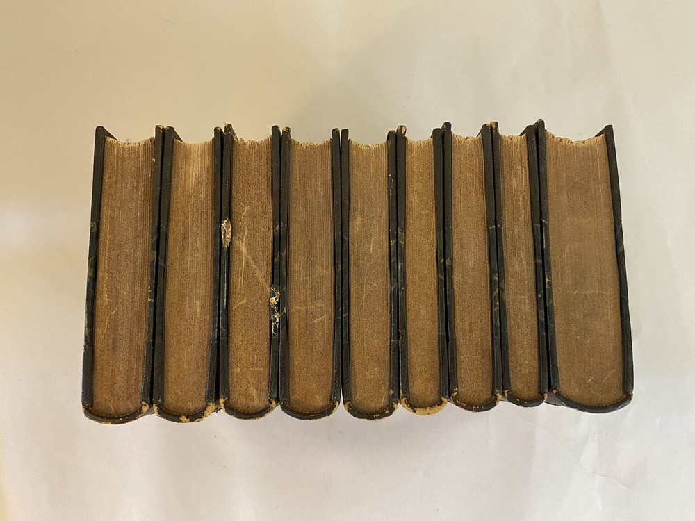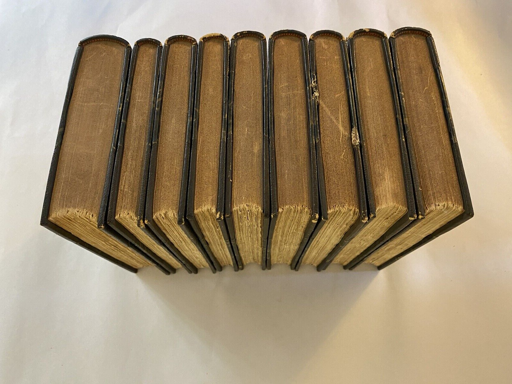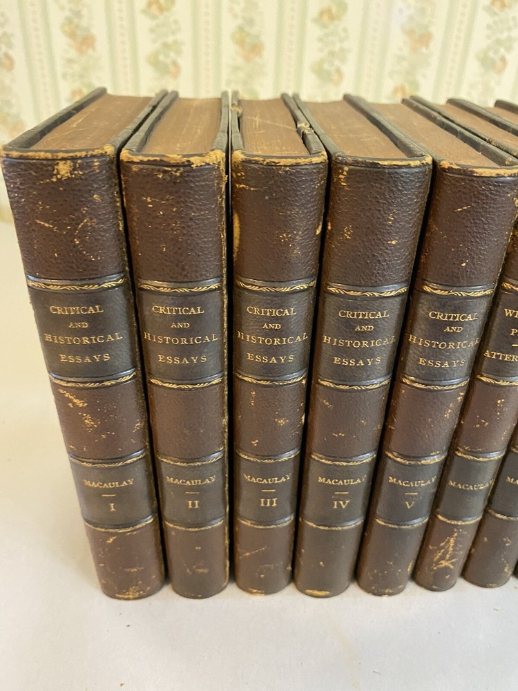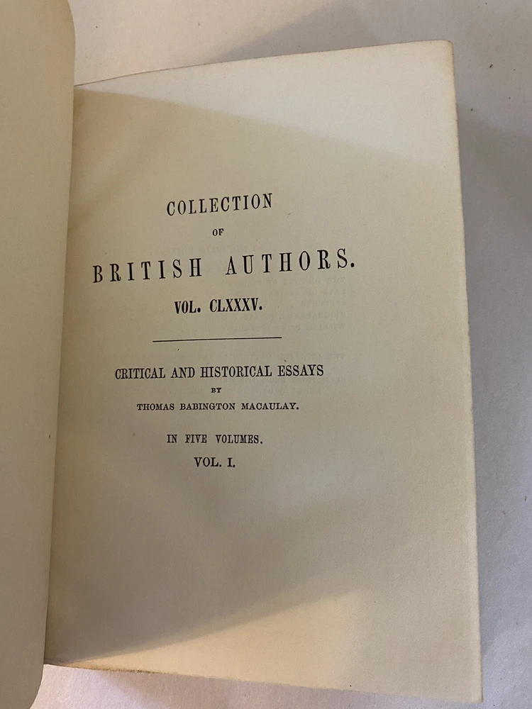 Elevate your collection with this rare and exquisite ensemble of Thomas Babington Macaulay's works. This offering includes a five-volume set of "Critical and Historical Essays" dated 1850 , along with four additional volumes, all part of the esteemed Bernhard Tauchnitz "Collection of British Authors" series. Each book is elegantly bound by McNamee Binder of Cambridge, Massachusetts , showcasing uniform craftsmanship and timeless appeal. Included Volumes: Critical and Historical Essays (5 Volumes, 1850) Macaulay's renowned essays covering a rich tapestry of historical events and literary critiques. William Pitt and Atterbury (1 Volume, 1860) Insightful essays delving into the lives and impacts of two pivotal British figures. Biographical Essays (1 Volume, 1857) A collection of compelling biographies highlighting Macaulay's sharp analytical prowess. Last Days of Ancient Rome with "Ivry" and "The Armada" (1 Volume, 1851) Stirring poems capturing monumental historical moments with vivid imagery and emotion. Speeches (Volume 1 of 2, 1853) A selection of Macaulay's influential speeches reflecting the political and social currents of his time. Note: Volume 2 is not included in this set. Features: Custom Binding: All volumes are uniformly bound by McNamee Binder, known for exceptional quality and durability, adding a cohesive and distinguished look to the collection. Historical Significance: Early editions ranging from 1850 to 1860 , offering a window into Victorian-era literature and thought. Literary Value: Macaulay's works are celebrated for their eloquence, depth, and enduring influence on historical and literary studies. Condition: Bindings: The spines are firm. There is some visible scuffs on the spines. The third volume has damage to the top of the boards. Please see photo four. Pages: There is some foxing on some of the title pages but the pages are in very good overall condition. Overall: The collection is in very good condition for its age, a testament to both the original craftsmanship and the care it has received. Why This Collection Stands Out: Collector's Gem: A rare find for enthusiasts of 19th-century literature, history buffs, and collectors of fine bindings. Cultural Artifact: Represents the transatlantic spread of English literature and the historical practices of publishing and bookbinding. Educational Treasure: An invaluable resource for deepening your understanding of historical events, literary critique, and political discourse of the era. Don't miss this unique opportunity to own a distinguished piece of literary history that embodies the richness of Victorian literature and the artistry of custom bookbinding. Please see the photos. For inquiries or additional photos, please feel free to contact me.