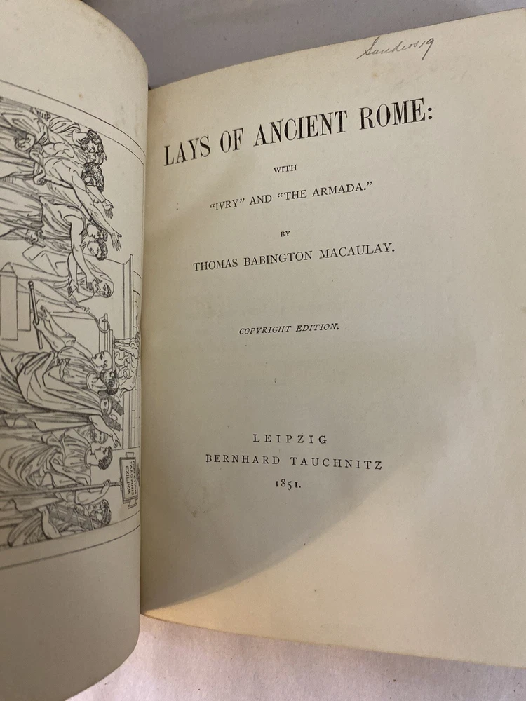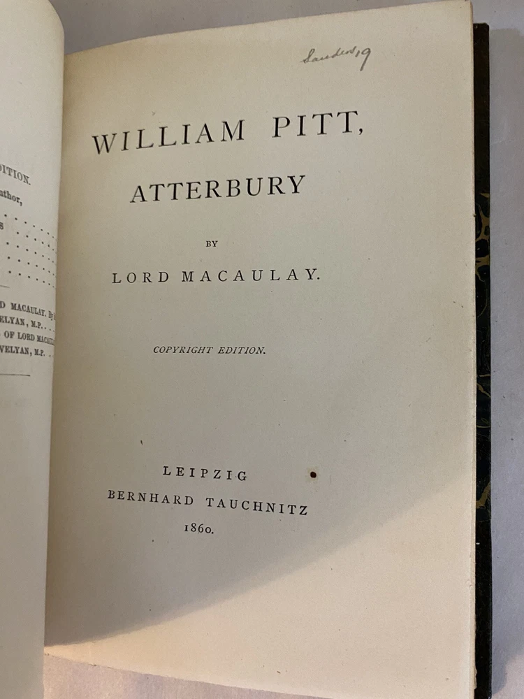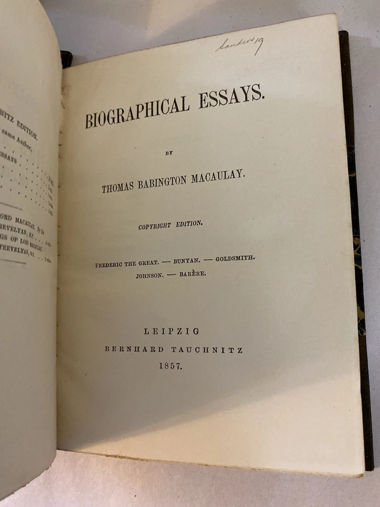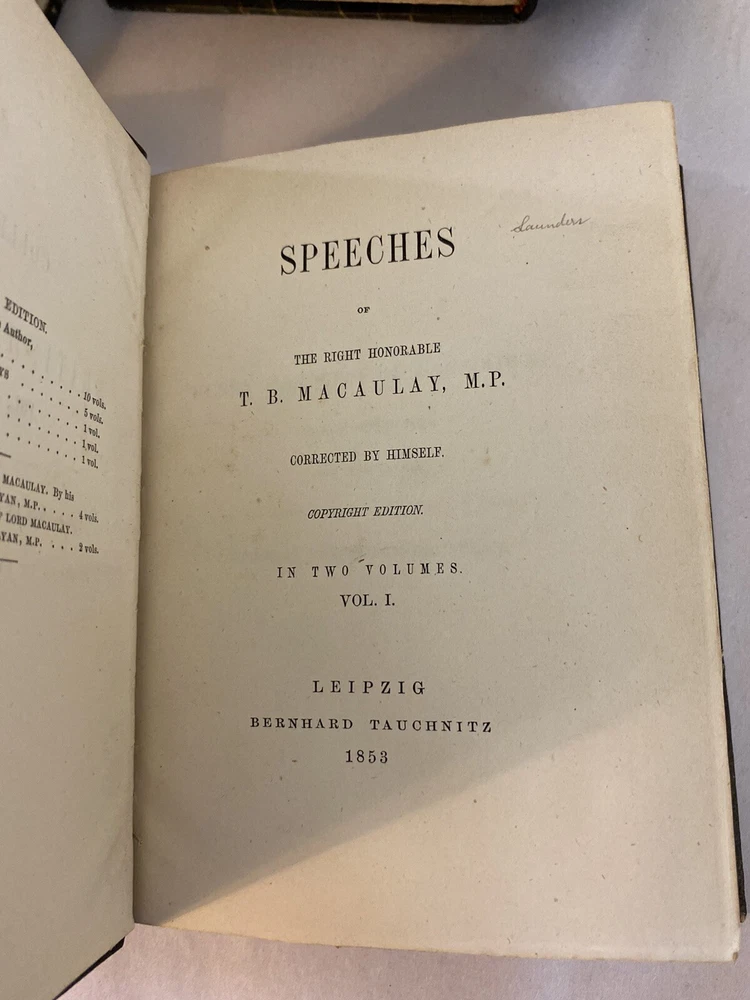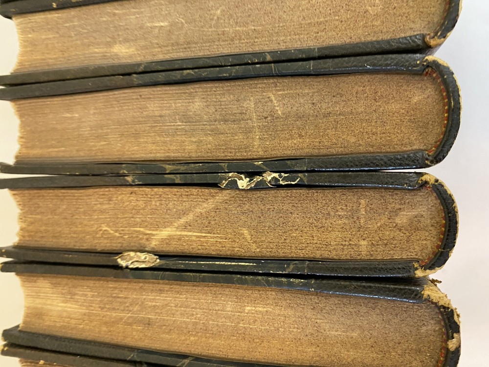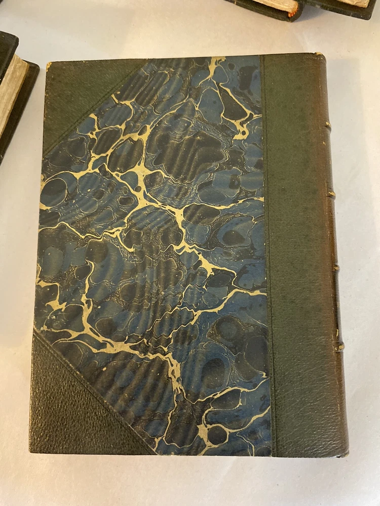 Elevate your collection with this rare and exquisite ensemble of Thomas Babington Macaulay's works. This offering includes a five-volume set of "Critical and Historical Essays" dated 1850 , along with four additional volumes, all part of the esteemed Bernhard Tauchnitz "Collection of British Authors" series. Each book is elegantly bound by McNamee Binder of Cambridge, Massachusetts , showcasing uniform craftsmanship and timeless appeal. Included Volumes: Critical and Historical Essays (5 Volumes, 1850) Macaulay's renowned essays covering a rich tapestry of historical events and literary critiques. William Pitt and Atterbury (1 Volume, 1860) Insightful essays delving into the lives and impacts of two pivotal British figures. Biographical Essays (1 Volume, 1857) A collection of compelling biographies highlighting Macaulay's sharp analytical prowess. Last Days of Ancient Rome with "Ivry" and "The Armada" (1 Volume, 1851) Stirring poems capturing monumental historical moments with vivid imagery and emotion. Speeches (Volume 1 of 2, 1853) A selection of Macaulay's influential speeches reflecting the political and social currents of his time. Note: Volume 2 is not included in this set. Features: Custom Binding: All volumes are uniformly bound by McNamee Binder, known for exceptional quality and durability, adding a cohesive and distinguished look to the collection. Historical Significance: Early editions ranging from 1850 to 1860 , offering a window into Victorian-era literature and thought. Literary Value: Macaulay's works are celebrated for their eloquence, depth, and enduring influence on historical and literary studies. Condition: Bindings: The spines are firm. There is some visible scuffs on the spines. The third volume has damage to the top of the boards. Please see photo four. Pages: There is some foxing on some of the title pages but the pages are in very good overall condition. Overall: The collection is in very good condition for its age, a testament to both the original craftsmanship and the care it has received. Why This Collection Stands Out: Collector's Gem: A rare find for enthusiasts of 19th-century literature, history buffs, and collectors of fine bindings. Cultural Artifact: Represents the transatlantic spread of English literature and the historical practices of publishing and bookbinding. Educational Treasure: An invaluable resource for deepening your understanding of historical events, literary critique, and political discourse of the era. Don't miss this unique opportunity to own a distinguished piece of literary history that embodies the richness of Victorian literature and the artistry of custom bookbinding. Please see the photos. For inquiries or additional photos, please feel free to contact me.