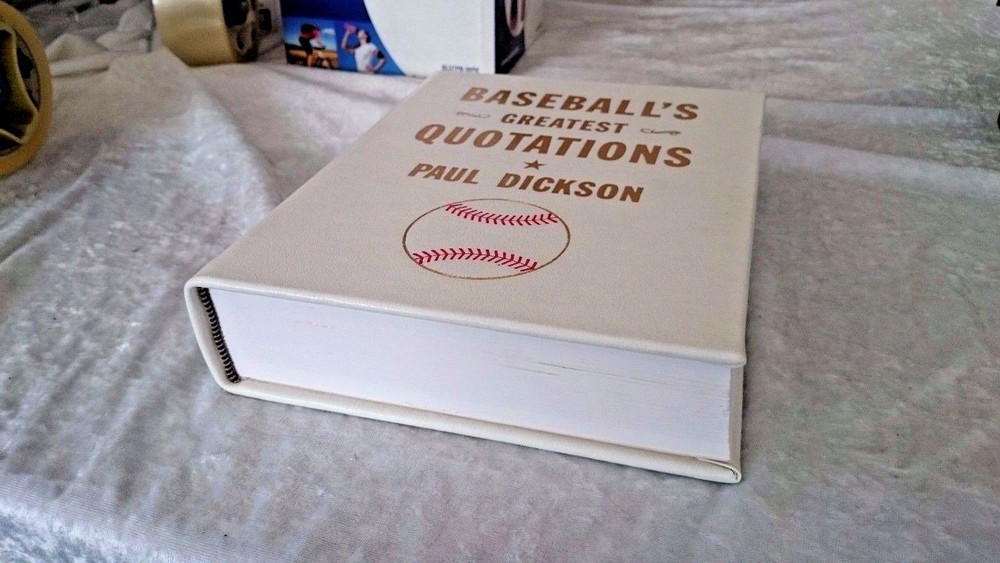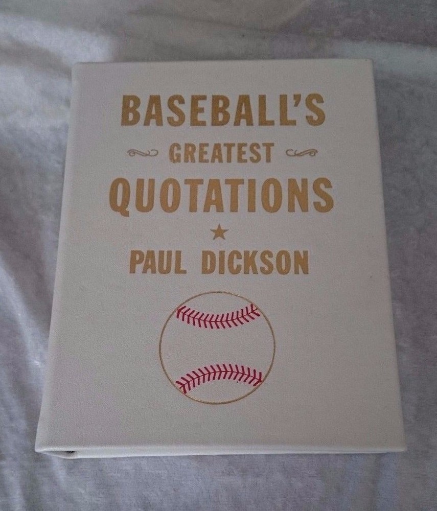 This traditional leather baseball book by author Paul Dickson has created a comprehensive reference guide to baseballs most fascinating and entertaining quotes on baseball. This beautiful baseball book is a must have for any baseball fan. This Limited edition of Paul Dickson’s “Baseball’s Greatest Quotations” makes a great unique gift for those who love both quotes on baseball and the ballpark alike. Size: 7" w x 9.5” h Bound by hand in traditional white leather Ships in 24 hours! Please be advised I do require immediate payment. I only ship internationally through eBay’s Global Shipping program. Please ask questions before bidding and not after. I take the same amount of time and care packing all items. If require specific domestic packing requirements or expedited mail please ask before bidding. I don't mind doing but will require extra money for variation in shipping requirement and/or materials. I will ONLY ship the purchased item to the registered address used upon payment. eBay does not cover items shipped to alternative address’s so I am unable to send to any other address. Thanks!