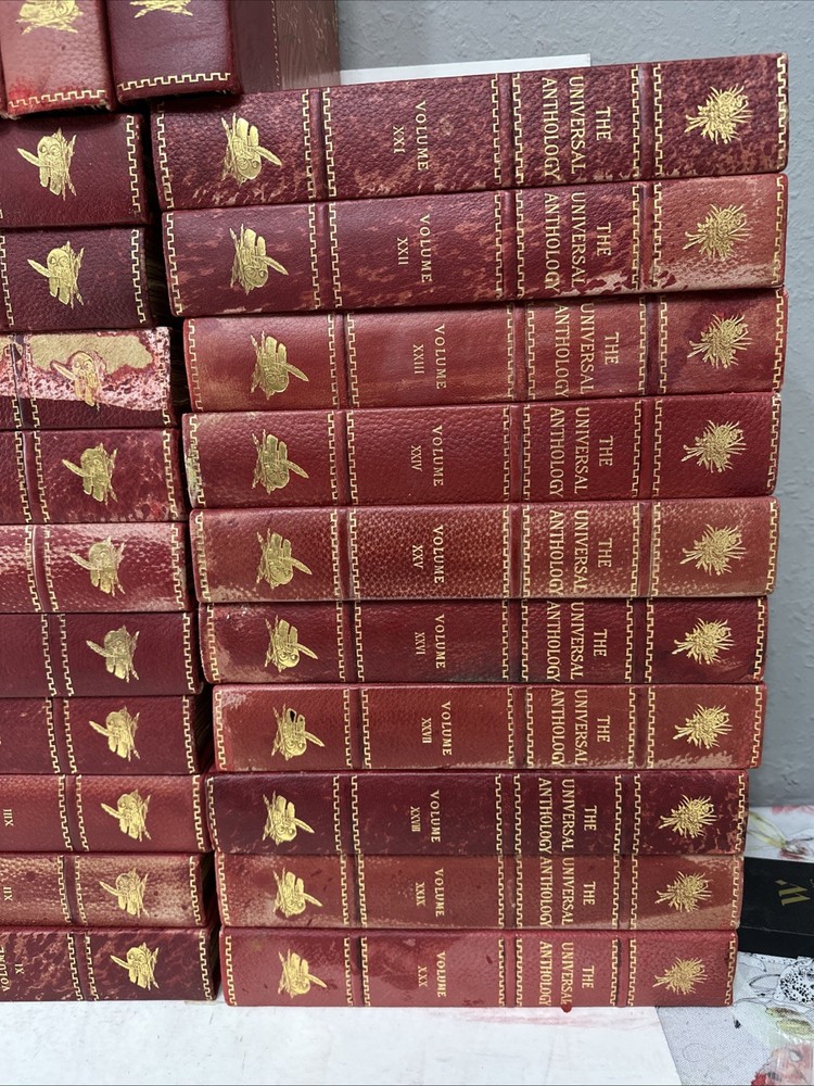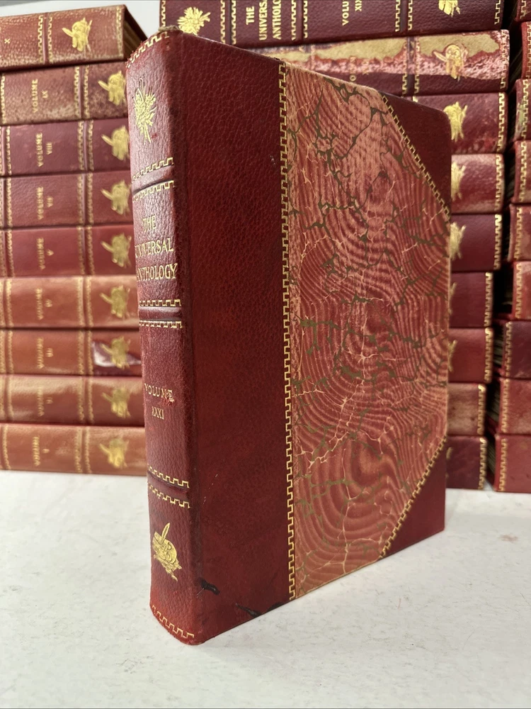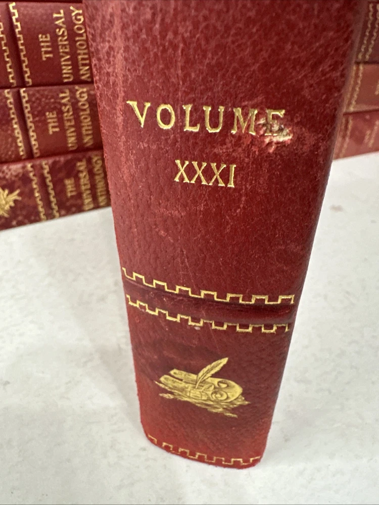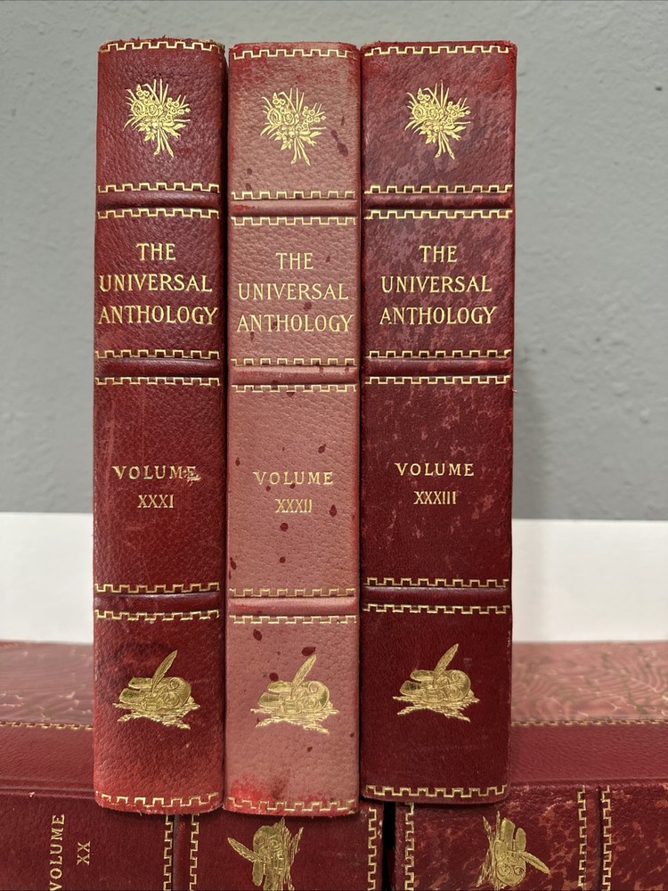 The Universal Anthology Edition De Grand Luxe Complete Numbered Set 192 of 500 Volume 1 thru 33 (volume 6 absent!!!!!!!!!!) Good condition Red leather bindings All Bindings are attached Gold Gilding Beautiful color illustrations throughout A Collection Of The Best Literature, Ancient, Mediaeval And Modern, With Biographical And Explanatory Notes. Edited By: -Richard Garnett Keeper of printed books at the British Museum, London 1851 to 1988 -Leon Vallee Librarian at the bibliotheque Nationale, Paris, Since 1871 -Alois Brandl Professor of literature in the imperial university of Berlin Published By: -The Clarke Company, Limited, London -Merrill & Baker, New York -Emile Terquem, Paris -Biblothek Verlag, Berlin Open to reasonable offers.