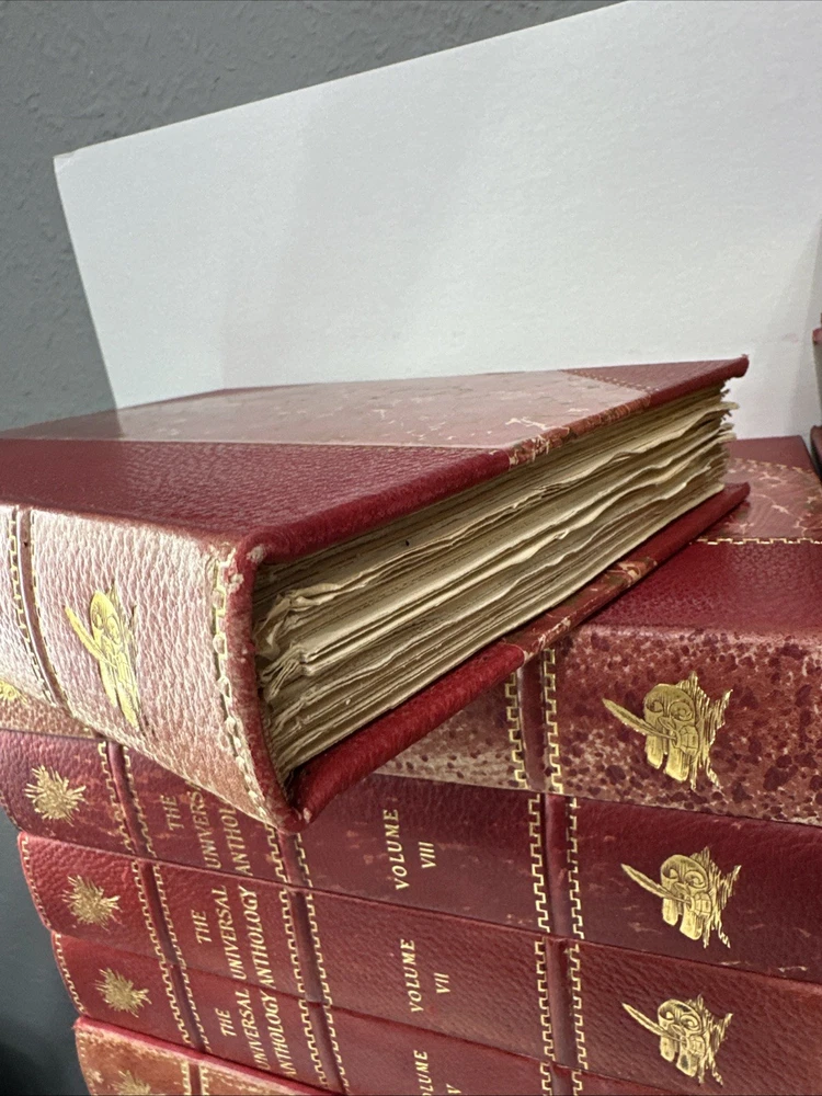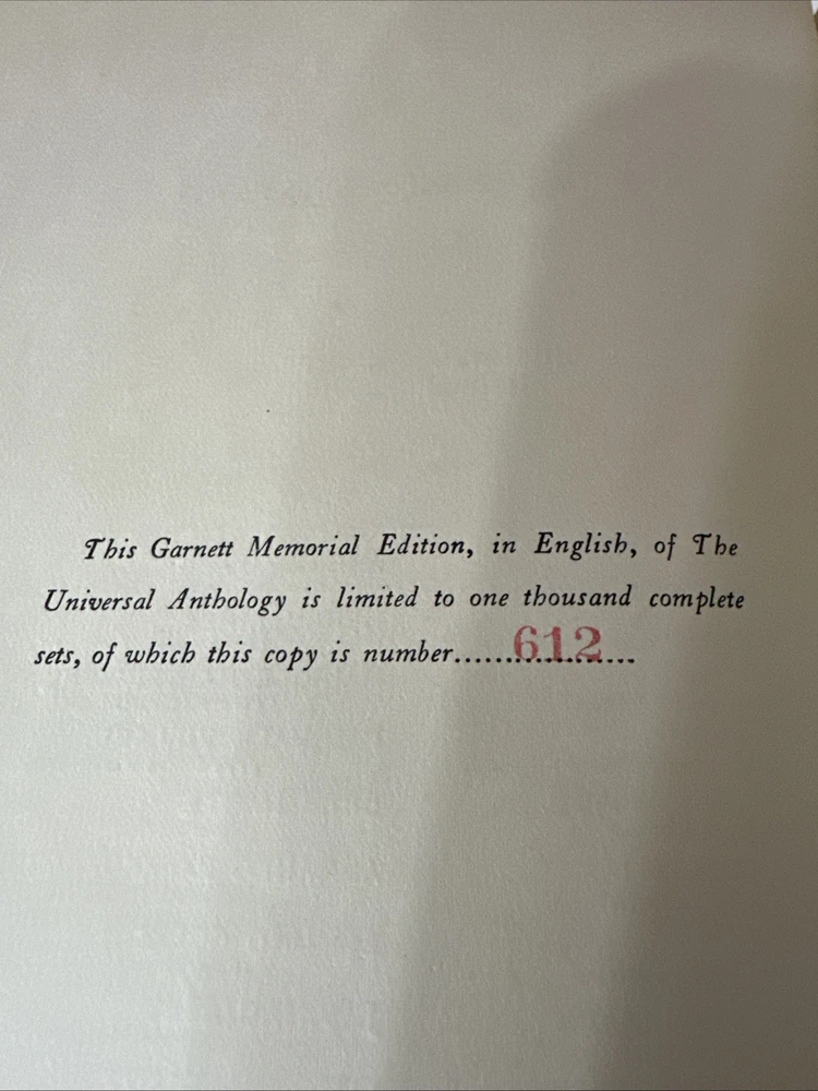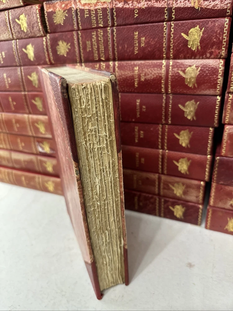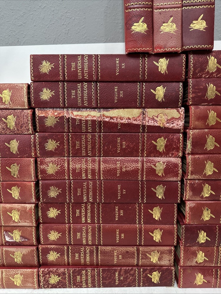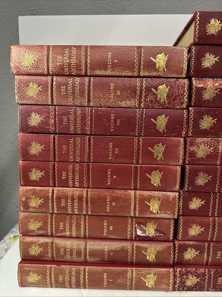 The Universal Anthology Edition De Grand Luxe Complete Numbered Set 192 of 500 Volume 1 thru 33 (volume 6 absent!!!!!!!!!!) Good condition Red leather bindings All Bindings are attached Gold Gilding Beautiful color illustrations throughout A Collection Of The Best Literature, Ancient, Mediaeval And Modern, With Biographical And Explanatory Notes. Edited By: -Richard Garnett Keeper of printed books at the British Museum, London 1851 to 1988 -Leon Vallee Librarian at the bibliotheque Nationale, Paris, Since 1871 -Alois Brandl Professor of literature in the imperial university of Berlin Published By: -The Clarke Company, Limited, London -Merrill & Baker, New York -Emile Terquem, Paris -Biblothek Verlag, Berlin Open to reasonable offers.