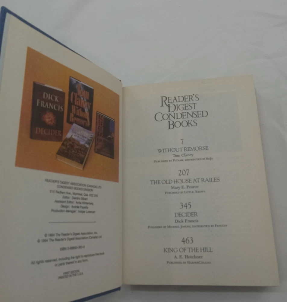 Delve into a treasure trove of classic literature with the 1994 edition of Reader’s Digest Condensed Books. This hardcover collection is a testament to the era's popular fiction, bound in rich leather with gilt edges that exude a sense of timeless elegance. The compilation features a variety of action, adventure, and mystery tales that will captivate both young adults and adults alike, offering an array of stories from the renowned Reader’s Digest Association. Every page turn takes you on a journey through narratives that have stood the test of time, all while enjoying the sophisticated charm of vintage literature. These books are a perfect addition to any collector's shelf or a cozy reading nook, providing hours of entertainment and a glimpse into the literary world of the 1990s.