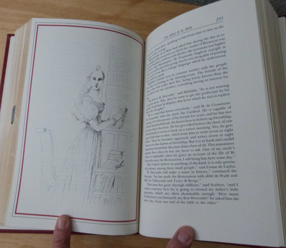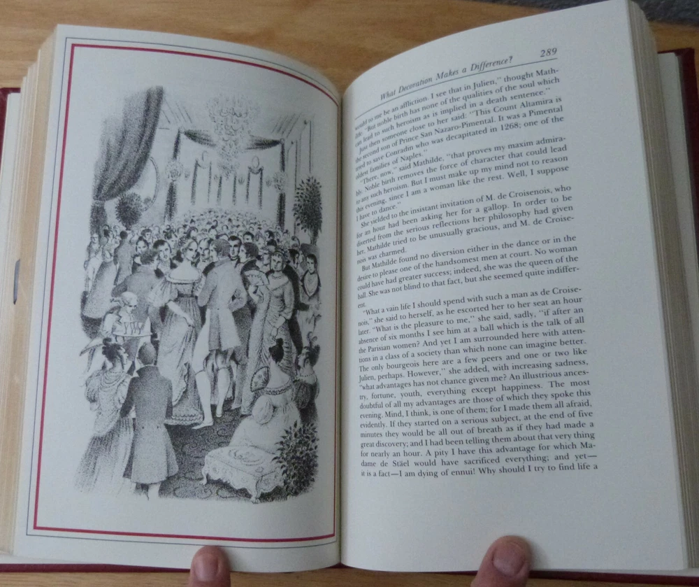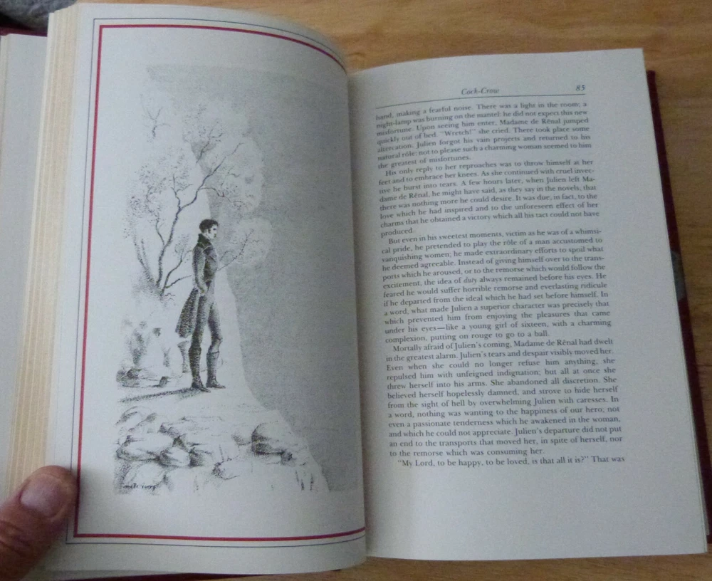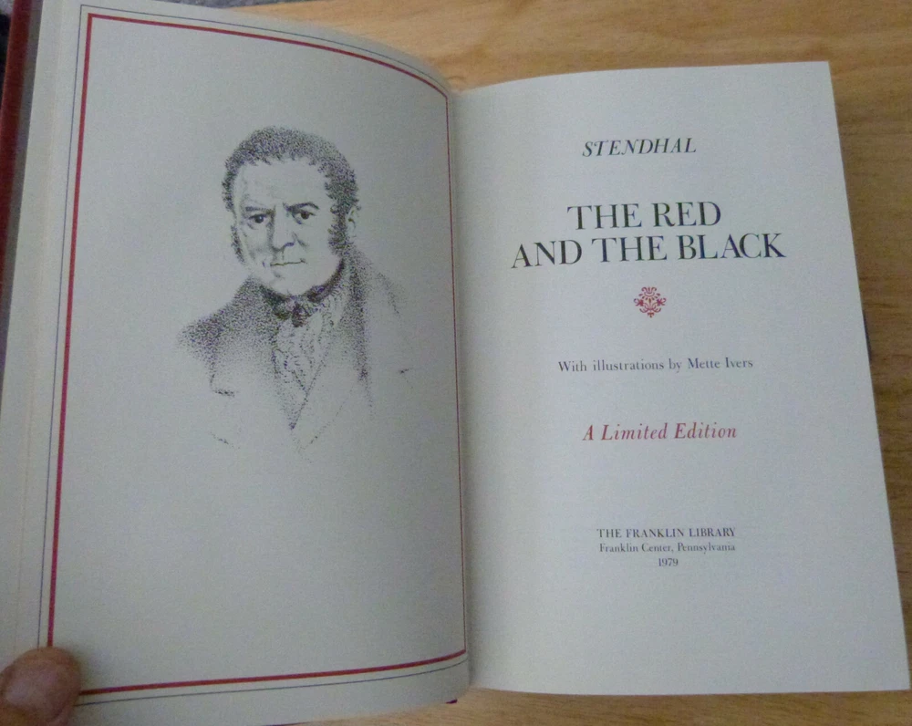 For sale, The Red And The Black, written by Stendhal, illustrated by Mette Ivers, published by Franklin Library, dated 1979. Red And The Black is part of the 100 Greatest Books of All Time and a Limited Edition printing. Red And The Black is a hardcover book with red leather covers, 22k gold design and writing on the covers, silk moire endpapers, sewn-in satin book mark, gold gilt page edges, 3 raised bands on the spine cover. 495 pages. Condition of the book is like new condition. I couldn't find any flaws to the covers, didn't notice any edge/corner bumping. Hinges are crisp and solid as if the book hasn't been open before. Binding is tight. No bookplate or unwanted writing. Buyer pays $6.00 domestic USPS media mail shipping. International shipping available through the global shipping program. Payment is through the ebay managed payment system. Please email me if you have any questions. Thanks for looking.