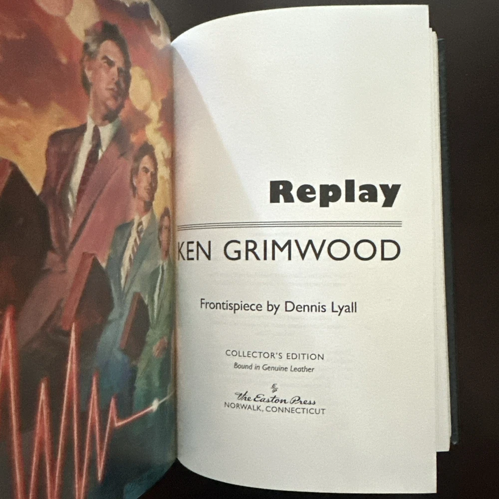 Replay by Ken Grimwood. This book is from Easton Press and is part of their “A Matter of Time” series. The book is a collectors edition with leather bounding and in great shape.