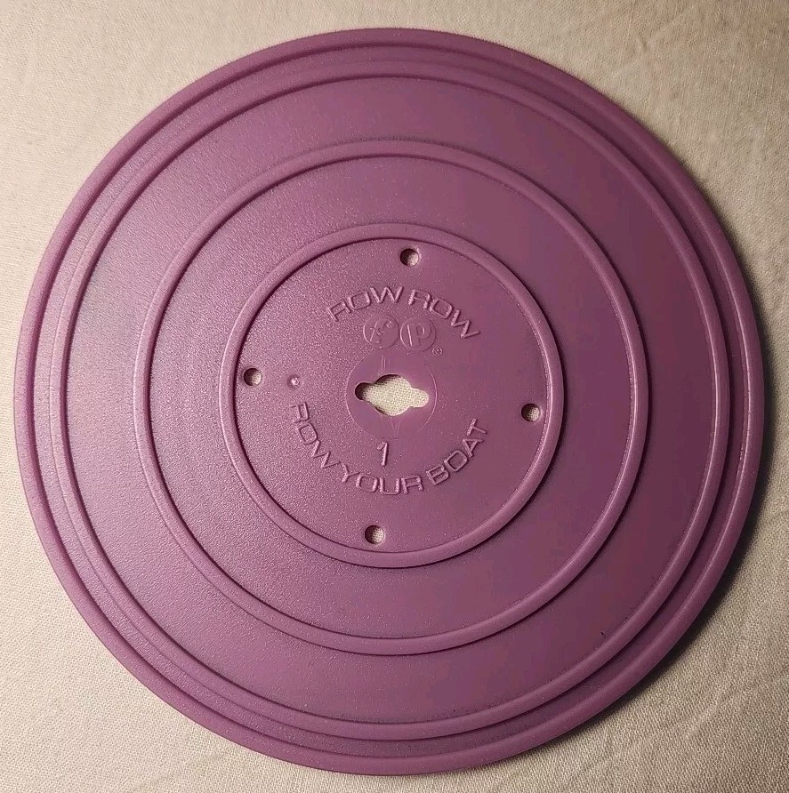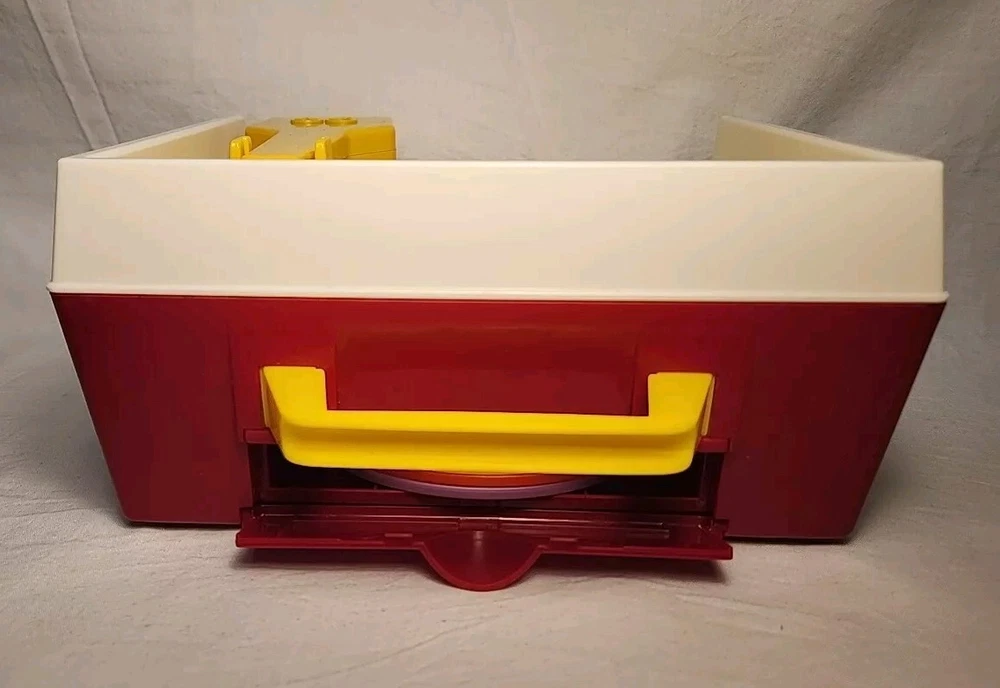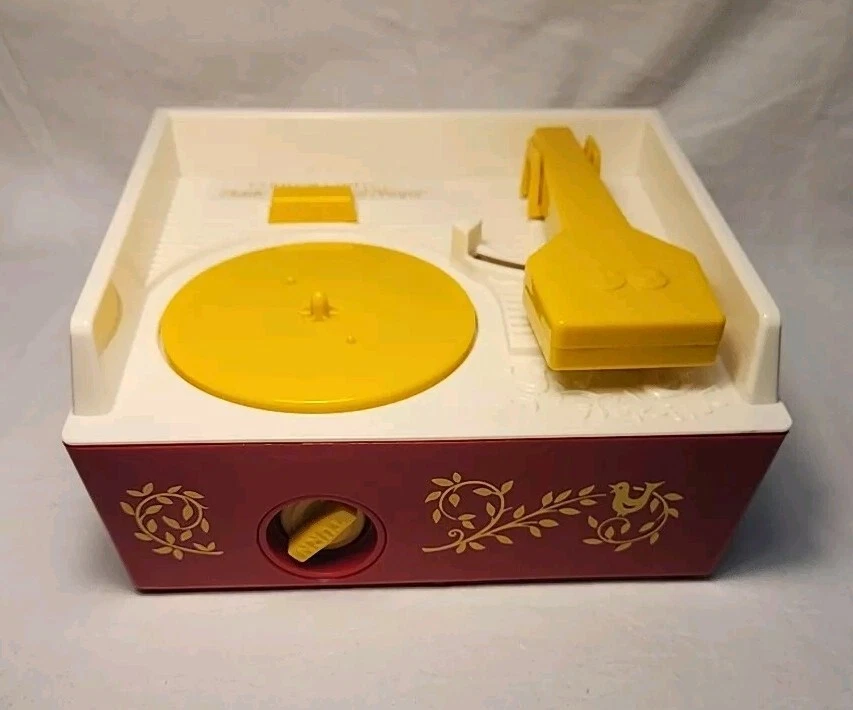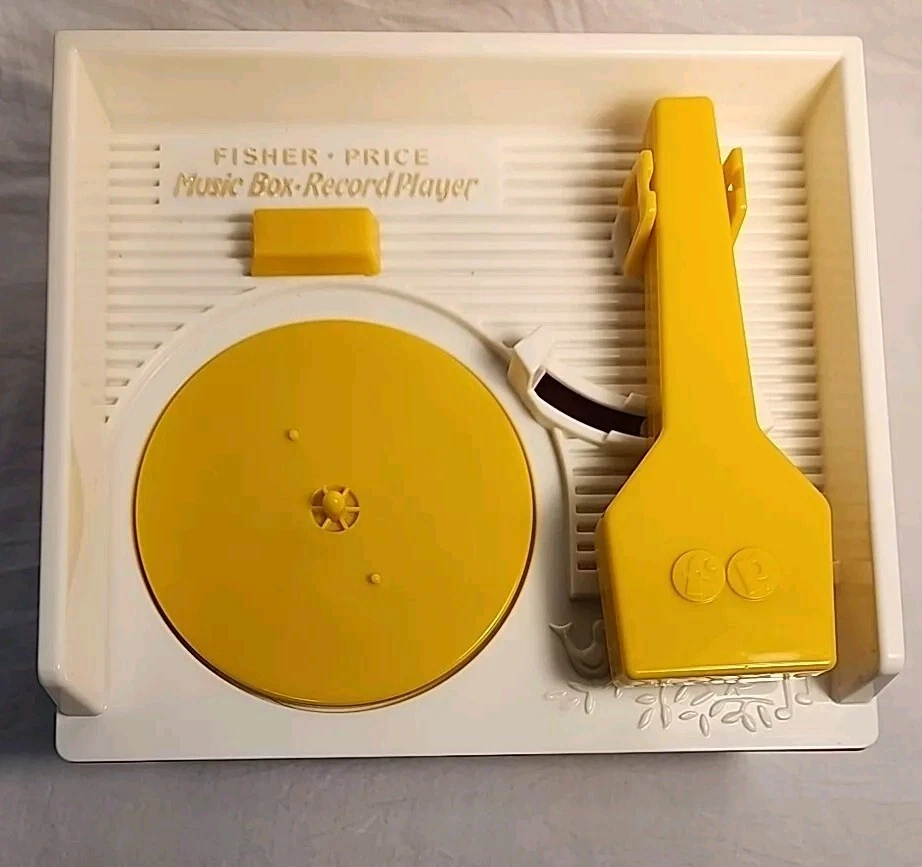 This is a retro 2014 Fisher-Price music box record player that comes with four records. It has been tested and is in working condition. The brand is Fisher-Price and it is a type of music box. The music box record player is part of the Character Family category and was manufactured in the United States.