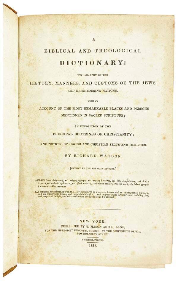 A Biblical and Theological Dictionary: Explanatory of the History, Manners, and Customs of the Jews, and Neighbouring Nations. With an Account of the Most Remarkable Places and Persons Mentioned in Sacred Scripture; an Exposition of the Principal Doctrines of Christianity; and Notices of Jewish and Christian Sects and Heresies Author: Richard Watson Title: A Biblical and Theological Dictionary: Explanatory of the History, Manners, and Customs of the Jews, and Neighbouring Nations. With an Account of the Most Remarkable Places and Persons Mentioned in Sacred Scripture; an Exposition of the Principal Doctrines of Christianity; and Notices of Jewish and Christian Sects and Heresies Publication: New York: Published by T. Mason and G. Lane, 1837 Description: Very Good. New York: Published by T. Mason and G. Lane, 1837. Revised Later Edition. Octavo. 1003 pp. Five fold-out maps. Bound in full sheep; four raised bands and red leather title label to spine. Boards worn with brief exposure and some flaking; couple chips and black discoloration to rear. Binding sound. Bookplate of two former owners to front pastedown; brief tape remnants and moderate spotting to endpapers; marginal spotting to interior but legible throughout; maps toned and chipped along edges, overall a Very Good and relatively well-preserved copy. Seller ID: 30149 Subject: 19th Century, Americana, Ancient World, Maps / Cartography / Geography, Middle East, Religion / Theology Capitol Hill Books is a used bookstore located on historic Capitol Hill in Washington DC, with three floors of quality used books, first editions, and rare books. [Note: Our online inventory is stored and managed at a separate location from at our brick and mortar shop. If you have a question about an item listed online, please send a direct message here rather than calling the store so that we can make sure someone familiar with the item in question can respond.] Terms Books described only as First Editions are First Printings unless otherwise specified. All items are guaranteed to be as described or they may be returned within 30 days of receipt for a full refund. All orders ship within two business days. Standard mail is USPS Media Mail. Expedited and international shipping are also available (please contact for estimates). We offer combined shipping on multiple orders. This listing was created by Bibliopolis.