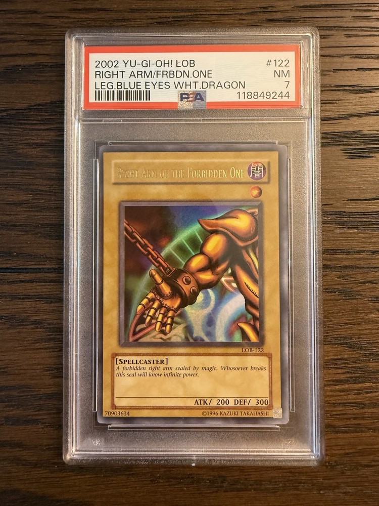 Dive into the world of Yu-Gi-Oh! TCG with the iconic "Right Arm of the Forbidden One" card, a staple from the Legend of Blue Eyes White Dragon set. As a pivotal piece for collectors and players alike, this Ultra Rare card showcases Exodia in its holo glory, featuring the card number LOB-122 and boasting an attack power of 200 with a defense strength of 300. Crafted by Konami, this English-language card is a must-have for those seeking to enhance their gameplay or complete their collection. The card is of the Normal type, with an Unlimited feature, and it hails from the United States. Suitable for ages 6 and up, it's a standout addition to any game with its Dark attribute and the formidable might of its creature/monster type.