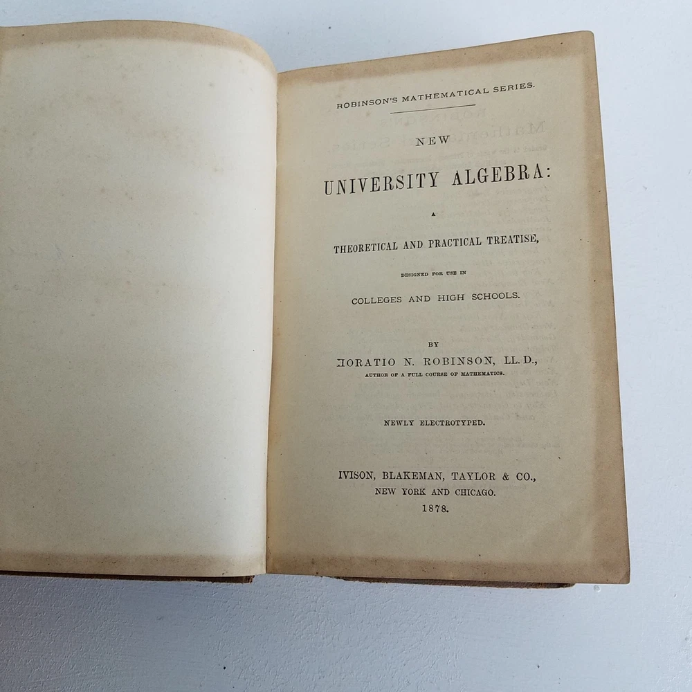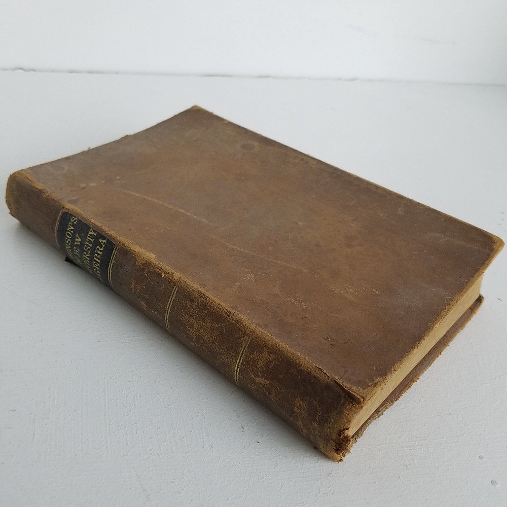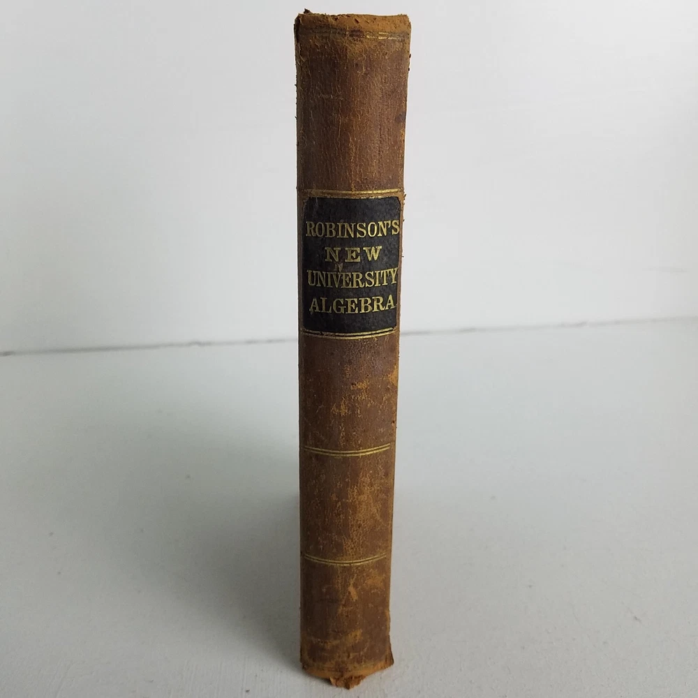 Robinson's New University Algebra published by Ivison, Blakeman & Taylor in 1875. Part of the Robinson College Mathematics series. Leather Bound. In good condition with a tight binding, clean pages and leather cover with a slight outward bend in the top cover. Some writing on the flyleafs, but the pages are in good shape.