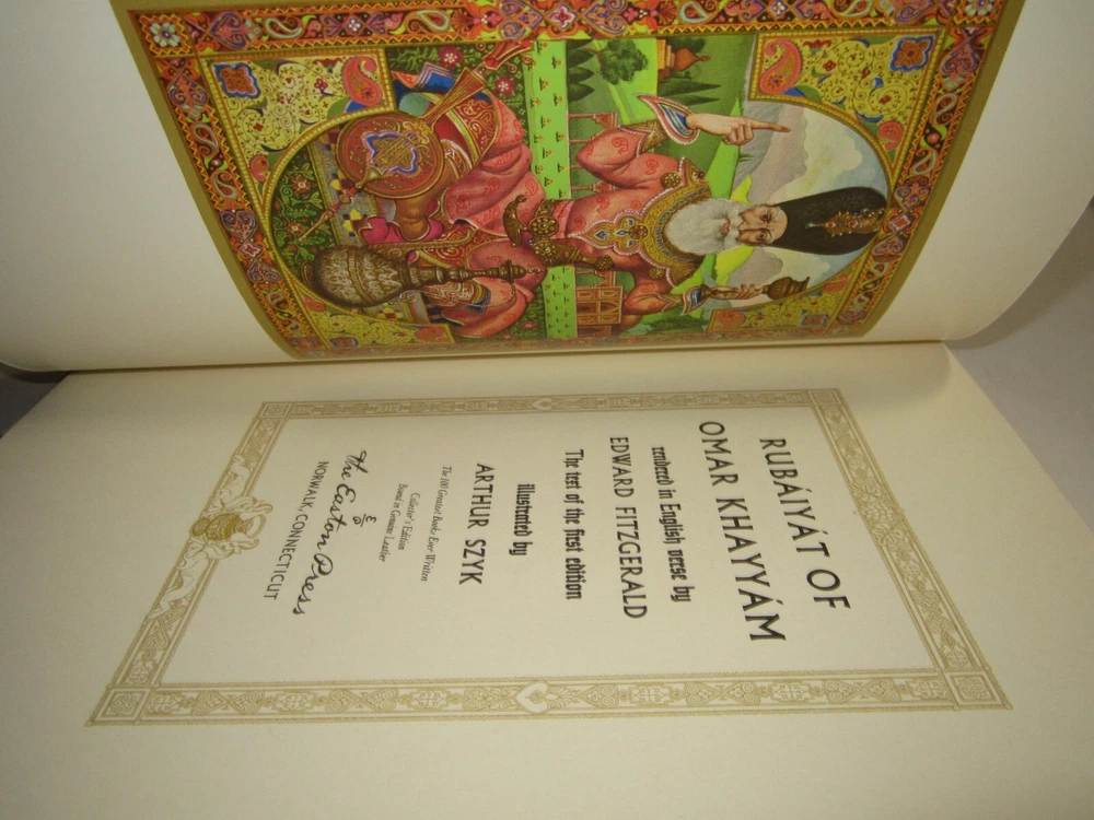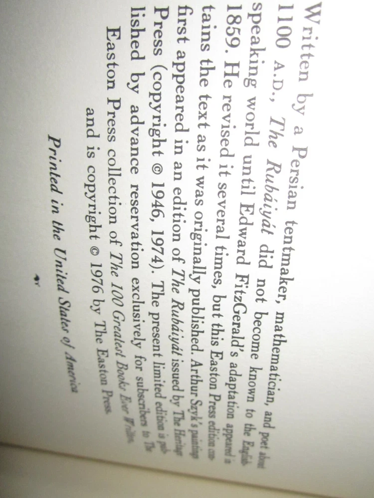 Rubaiyat of Omar Khayam 100 Greatest Book Collectors Edition Easton Press HC NM Leather in excellent condition like new but does have the previous owners bookplate attached to the inside front cover, you will receive the one in the pictures. This will be shipped within 24 hours of receiving cleared payment or local pickup is available and I also combine shipping but do not pay until I send you a updated combined shipping invoice. NJ Residents sales tax will be added at checkout I have alot of Easton Press Books listed so if you see a few you want not only will I combine shipping I will give you a additional discount for multiple purchases so message me with the books you want and I will reply with the discount