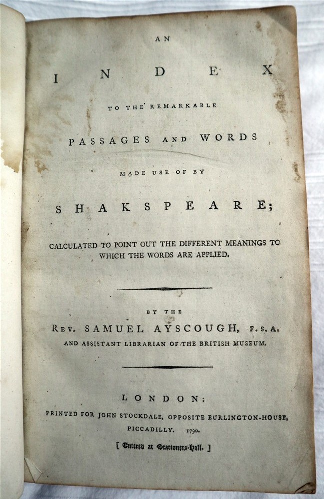 L U I S P O R R E T T A F I N E ARTS & A N T IQ U E S RARE & INTERESTING BOOKS ANTIQUES / PAINTINGS / ENGRAVINGS / CHINA & GLASS / ART RESTORATION SAMUEL AYSCOUGH Remarkable Passages In Shakespeare 1st 1790 Edition Full Calf Ayscough, Samuel :AN INDEX TO THE REMARKABLE PASSAGES AND WORDS MADE USE OF BY SHAKESPEARE, CALCULATED TO POINT OUT THE DIFFERENT MEANINGS TO WHICH THE WORDS ARE APPLIED. Published in London in 1790, 1st Edition. ,9" x 6". Published by John Stockdale. Bound in full tan calf, edges rubbed, gilt titles and decoration, text block very good, clean and tight. Not a common titles in this First Edition. Many thanks for your business! To ensure that we have a problem free business transaction, please briefly review the notes below. Thank you! PLEASE READ OUR SHIPMENT AND PAYMENT TERMS BEFORE BUYING OR BIDDING We are Canadian dealers and delivery of items takes longer than if mailed in the US. For example, a heavy item sent via Expedited Mail may take up to ten WORKING days to arrive (14 days) , which given our in store clearance may take two weeks or more to arrive. Please be aware of this when you buy, or when you bid. We always SUBSIDISE our shipping costs which are CLEARLY stated in our advertisements. Canada Post is far more expensive compared to USPS, so before you buy or bid, please be sure that you are aware of shipping costs. WHEN REGISTERING FEEDBACK PLEASE BE AWARE OF THESE ISSUES - MANY THANKS! WE ACCEPT PAYPAL, PAYPAL WITH CREADIT CARDS, OR CREDIT CARDS AT OUR OWN SECURE SERVER •Shipping within North America is by Expedited Flat Rate Shipping Service •Payment should be made within three days of the end of the auction. We reserve the right to cancel any transactions not paid for within the three day limit •We amalgamate shipping for greater economy - so feel free to buy until it hurts! •We offer a full refund ONLY FOR ITEMS NOT AS DESCRIBED. Any items lost in the mail will be covered by our refund guarantee AFTER a Post Office search. The refund will not include the mailing costs. CANADIAN CLIENTS - Please note: GST & PST, or HST will be applied as appropriate to your Province. International Buyers – Please Note: Import duties, taxes and charges are not included in the item price or shipping charges. These charges are the buyer’s responsibility. Please check with your country’s customs office to determine what these additional costs will be prior to bidding/buying Track Page Views With Auctiva's Counter