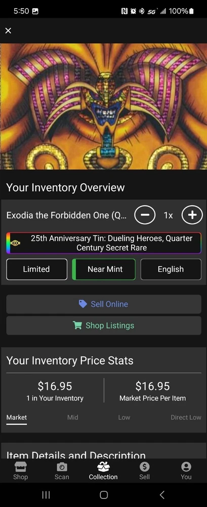 This limited edition Exodia the Forbidden One card is a must-have for any Yu-Gi-Oh! TCG collector. With a Dark color attribute and Spellcaster creature/monster type, this card features an Attack/Power of 1000 and Defense/Toughness of 1000. The card is part of the 25th Anniversary Tin: Dueling Heroes set and has a Quarter Century Secret Rare rarity. This English language Effect card is manufactured by Konami and has the card number TN23-EN002. It is a perfect addition to any collection and is sure to impress any Yu-Gi-Oh! fan. Don't miss out on the opportunity to own this rare and sought-after card.