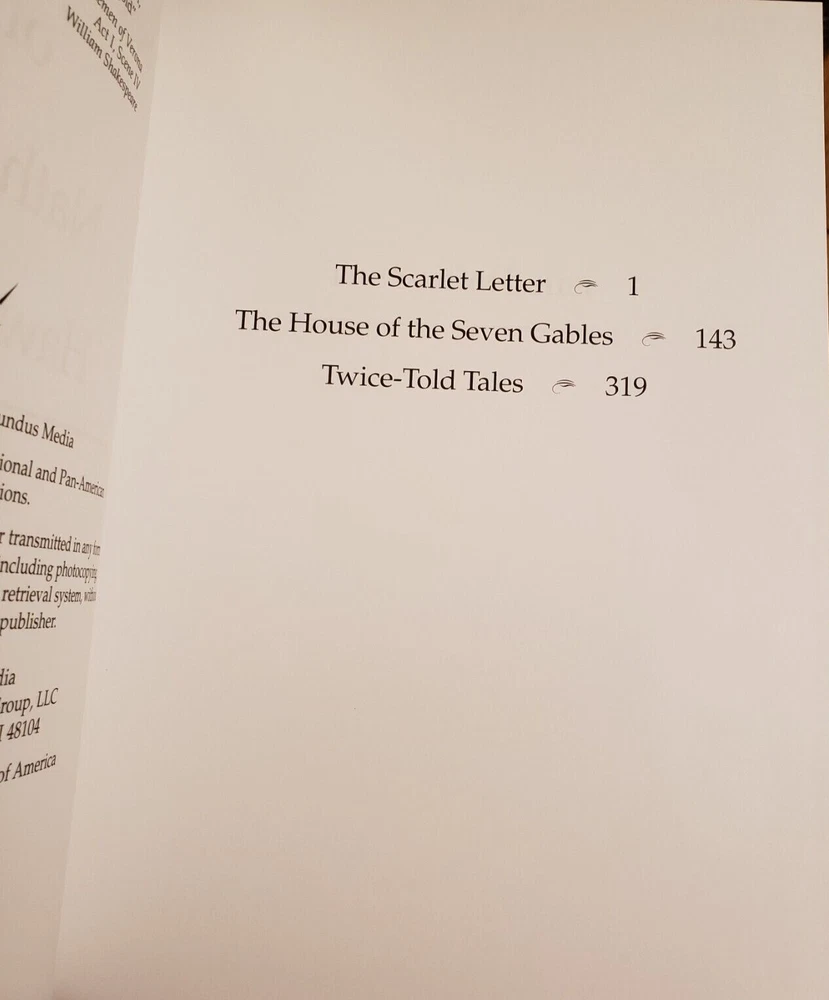 SELECTED WORKS OF NATHANIEL HAWTHORNE (Leather bound, 2002 Mundus Media, Very Good). Beautiful black leather bound collector's edition with gilded lettering and border. Contains: The Scarlet Letter The House of the Seven Gables Twice-Told Tales