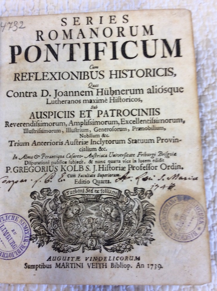 SERIES ROMANORUM PONTIFICUM, CUM REFLEXIONIBUS HISTORICIS... (bound with) SERIES EPISCOPORUM ARCHIEPISCOPORUM ET ELECTORUM. MOGUNTINORUM, TREVIRENSIUM ET COLONIENSIUM By Gregor Kolb, S.J. Description: Augsburg: Martini Veith, 1739. Second Edition. Hardcover. Full calf. 6 3/4" x 8 1/4". 393p. + chronological table and index + 287p. + index. Book in very good condition. Top of spine chipped. Spine lightly abraded. Corners bumped. Some foxing within. Otherwise, a clean and tight book in very good condition. Engraved frontispiece in each of the two works. Two historical reference works bound in one volume. The first series offers brief biographical sketches of the Catholic Popes, a chronological table, and a comprehensive index. The second series offers brief biographical sketches of bishops, archbishops, and electors from Mainz, Trier, and Cologne. Text in Latin. This book is offered by Kubik Fine Books Ltd. Established in 1985, our store is in Dayton, Ohio, and specializes in rare/antique books of all types, with a special emphasis on history and theology. All items are guaranteed to be as described and can be returned for a full refund. Autograph material is guaranteed in perpetuity to be authentic. ORDER ADDITIONAL BOOKS AND SAVE! We will combine shipping on multi-book purchases. For shipments within the USA, shipping is $2.00 per book for each additional one purchased. Orders must be paid for at the same time. A FEW WORDS ON SHIPPING: Our shipping charges may be higher than other sellers. That's because we have a dedicated shipping employee and take care to make sure your orders are well-protected. Every item is wrapped in bubble-wrap; in addition, every order which sells for over $10 is shipped in a sturdy cardboard box with cushioning materials. Over 95% of our orders are shipped within one business day of when we receive payment. If you buy it tonight, it's en route tomorrow!