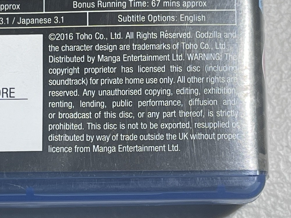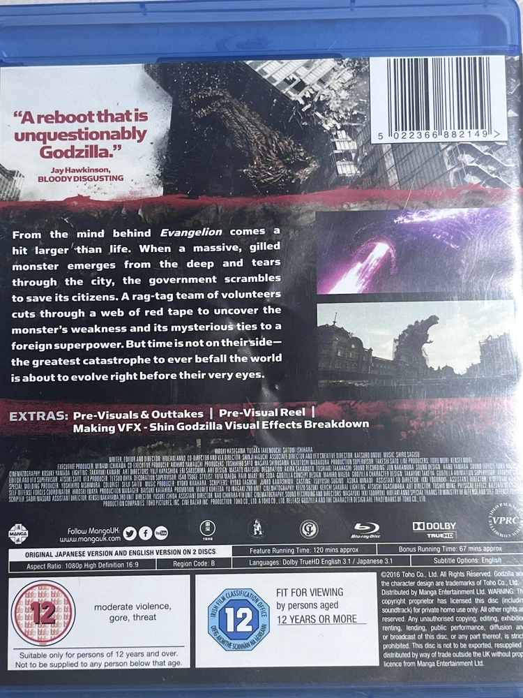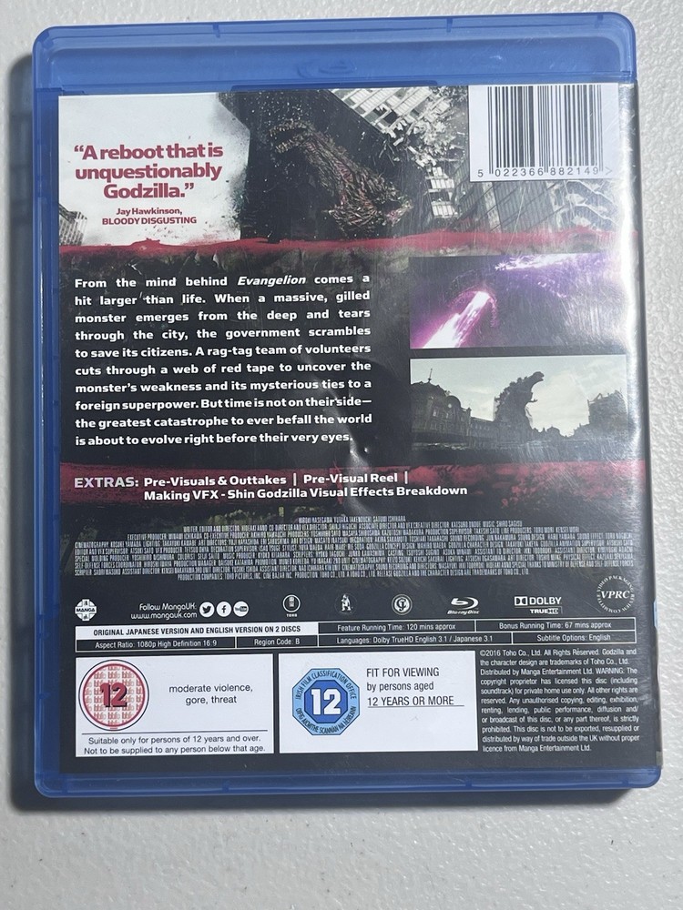 Not USA unless proper equipment. The SHIN GODZILLA Blu Ray 2 Disc set Shin Godzilla - A god incarnate. A city doomed. Original Japanese version and English version on two discs 67 minutes of bonus time Extras: pre-visuals and outtakes, pre-visual reel, making VFX shin Godzilla visual effects breakdown Irish film classification Office 12 SHIN GODZILLA Blu Ray 2 Disc Region B Original Japanese & English Versions AI: includes both the original Japanese and English and Japanese versions of the 2016 movie. This action-packed fantasy film, directed by Toho, features a wide array of creatures and monsters in a captivating cinematic movement. The Blu-Ray format and Region B compatibility make it perfect for European, Australian, New Zealand, African, and other regions. Perfect for fans of Japanese monster movies looking for a high-quality viewing experience of this cult classic.