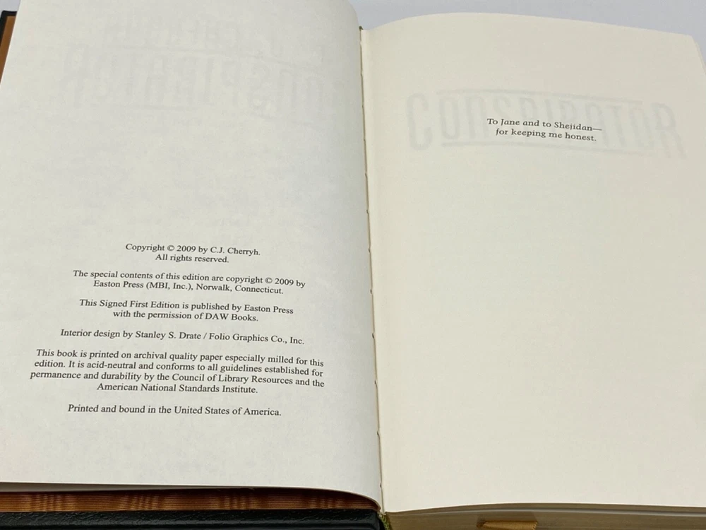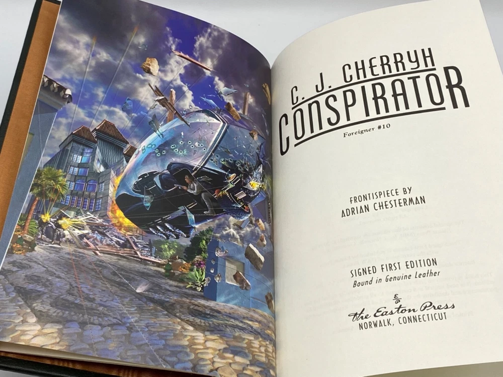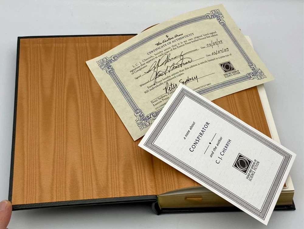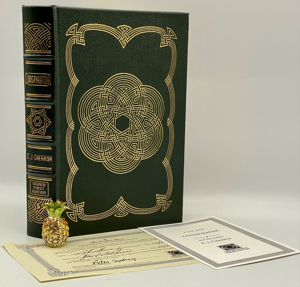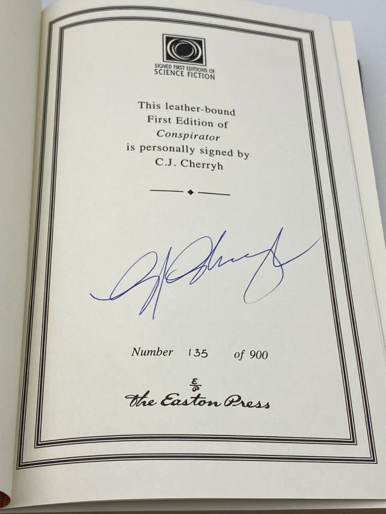 MAKES THE PERFECT GIFT FOR ANY FAN OF SCIENCE FICTION / FANTASY / C.J. CHERRYH ** PLEASE READ : Mahalo for taking the time to look at our listing. We truly appreciate it. We always do our BEST to give you the most accurate description of these beautiful books. If, however, you have any SPECIFIC questions about the SIZE of the book, NUMBER of pages, TYPE of leather, SMELL or FEEL of the book, PLEASE email us through EBay’s mail system BEFORE you bid, and we will be HAPPY to give you more information. We want you to be completely happy with your purchase and keep you as our customers for years to come!** DESCRIPTION: Easton Press’s full leather, long OUT OF PRINT, SIGNED FIRST EDITION of CONSPIRATOR by C.J. CHERRYH (#135/900). THIS IS A VINTAGE HEIRLOOM EASTON WITH LAVISH GILT IMPRESSIONS TO THE BOARDS AND SPINE with A BEAUTIFUL FRONTISPIECE. IT IS ONE OF THE MOST HIGHLY-PRIZED EDITIONS OF THIS CLASSIC SCIENCE FICTION NOVEL. CERTIFICATE OF AUTHENTICITY AND NOTECARD ARE INCLUDED . 🍍 NOT INCLUDED… 😃 ABOUT THE BOOK: First in a brand-new "Foreigner" trilogy from Hugo Award winning author C. J. Cherryh. Cajeiri is the young son of the powerful leader of the Western Association-and he has become a target for forces bent on destroying his father's rule. For Cajeiri is the first "ateva" youth to have lived in a human environment. And after hundreds of years of fragile atevi-human coexistence, he may very well be the first of his people to ever truly understand the so similar-yet so dangerously different-aliens who share his home planet and threaten the hidebound customs of his race. Description Description CONDITION: Book is in LIKE NEW condition for its age with only a few negligible rubs to the gilt page ends (SEE PICS FOR FURTHER DETAILS) NO ATTACHED BOOKPLATES, WRITING FROM PREVIOUS OWNER, ETC. It is a BEAUTIFUL EDITION. FREE shipping TO US ADDRESSES ONLY. INTERNATIONAL $ based on location. WE SHIP PRIORITY MAIL & PACK VERY WELL. Please check out our other listings of Easton Press, Franklin Library, Limited Editions Club, Heritage Press, Folio Society, International Collectors Library, and First Edition Library editions. WE DO COMBINE SHIPPING IF YOU PURCHASE MORE THAN ONE COPY. Mahalo for looking at our listings! By bidding/purchasing this item, you are helping a very grateful family who sends you our WARMEST ALOHA & MAHALO!