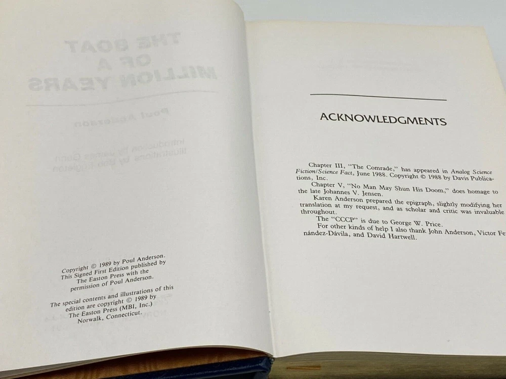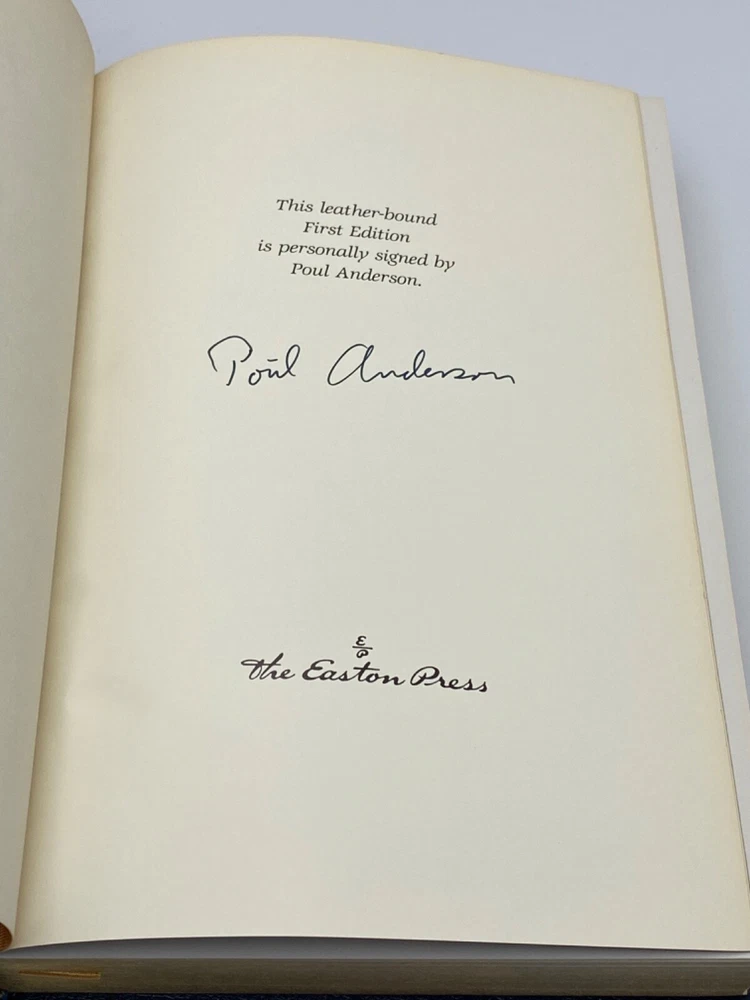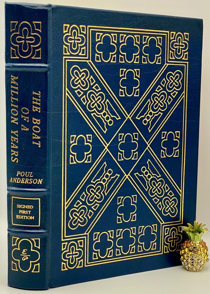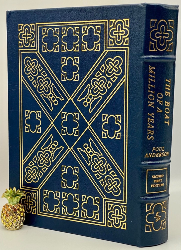 MAKES THE PERFECT GIFT FOR ANY FAN OF VINTAGE SCIENCE FICTION / POUL ANDERSON ** PLEASE READ : Mahalo for taking the time to look at our listing. We truly appreciate it. We always do our BEST to give you the most accurate description of these beautiful books. If, however, you have any SPECIFIC questions about the SIZE of the book, NUMBER of pages, TYPE of leather, SMELL or FEEL of the book, PLEASE email us through EBay’s mail system BEFORE you bid, and we will be HAPPY to give you more information. We want you to be completely happy with your purchase and keep you as our customers for years to come!** DESCRIPTION: Easton Press full-leather binding, part of the SIGNED FIRST EDITION of THE BOAT OF A MILLION YEARS, PERSONALLY SIGNED by POUL ANDERSEN. THIS IS A SCARCE VINTAGE HEIRLOOM EASTON WITH LAVISH DEEP GILT IMPRINTS TO THE BOARDS AND SPINE with A BEAUTIFUL FULL-COLOR ILLUSTRATION. IT IS ONE OF THE MOST HIGHLY-PRIZED EDITIONS OF THIS CLASSIC SCIENCE FICTION NOVEL. 🍍 NOT INCLUDED... 😃 THESE SIGNED EDITIONS ARE GETTING MORE SCARCE TO FIND AS TIME GOES ON DUE TO ANDERSON’S UNFORTUNATE PASSING IN 2001. ABOUT THE BOOK: Others have written SF on the theme of immortality, but in The Boat of a Million Years , Poul Anderson made it his own. Early in human history, certain individuals were born who live on, unaging, undying, through the centuries and millenia. We follow them through over 2000 years, up to our time and beyond-to the promise of utopia, and to the challenge of the stars. A milestone in modern science fiction, a New York Times Notable Book on its first publication in 1989, this is one of a great writer's finest works. CONDITION: Book is in LIKE NEW condition for its age with only a few negligible rubs to the gilt page ends (SEE PICS FOR FURTHER DETAILS). NO WRITING FROM PREVIOUS OWNER, ETC. It is a BEAUTIFUL EDITION. SHIPPING: FREE TO US ADDRESSES ONLY. INTERNATIONAL $ based on location. WE SHIP PRIORITY MAIL & PACK VERY WELL. Please check out our other listings of Easton Press, Franklin Library, Limited Editions Club, First Edition Library, Folio Society, Heritage Press, and International Collectors Library editions. WE DO COMBINE SHIPPING IF YOU PURCHASE MORE THAN ONE COPY. Mahalo for looking at our listings! By bidding/purchasing this item, you are helping a very grateful family who sends you our WARMEST ALOHA & MAHALO!