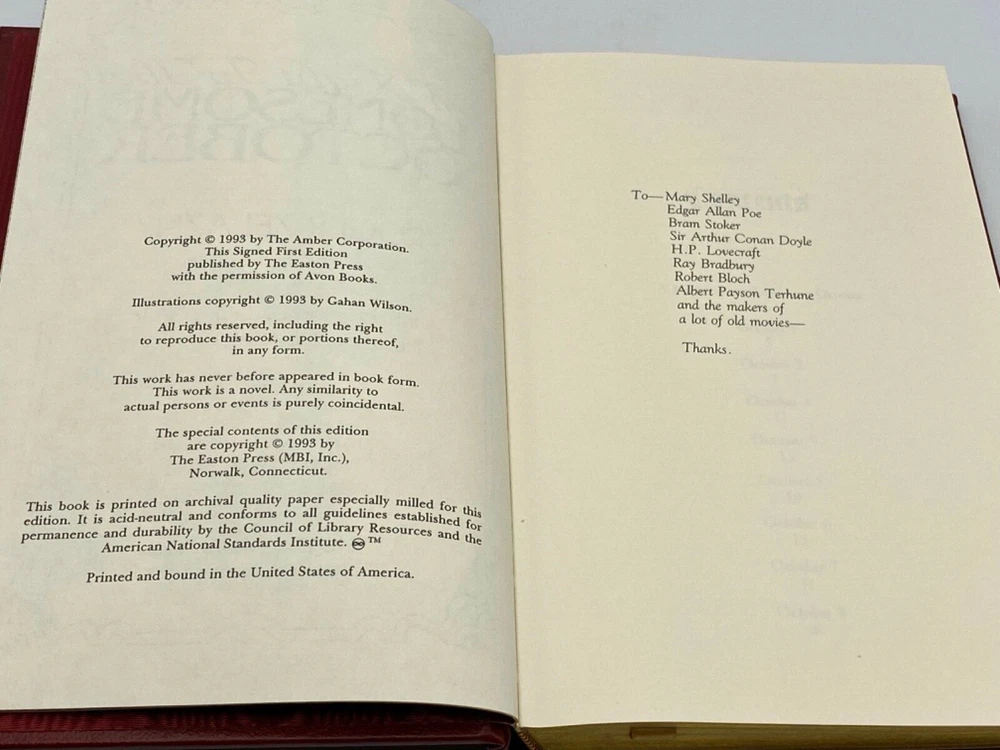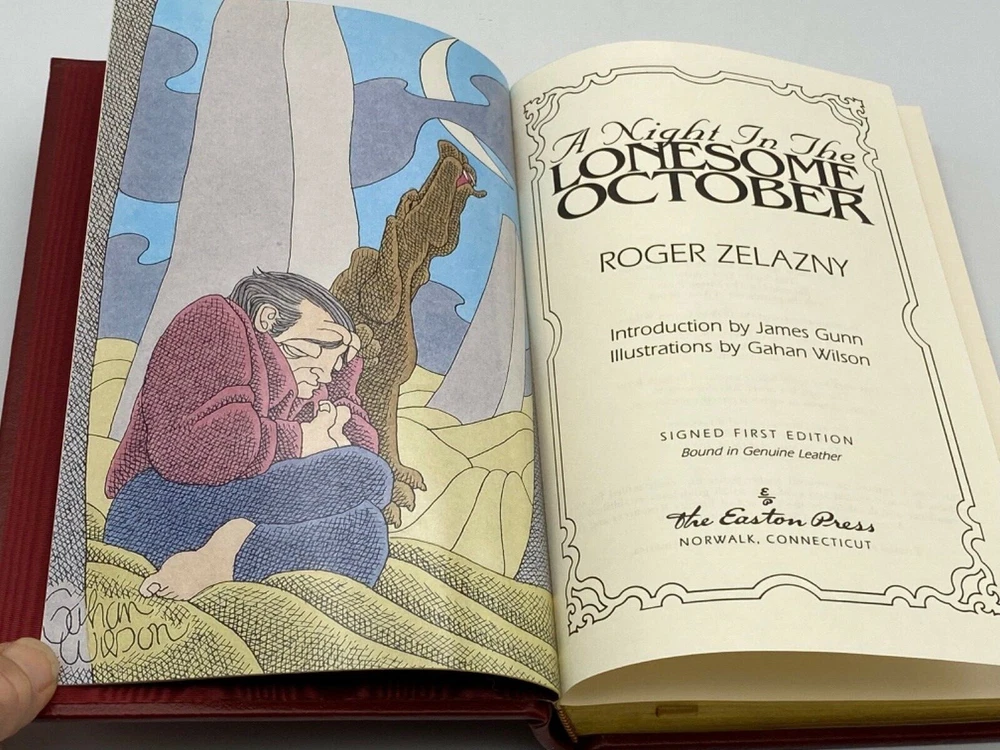 MAKES THE PERFECT GIFT FOR ANY FAN OF VINTAGE SCIENCE FICTION / ROGER ZELAZNY ** PLEASE READ : Mahalo for taking the time to look at our listing. We truly appreciate it. We always do our BEST to give you the most accurate description of these beautiful books. If, however, you have any SPECIFIC questions about the SIZE of the book, NUMBER of pages, TYPE of leather, SMELL or FEEL of the book, PLEASE email us through EBay’s mail system BEFORE you bid, and we will be HAPPY to give you more information. We want you to be completely happy with your purchase and keep you as our customers for years to come!** DESCRIPTION: Easton Press full-leather binding, part of the SIGNED FIRST EDITION OUT OF PRINT Science Fiction Series, personally SIGNED by ZELAZNY. THIS IS A SCARCE VINTAGE HEIRLOOM EASTON WITH LAVISH DEEP GILT IMPRINTS TO THE BOARDS AND SPINE with WONDERFUL VINTAGE ILLUSTRATIONS. IT IS ONE OF THE MOST HIGHLY-PRIZED EDITIONS OF THIS CLASSIC SCIENCE FICTION NOVEL. 🍍 NOT INCLUDED... 😃 THESE SIGNED EDITIONS ARE GETTING MORE SCARCE TO FIND AS TIME GOES ON DUE TO ZELANY’S UNFORTUNATE PASSING IN 1995 ABOUT THE BOOK: Loyally accompanying a mysterious knife-wielding gentleman named Jack on his midnight rounds through the murky streets of London, good dog Snuff is busy helping his master collect the grisly ingredients needed for an unearthly rite that will take place not long after the death of the moon. But Snuff and his master are not alone. All manner of participants, both human and not, are gathering with their ancient tools and their animal familiars in preparation for the dread night. It is brave, devoted Snuff who must calculate the patterns of the Game and keep track of the Players—the witch, the mad monk, the vengeful vicar, the Count who sleeps by day, the Good Doctor and the hulking Experiment Man he fashioned from human body parts, and a wild-card American named Larry Talbot—all the while keeping Things at bay and staying a leap ahead of the Great Detective, who knows quite a bit more than he lets on. Boldly original and wildly entertaining, A Night in the Lonesome October is a darkly sparkling gem, an amalgam of horror, humor, mystery, and fantasy. First published in 1993, it was Zelazny’s last book prior to his untimely death. Many consider it the best of the fantasy master’s novels. It has inspired many fans to read it every year in October, a chapter a day, and served as inspiration for Neil Gaiman’s brilliant story “Only the End of the World Again.” CONDITION: Book is in LIKE NEW condition for its age with only a couple of faint negligible rubs to the gilt page ends (SEE PICS FOR FURTHER DETAILS). NO ATTACHED BOOKPLATES, WRITING FROM PREVIOUS OWNER, ETC. It is a GORGEOUS EDITION. SHIPPING: FREE TO US ADDRESSES ONLY. INTERNATIONAL $ based on location. WE SHIP PRIORITY MAIL & PACK VERY WELL. Please check out our other listings of Easton Press, Franklin Library, Limited Editions Club, First Edition Library, Folio Society, Heritage Press, and International Collectors Library editions. WE DO COMBINE SHIPPING IF YOU PURCHASE MORE THAN ONE COPY. Mahalo for looking at our listings! By bidding/purchasing this item, you are helping a very grateful family who sends you our WARMEST ALOHA & MAHALO!