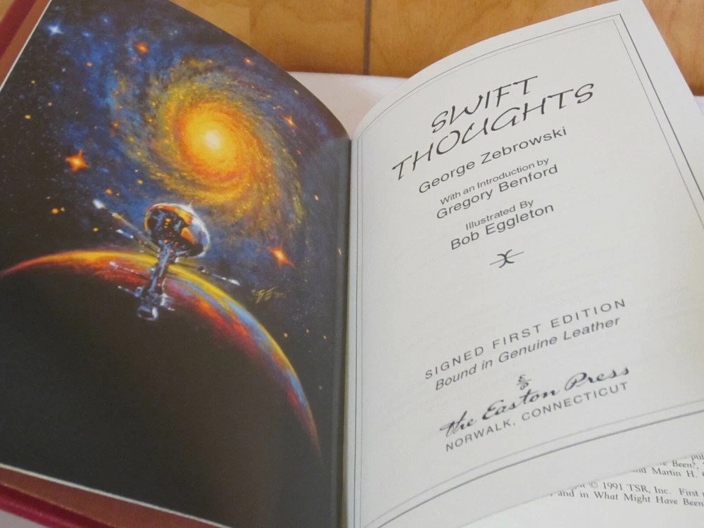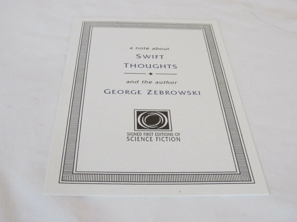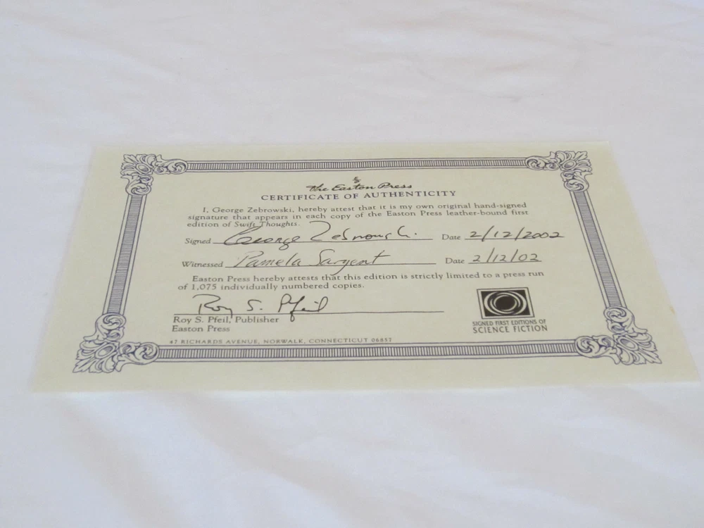 From the Easton Press Signed First Editions Collection... Swift Thoughts PERSONALLY SIGNED by Author George Zebrowski Easton Press Signed First Edition Copyright 2002 by The Easton Press Number 476 of 1,075 Signed Copies Bound in Premium Full Leather This Signed First Edition contains all of the classic Easton Press trimmings: Premium Leather Silk Moire Endleaves Distinctive Cover Design Hubbed Spine, Accented in Real 22KT Gold Satin Ribbon Page Marker Gilded Page Edges Long-lasting, High Quality Acid-neutral Paper Smyth-sewn Pages for Strength and Durability A very scarce title in any condition, this copy is in Fine condition. The front and back covers are both in near perfect condition and the gilded page edges show hardly any wear! There is NO attached bookplate nor any other signs of previous ownership. This edition is limited to only 1,075 signed copies; this being number 476. This book is personally signed by George Zebrowski and comes complete with a Collectors Note and Certificate of Authenticity. It would be a beautiful addition to your Easton Press collection. Overall, this copy is a grade collector's book. This book is very elusive in this superior condition, as only a limited number of them were ever published, so now is the time to act. Hopefully you can add this book to your collection and enjoy it in the years to come... Please Email Me With Any Questions You Might Have! Shipping Info: Buyer to Pay Shipping and Handling International Bidders Pay Extra Shipping Seller Not Responsible For Uninsured Items Lost or Damaged in Mail Forms of Payment Accepted: Paypal Good luck and happy bidding! Powered by eBay Turbo Lister The free listing tool. List your items fast and easy and manage your active items.
