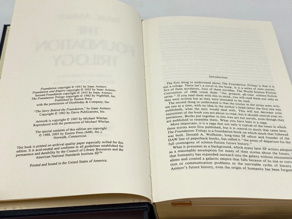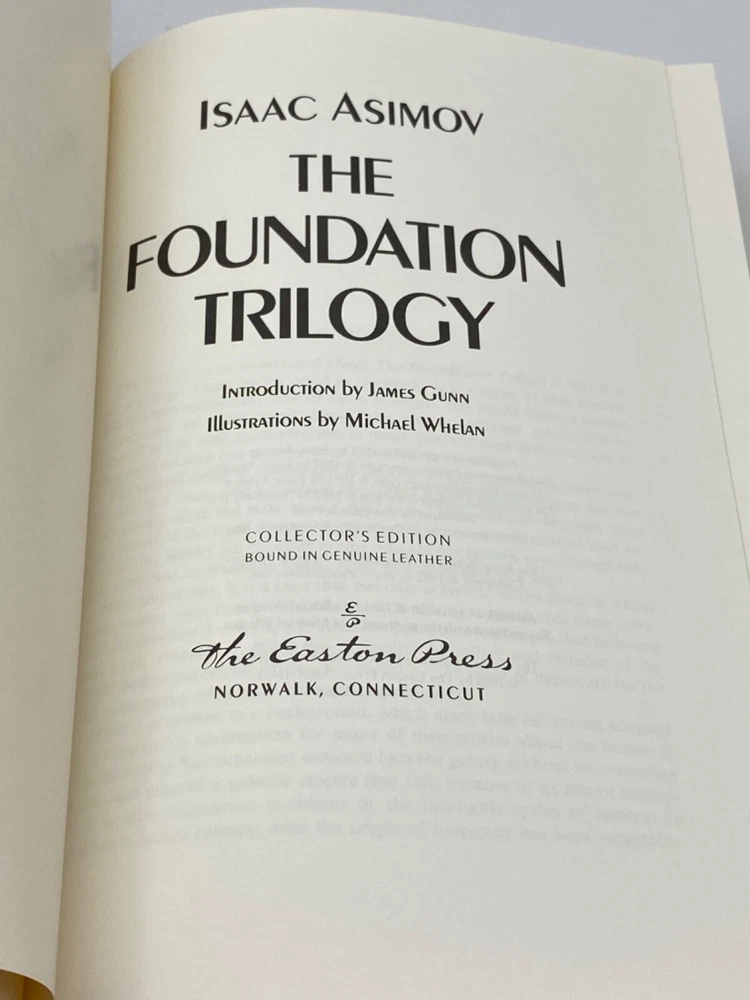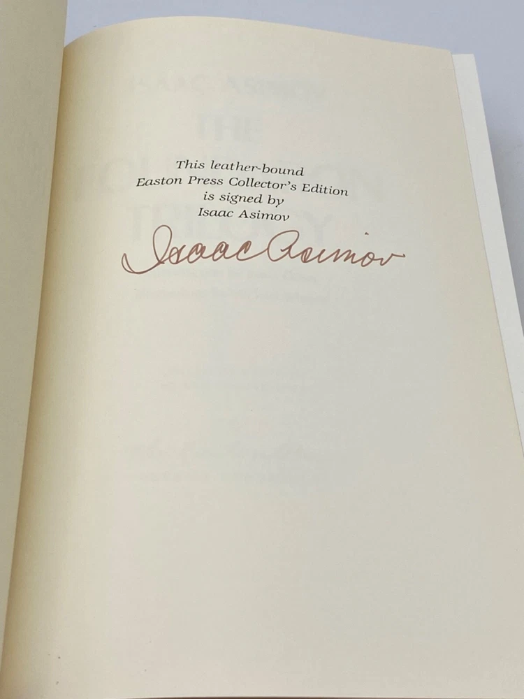 MAKES THE PERFECT GIFT FOR ANY FAN OF ISAAC ASIMOV / VINTAGE SCIENCE FICTION ** PLEASE READ : Mahalo for taking the time to look at our listing. We truly appreciate it. We always do our BEST to give you the most accurate description of these beautiful books. If, however, you have any SPECIFIC questions about the SIZE of the book, NUMBER of pages, TYPE of leather, SMELL or FEEL of the book, PLEASE email us through EBay’s mail system BEFORE you bid, and we will be HAPPY to give you more information. We want you to be completely happy with your purchase and keep you as our customers for years to come!** DESCRIPTION: Easton Press full-leather binding, part of the SIGNED OUT OF PRINT Science Fiction Series, personally SIGNED by ASIMOV. THIS IS A SCARCE VINTAGE HEIRLOOM EASTON WITH LAVISH DEEP GILT IMPRINTS TO THE BOARDS AND SPINE with WONDERFUL VINTAGE ILLUSTRATIONS. IT IS ONE OF THE MOST HIGHLY-PRIZED EDITIONS OF THIS SCIENCE FICTION MASTERPIECE. ORIGINAL COLLECTOR’S NOTES ARE INCLUDED. 🍍 NOT INCLUDED... 😃 THESE SIGNED EDITIONS ARE GETTING SCARCER TO FIND AS TIME GOES ON DUE TO ASIMOV UNFORTUNATE PASSING IN 1992. ABOUT THE BOOK: A THOUSAND-YEAR EPIC, A GALACTIC STRUGGLE, A MONUMENTAL WORK IN THE ANNALS OF SCIENCE FICTION FOUNDATION begins a new chapter in the story of man's future. As the Old Empire crumbles into barbarism throughout the million worlds of the galaxy, Hari Seldon and his band of psychologists must create a new entity, the Foundation-dedicated to art, science, and technology-as the beginning of a new empire. FOUNDATION AND EMPIRE describes the mighty struggle for power amid the chaos of the stars in which man stands at the threshold of a new enlightened life which could easily be destroyed by the old forces of barbarism. SECOND FOUNDATION follows the Seldon Plan after the First Empire's defeat and describes its greatest threat-a dangerous mutant strain gone wild, which produces a mind capable of bending men's wills, directing their thoughts, reshaping their desires, and destroying the universe. CONDITION: Book is in LIKE NEW for its age with no discernible flaws (SEE PICS FOR FURTHER DETAILS). NO WRITING FROM PREVIOUS OWNER, ETC. It is a GORGEOUS EDITION. SHIPPING: FREE TO US ADDRESSES ONLY. INTERNATIONAL $ based on location. WE SHIP PRIORITY MAIL & PACK VERY WELL. Please check out our other listings of Easton Press, Franklin Library, Limited Editions Club, First Edition Library, Folio Society, Heritage Press, and International Collectors Library editions. WE DO COMBINE SHIPPING IF YOU PURCHASE MORE THAN ONE COPY. Mahalo for looking at our listings! By bidding/purchasing this item, you are helping a very grateful family who sends you our WARMEST ALOHA & MAHALO!