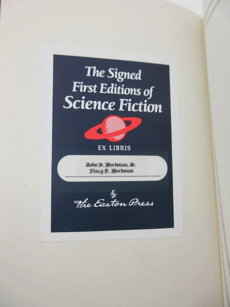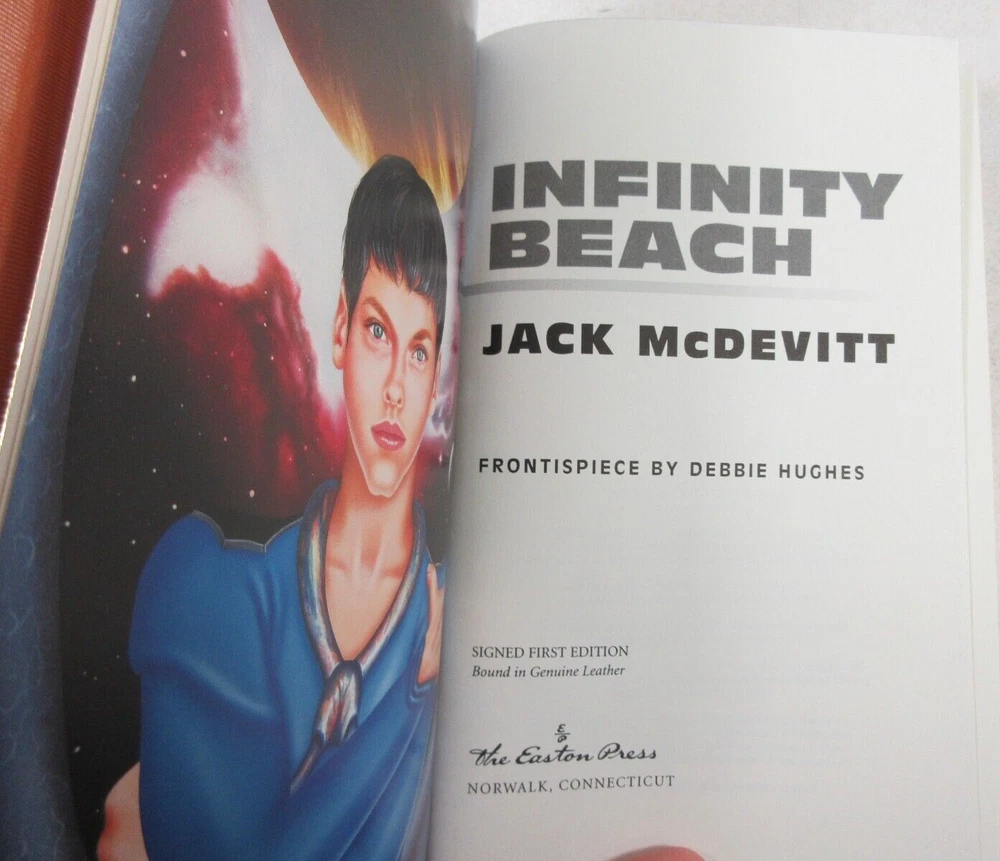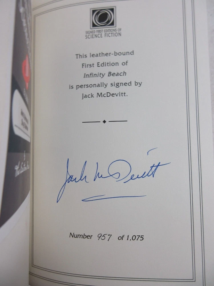 For sale is an excellent condition Easton leather-bound limited edition copy of Infinity Beach by Jack McDevitt. SIGNED by McDevitt on limitation page! Comes with signed COA and a collector's note. Limited Edition #957 of 1,075 copies made. Stated 1st Edition, published in 2000 by the Easton Press in Norwalk, CT. Features leather with gold foil lettering and decoration, a banded spine, gilt pages, and a gold satin placeholder ribbon. Binding is sound and pages are unmarked, with the exception of previous owner's bookplate affixed to the page opposite the limitation page, book is near mint otherwise. Boards are clean and square with minimal shelf wear. Please see photos for condition detail. shelf reference #L-1384