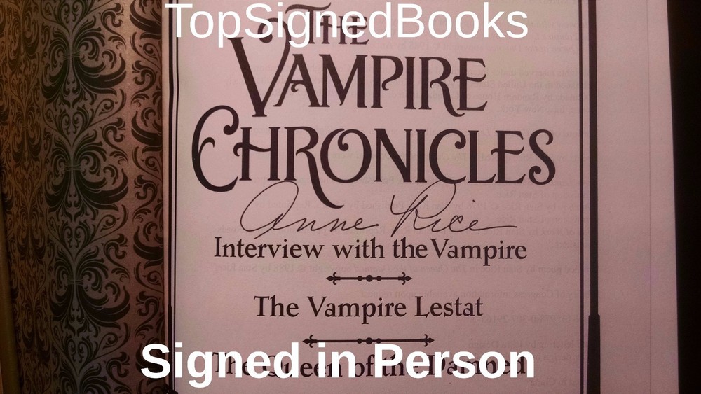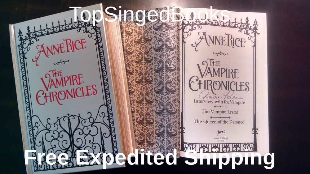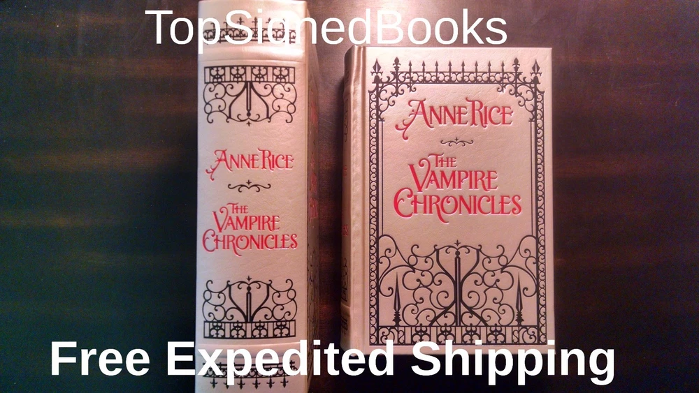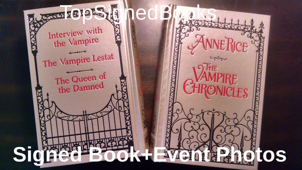 FEEL FREE TO SUBMIT YOUR BEST OFFER! SIGNED IN PERSON! " The Vampire Chronicles: Interview with a Vampire, Vampire Lestat and the Queen of the Damned" (Leatherbound Classics) by Anne Rice! New with event PHOTOS! A very limited number of these books was signed in person by Anne Rice a t a signing appearance in Los Angeles on Dec 5th, 2016. This was wristbanded event, and only those with wristbands were able to attend the event. The book is NEW and was only opened to be signed. It will come with event PHOTOS! EXCELLENT GIFT! COLLECTABLE! FREE E XPEDITED SHIPPING IN U.S. I DO SHIP WORLDWIDE. PAYMENT Paypal Hurry! Very limited supply. Thank you! Please see my store for other rare signed books. Book Overview: In 1976, nearly 80 years after Bram Stoker published Dracula, Anne Rice's bestselling first novel, Interview with the Vampire, breathed new life into the vampire myth. Now, in one chilling volume, here are the first three classic novels of The Vampire Chronicles; Interview with the Vampire, The Vampire Lestat, and Queen of the Damned. All amazing stories in themselves, together this huge volume presents a classic work bound together into one attractively designed edition. Editorial Reviews In 1976, nearly 80 years after Bram Stoker published Dracula, Anne Rice's bestselling first novel, Interview with the Vampire, breathed new life into the vampire myth. Now, in one chilling volume, here are the first three classic novels of The Vampire Chronicles; Interview with the Vampire, The Vampire Lestat, and Queen of the Damned. All amazing stories in themselves, together this huge volume presents a classic work bound together into one attractively designed edition. Biography Anne Rice was born and raised in New Orleans, Louisiana. She holds a Master of Arts Degree in English and Creative Writing from San Francisco State University, as well as a Bachelor's Degree in Political Science. Anne has spent more of her life in California than in New Orleans, but New Orleans is her true home and provides the back drop for many of her famous novels. The French Quarter provided the setting for her first novel, Interview with the Vampire. And her ante-bellum house in the Garden District was the fictional home of her imaginary Mayfair Witches. She is the author of over 30 books, most recently the Toby O'Dare novels Of Love and Evil, and Angel Time; the memoir, Called Out of Darkness;and her two novels about Jesus, Christ the Lord: Out of Egypt and Christ the Lord: The Road to Cana. (Anne regards Christ the Lord: The Road to Cana as her best novel.) ---- Under the pen name, A.N. Roquelaure, Anne is the author of the erotic (BDSM) fantasy series, The Sleeping Beauty Trilogy. Under the pen name Anne Rampling she is the author of two erotic novels, Exit to Eden and Belinda. Anne publicly broke with organized religion in July of 2010 on moral grounds, affirming her faith in God, but refusing any longer to be called "Christian." The story attracted surprising media attention, with Rice's remarks being quoted in stories all over the world. Anne hopes that her two novels about Jesus will be accepted on their merits by readers and transcend her personal difficulties with religion. "Both my Christ the Lord novels were written with deep conviction and a desire to write the best novels possible about Jesus that were rooted in the bible and in the Christian tradition. I think they are among the best books I've ever been able to write, and I do dream of a day when they are evaluated without any connection to me personally. I continue to get a lot of very favorable feedback on them from believers and non believers. I remain very proud of them." Anne is very active on her FaceBook Fan Page and has well over a million followers. She answers questions every day on the page, and also posts on a variety of topics, including literature, film, music, politics, religion, and her own writings. Many indie authors follow the page, and Anne welcomes posts that include advice for indie authors. She welcomes discussion there on numerous topics. She frequently asks her readers questions about their response to her work and joins in the discussions prompted by these questions. Her novel, "The Wolves of Midwinter," a sequel to "The Wolf Gift" and part of a werewolf series set in Northern California in the present time, will be published on October 15, 2013. In these books --- The Wolf Gift Chronicles -- Anne returns to the classic monsters and themes of supernatural literature, similar to those she explored in her Vampire Chronicles, and tales of the Mayfair Witches. Her new "man wolf" hero, Reuben Golding, is a talented young man in his twenties who suddenly discovers himself in possession of werewolf powers that catapult him into the life of a comic book style super hero. How Reuben learns to control what he is, how he discovers others who possess the same mysterious "wolf gift," and how he learns to live with what he has become --- is the main focus of the series. "The Wolves of Midwinter" is a big Christmas book --- a book about Christmas traditions, customs, and the old haunting rituals of Midwinter practiced in Europe and in America. It's about how the werewolves celebrate these rituals, as humans and as werewolves. But the book also carries forward the story of Reuben's interactions with his girl friend, Laura, and with his human family, with particular focus on Reuben's father, Phil, and his brother, Jim. As a big family novel with elements of the supernatural, "The Wolves of Midwinter" has much in common with Anne's earlier book, "The Witching Hour." Among the treats of "The Wolves of Midwinter" is a tragic ghost who appears in the great house at Nideck Point, and other "ageless ones" who add their mystery and history to the unfolding revelations that at times overwhelm Reuben. In October of 2014, with the publication of "Prince Lestat," Anne returned to the fabled "Brat Prince" of the Vampire Chronicles, catching up with him in pr
