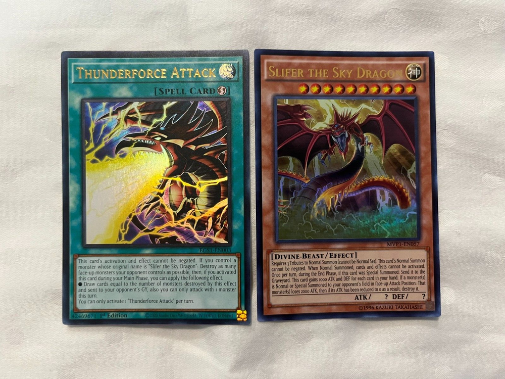 SLIFER THE SKY DRAGON MVP1-EN057 OBELISK THE TORMENTOR THUNDERFORCE ATTACK ULTRA AS SHOWN IN PICTURES: ALL CARDS ARE IN NEAR MINT OR VERY LIGHTLY PLAYED CONDITION! GREAT CONDITION! SLIFER THE SKY DRAGON MVP1-EN057 (ULTRA RARE) OBELISK THE TORMENTOR (ULTRA RARE) THUNDERFORCE ATTACK (ULTRA RARE) ALL orders from my store will be shipped in a small envelope WITH tracking shipped with an eBay standard envelope tracking label. See shipping price! Handling time is 2 days, and then the item will be shipped immediately!