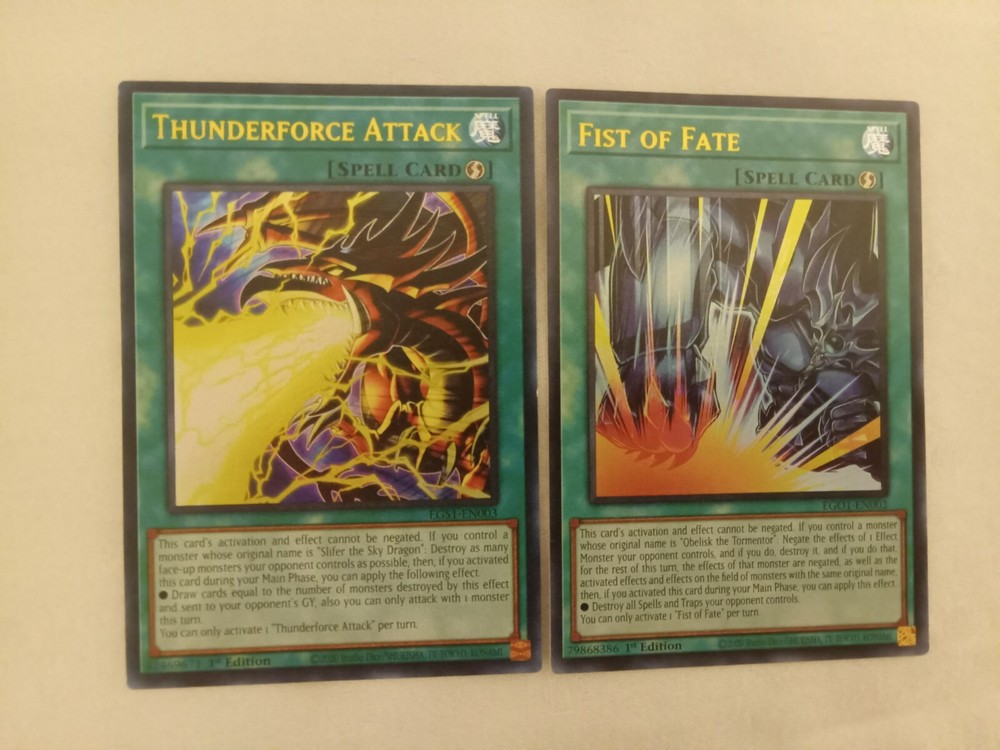 SLIFER THE SKY DRAGON OBELISK THE TORMENTOR THUNDERFORCE ATTACK FIST OF FATE YGO AS SHOWN IN PICTURES: ALL CARDS ARE IN NEAR MINT, GREAT CONDITION! SLIFER THE SKY DRAGON (ULTRA RARE) OBELISK THE TORMENTOR (ULTRA RARE) THUNDERFORCE ATTACK (ULTRA RARE) FIST OF FATE (ULTRA RARE) ALL orders from my store will be shipped in a small envelope WITH tracking shipped with an eBay standard envelope tracking label. See shipping price! Handling time is 2 days, and then the item will be shipped immediately!