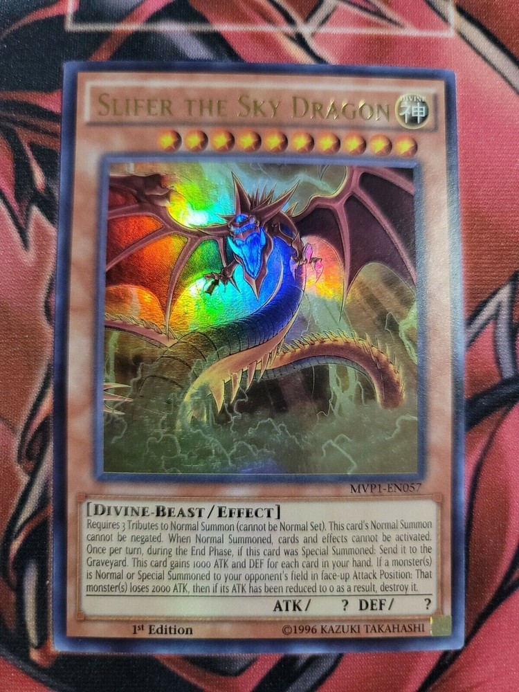 You are bidding on : 1 x Yu-Gi-Oh The Dark Side of Dimensions SLIFER THE SKY DRAGON (Ultra Rare - 1st Edition) MVP1-EN057 All cards are in Near Mint condition unless specified Pictures are stock pictures ONLY it is not of the actual card How we identify the condition of the card: Near Mint: Most of the time cards in this condition are pack fresh but, the card may have minor flaws that are not visible with a quick inspection, small white dots or scratches that you have to closely examine the card to see. Excellent: Overall the card looks near mint but may have minor scratches, slightly worn edges that are visible but they do not interfere with the way the card looks. Lightly Played: Similar to a card in excellent condition except there is more whitening around the edges and the corners are a little more worn or slight bends or creases that are visible. There might be some slight whitening on the back or front of the card. Imperfections will be visible with a quick inspection. When the card is sleeved the imperfections will not be noticeable and the card will look just like the rest of your cards Played: There is a large amount of whitening around the edges and the corners have a good amount of damage, many scratches, bends and/or creases on the card. When the card is sleeved it can still be played Shipping and Handling : Canada Shipping is $1.50 CAD Tracking is offered for $13 CAD BUT tracking is required on any purchases that are over $50 CAD Please contact us for combined shipping if interested in purchasing multiple cards before paying USA Shipping is $1.99 CAD Regular Mail for all orders under $19.99 Shipping is $7.99 CAD with USPS tracking for all orders $19.99 and over Please contact us for combined shipping if interested in purchasing multiple cards before paying INTERNATIONAL Shipping is $4.99 CAD with regular mail Tracking is offered for $29.99 CAD BUT tracking is required for purchases over $50 CAD Please contact us for combined shipping if interested in purchasing multiple cards before you pay Combined shipping: We offer combined shipping: each and every additional item after the first one is only $0.25 (25 cents). To obtain combined shipping fees, please use the shopping cart or ask for the combined shipping invoice BEFORE you pay. If you pay item-by-item, right away after the purchase, we will not be able to offer you combined shipping anymore. Handling Your order will be shipped 1-3 business days after payment has been received *“Business days” are normal weekdays. Saturdays, Sundays, and major holidays do not count as business days. Cards purchased are packaged and shipped in a sleeve, toploaders, a team bag and an envelope to ensure protection of cards Payment : Payments should be made within 5 days after purchase Epic Cards and Games Any questions feel free to email us and allow 1 day for a response. Thanks for looking! Sales Tax (Canada Only) : Purchases made by Canadian residents are subject to applicable GST/HST, depending on your province/territory. (If you do not agree to this, please do not bid. We have a registered business in Canada and are required by law to charge taxes to anything shipped within the country.) Thank you for shopping with Epic Cards and Games