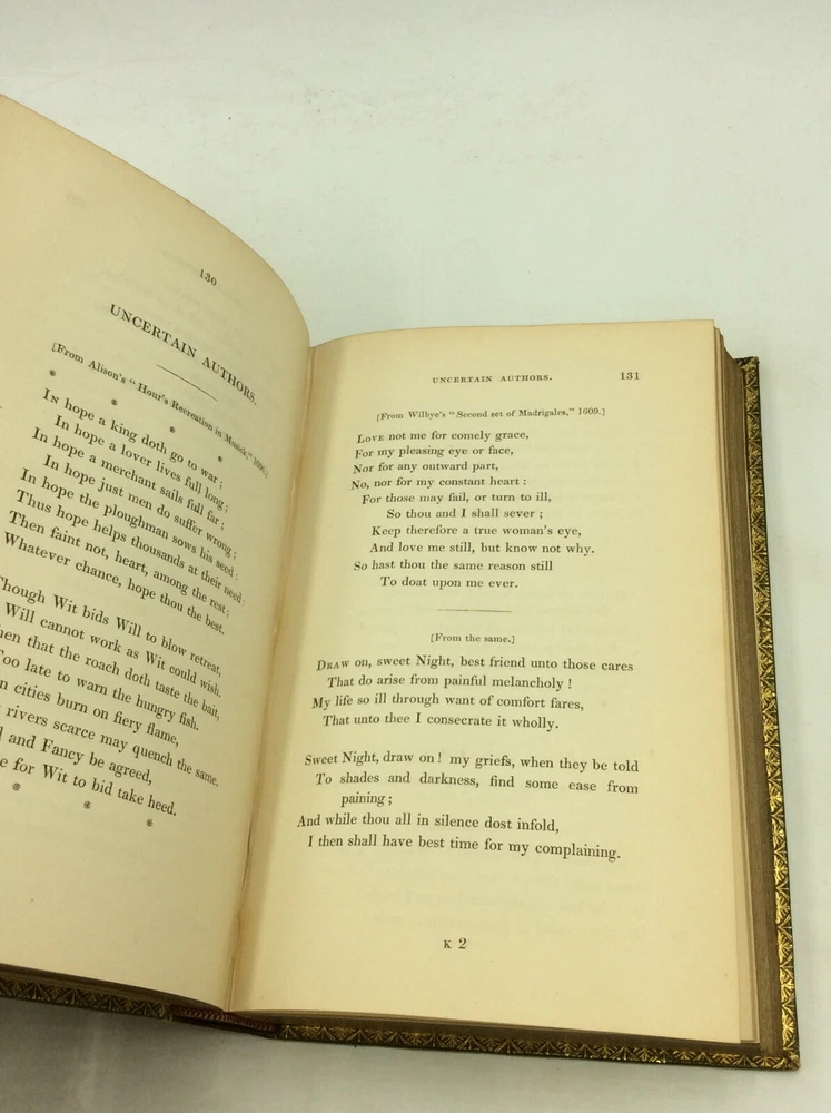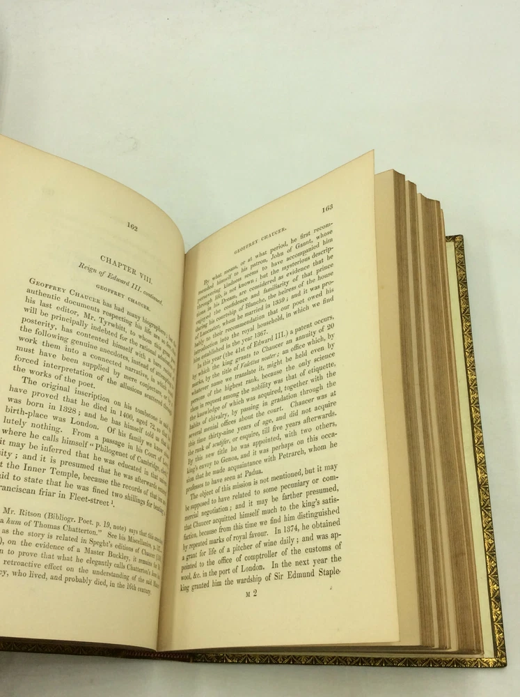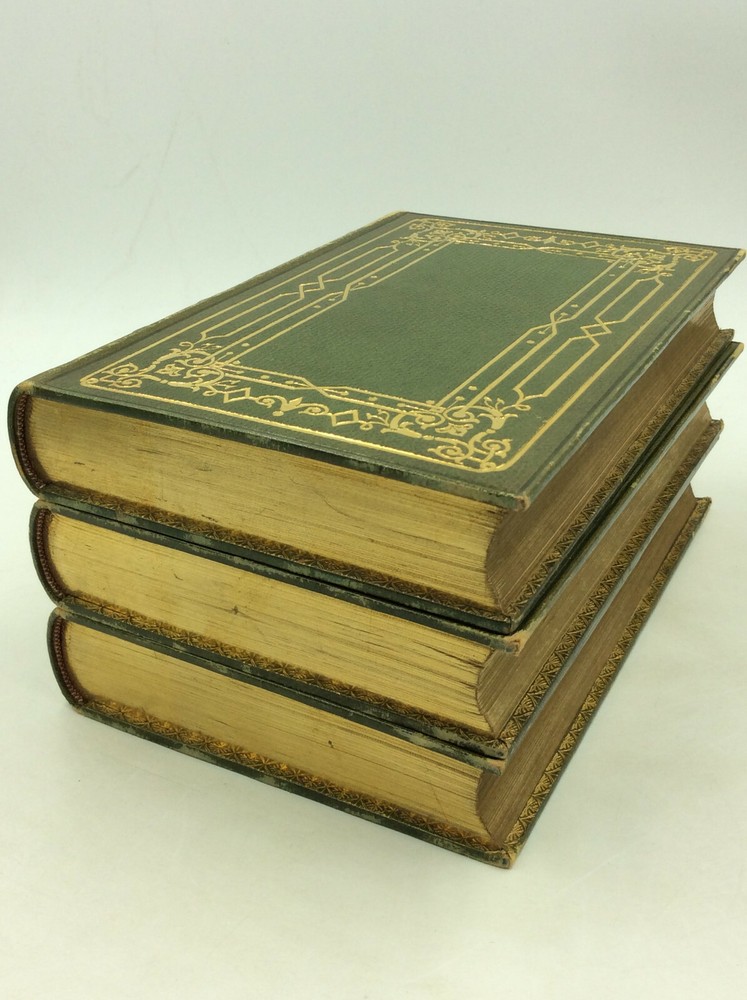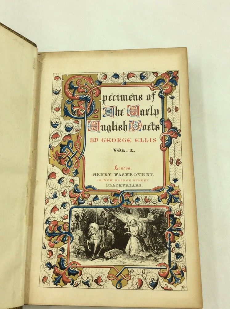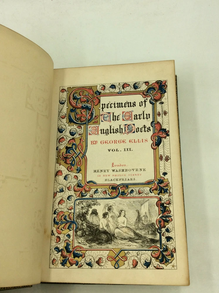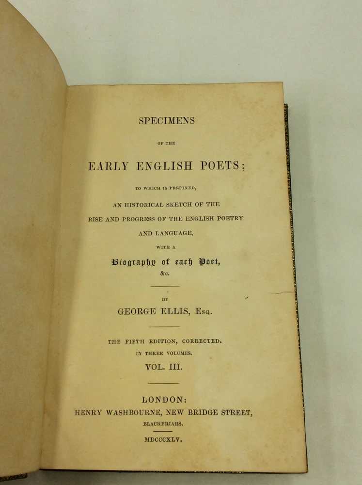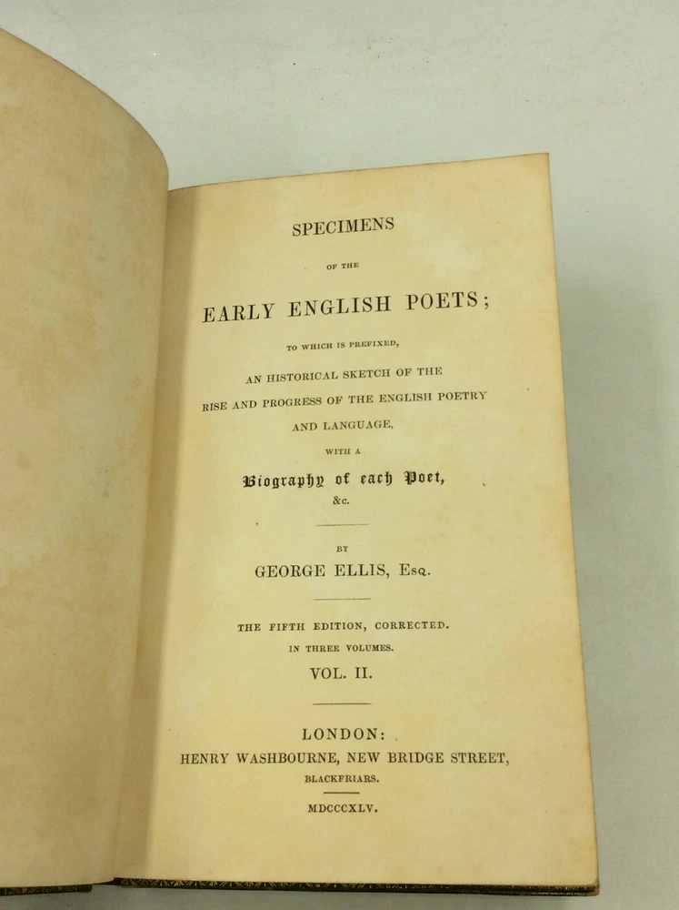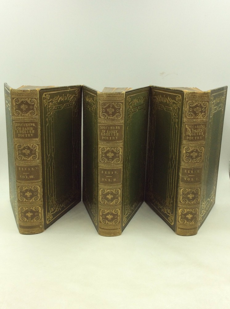 George Ellis SPECIMENS OF THE EARLY ENGLISH POETS; to Which Is Prefixed, an Historical Sketch of the Rise and Progress of the English Poetry and Language, with a Biography of Each Poet, &c. London: Henry Washbourne, 1845. Leather. 3 vols. 342p; 392p; 408p. A set of three small hardcover books bound in full green leather with ornate gilt decorations on the boards and spines. Features gilt foredges and dentelles. Very good condition overall. The spines are faded and the edges scuffed. Foxing on some pages, but the text is otherwise unmarked. The binding is secure across the set. Item #176956 Each volume features a decorated title page and measures approx. 6.75" x 4.5"