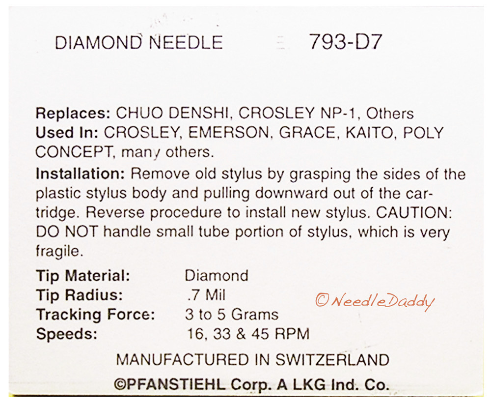 1ea. NEW IN BOX Pfanstiehl diamond replacement needle for VESTAX HANDYTRAX Steepletone RETRO ELTA Goldstar, Grand Prix, Sanyo, Fisher, Emerson, SOUNDESIGN, Yorx and m any Nostalgia record players being produced today. These include: COCA COLA CRATE, CROSLEY, EMERSON, LEETAC, MEMOREX, PHILCO, RCA MAGNOLIA CATHEDRAL, STUDEBAKER, TEAC AND THOMAS PACCONI, Anderson Nicholson's turntable,COCA-COLA CRATE, Crosley Turntable PAPRIKA - Conductor entertainment center CR-73 PA, CR49, CR711-BK, CR711-RE, EMPIRE,EMERSON,ION QUICK PLAY LP, ION POWER PLAY LP, ION QUICK PLAY FLASH, ION CONTOUR LP, ION VERTICAL VINYL, Leetac 402-M208-165 Leetac TAP-512, Leetac TAP-807, MEMOREX B0002Y3JRK, NEWPORT VICTROLA STYLE, Norm Thompson nostaligic turntable #15429 ORVIS SI72TK, Philco Retro Nostalgia PHILCO-SUITCASE, RCA-LAWTON 841.662 841.668 RCA Magnolia Cathedral Turntable 841.670, Chaplin Turntable RCA-CHAPLIN POLYFLAME NEWPORT Spectra Studebaker,TEAC MODELS SL-A100BK SL-A100RD GF-180 GF-600, THOMAS PACCONI TCP-MSE825, and many many more.. Manufactured in Switzerland to the highest quality standards. Be careful!! Compare your old needle to the pictures before making a purchase. If you need help then just attach a picture of your old needle to an ebay message and I will find the exact replacement stylus for you. REPLACES THESE NEEDLE NUMBERS: FISHER ST-05D, FISHER ST05D, FISHER ST-141, FISHER ST141, FISHER ST-707J, FISHER ST707J, MAGNAVOX 5690300007, MAGNAVOX 5690600006, PANASONIC CZ-800, PANASONIC CZ800, SANYO ST-05, SANYO ST-05D, SANYO ST05D, SANYO ST-141, SANYO ST141, SANYO ST-707J, teac stl-103, SHARP STY-146, SHARP STY146, SONY ND-152P, SONY ND152P. VESTAX VR-1SS, VESTAX VR1SS, GRACE GDI-NDL2 USED IN THESE CARTRIDGES : Chou Denshi CZ-800, PFANSTIEHL P-188D, PFANSTIEHL P-190D, SANYO MG-9, MAGNAVOX 569050007, SONY VX-52G, CROSLEY NOSTALGIA RECORD PLAYERS. .7 MIL P recision DIAMOND TIP PLAYS 33 AND 45 RPM rec ords onl y . 3 to 5 grams tracking force. T his needle will not play 78 rpm records. Many of these retro nostalgia record players are made to play all 3 speeds; 33, 45 and 78 rpm. However they only come with one needle. This needle has a .7 mil diamond that plays 33 and 45 rpm only. A needle with a .7 mil stereo tip will damage your 78 rpm records and you will need a needle with a 3 mil tip to play those. There is a handy link below that will take you to that needle. PLEASE READ! Please use the following information as a guide only. Compare your old needle to the pictures. If you don't have an old needle to compare t o then do not purchase the item. Not all Models are listed. Attach a picture of your needle to an ebay mail and I will help you find the exact replacement. USED IN CROSLEY MODELS: CROSLEY CR-27, CROSLEY CR27, CROSLEY CR-43, CROSLEY CR43, CROSLEY CR-44, CROSLEY CR44, CROSLEY CR-46C, CROSLEY CR46C, B ing Crosley, CROSLEY CR-48C, CROSLEY CR48C, CROSLEY CR-49B, CROSLEY CR49B, CROSLEY SUITCASE CR-49TA, CROSLEY CR49TA, CROSLEY CR-49TW, CROSLEY CR49TW, CROSLEY CR-50TW, CROSLEY CR50TW, CROSLEY CR-53, CROSLEY CR53, CROSLEY CR-67, CROSLEY CR67, CROSLEY CR-69, CROSLEY CR69, CROSLEY CR-70, CROSLEY CR70, CROSLEY CR-77D, CROSLEY CR77D, CROSLEY CR-78D, CROSLEY CR78D, CROSLEY CR-711, CROSLEY CR711, CROSLEY CR-712CD, CROSLEY CR712CD CROSLEY CR-86, CROSLEY CR86, CROSLEY CR-87CD, CROSLEY CR87CD, CROSLEY G6082, CROSLEY G-6082. USED IN CROWN MODELS: CROWN CD-3000, CROWN CD3000, CROWN MCK-260, CROWN MCK260, CROWN MCK-380, CROWN MCK380, CROWN MCK-550, CROWN MCK550, CROWN CD-2000, CROWN CD2000, CROWN CD-2500, CROWN CD2500, CROWN MC-44, CROWN MC44, CROWN T-70, CROWN T70, CROWN H-90, CROWN H90, CROWN MZ-1000, CROWN MX1000, CROWN MZ-200, CROWN MZ200, CROWN MZ-2100, MZ2100. USED IN DAEWOOD (DAYTRON) MODELS: DAYTRON ACD-450, DAYTRON ACD450, DAYTRON ACD-5050, DAYTRON ACD5050, DAYTRON AMC-450, DAYTRON AMC450, DAYTRON AMC-550, DAYTRON AMC550, DAYTRON AMC-680, DAYTRON AMC680. USED IN FISHER MODELS: FISHER GT-747, FISHER GT747, FISHER GXT-1707, FISHER GXT1707, FISHER GXT-707, FISHER GXT707, FISHER GXT-747, FISHER GXT747, FISHER ICS-716, FISHER ICS716, FISHER MC-617, FISHER MC617, FISHER MC-715, FISHER MC715, FISHER MC-715B, FISHER MC715B. DO NOT COPY, PASTE OR STEAL. USED IN GOLDSTAR MODELS : GOLDSTAR FMH-18, GOLDSTAR FMH18, GOLDSTAR GCD-31P, GOLDSTAR GCD31P, GOLDSTAR GCD-21P, GOLDSTAR GCD21P, GOLDSTAR GCD-82P, GOLDSTAR GCD82P, GOLDSTAR GSM-6306, GOLDSTAR GSM-6310, GOLDSTAR GSM6310, GOLDSTAR GSM-6920, GOLDSTAR GSM6920, GOLDSTAR GSM-9005, GOLDSTAR GSM9005, GOLDSTAR GSM-9010, GOLDSTAR GSM9010, GOLDSTAR GSM-X2, GOLDSTAR GSMX2. DO NOT COPY, PASTE OR STEAL. USED IN THE FOLLOWING GRACE T URNTABLE MODELS: Grace Digital Vinyl Writer USED IN GRAND PRIX MODELS: GRAND PRIX S-3550, GRAND PRIX S3550, GRAND PRIX S-7700, GRAND PRIX S7700, GRAND PRIX R5100, GRAND PRIX R-5100 GRAND PRIX 3000, GRAND PRIX 3300, GRAND PRIX 3600, GRAND PRIX 5000, GRAND PRIX 5330A, GRAND PRIX 5480, GRAND PRIX 5485, GRAND PRIX 5600, GRAND PRIX 5700, GRAND PRIX 6000, GRAND PRIX 6300, GRAND PRIX 6400, GRAND PRIX 6500, GRAND PRIX 6600, GRAND PRIX 7050, GRAND PRIX 7100, GRAND PRIX 9000, GRAND PRIX SA-156, GRAND PRIX SA156. USED IN J.C. PENNY, JC PENNY, PENNCREST MODELS: J.C. PENNY 1798, J.C. PENNY 1748, J.C. PENNY 1758, J.C. PENNY 1806, J.C. PENNY 1954, J.C. PENNY 1979, J.C. PENNY 1986, J.C. PENNY 1987, J.C. PENNY 1988, J.C. PENNY 6831825. USED IN MAGNAVOX MODELS: MAGNAVOX ACD195, MAGNAVOX ACD196, MAGNAVOX AH400, MAGNAVOX AH406, MAGNAVOX AH807, MAGNAVOX AH809, MAGNAVOX AS9300, MAGNAVOX AS9400, MAGNAVOX AS9406, MAGNAVOX AS9408, MAGNAVOX AS9500, MAGNAVOX AS9506, MAGNAVOX EC3085, MAGNAVOX EC3086, MAGNAVOX EC-3086, MAGNAVOX EC3095, MAGNAVOX EC3096, MAGNAVOX EC4010, MAGNAVOX EC4011, E C4015, MAGNAVOX EC4018, MAGNAVOX EC4019, MAGNAVOX EC6000, MAGNAVOX EC8000, MAGNAVOX EC8010, MAGNAVOX EC8100, MAGNAVOX EC9000, MAGNAVOX EC9015, FCD895, FCD196, MAGNAVOX MER054, MAGNAVOX MX8000, MAGNAVOX MX8010, MAGNAVOX MX8100, MAGNAVOX MX9000, MAGNAVOX MX9015, MAGNAVOX EC9020, MAGNAVOX MX9020, 