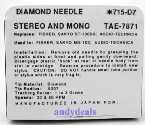 Phonograph Stylus Needle for Sanyo ST100SD ST-100SD SANYO MG-100 715-D7, STYLUS NEEDLE 715-D7 for Fisher Sanyo ST100SD ST-100SD fits SANYO MG-100D, STEREO RECORD PLAYER NEEDLE TURNTABLE STYLUS FOR Sanyo ST-100SD MG-100 715-D7 Model Pfanstiehl 715-D7 Used In: AUDIO TECHNICA DUAL etc. Description Brand New (factory box) Generic stylus Diamond .7 mil conical tip needle Tracking 1 - 3 grams Speeds: 16, 33 & 45 RPM REPLACES needles listed below NEEDLE S ASTATIC N1952 DUAL DN-201 DN201 EVG PM3100DE FISHER 134-4-4008-00100 1344400800100 4-1579-29330 4157929330 ST-100SD ST100SD RECOTON SP981D SANYO ST-100SD ST100SD CARTRIDGES DUAL DMS-200 DMS200 FISHER MG-100S MG100S RECOTON SP981D SANYO MG-100S MG-100 ST100SD ST100SD MG100S MG100 MODELS FISHER 134-0-4008-00100 1340400800100 35A 45 50 4300B 4700B 45 4800B 4900B 50 55 70 70 8000 9000 9000 9500 ACS8800 MT275 MT275 MT900 MT6360 MT8500 MT900 MT9000 SYSTEM4300 SYSTEM4700B SYSTEM4800B SYSTEM4900B SYSTEM4900 SYSTEM4900B SYSTEM550 SYSTEM550L