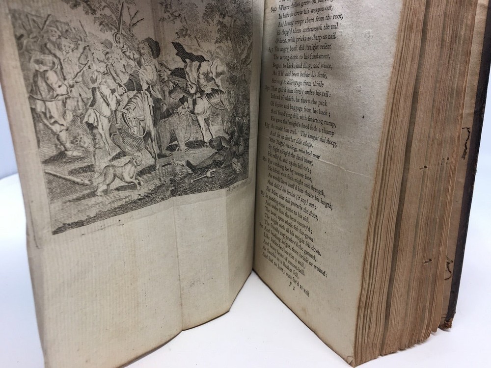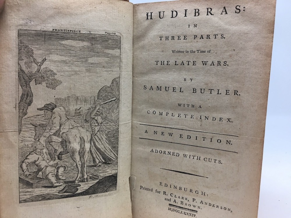 HUDIBRAS IN THREE PARTS WRITTEN IN THE TIME OF THE LATE WARS : A NEW EDITION ADORNED WITH CUTS Author: Butler, Samuel Title: HUDIBRAS IN THREE PARTS WRITTEN IN THE TIME OF THE LATE WARS : A NEW EDITION ADORNED WITH CUTS Publication: Edinburgh: R. Clark, P. Anderson and A. Brown, 1784 Description: Leather-bound. Original brown calf, measuring 7.0" x 4.25" x 1.25". Rubbing and wear to extremities, with corners bumped and a two-inch separation at front board near bottom. Five raised bands, six compartments, with contrasting spine label, triple-ruled in gilt. Text 324 [[/ followed by a 14 page index. Lovely engravings, two of them fold-outs, by R. Martin, H. Gavin, and others. Some insignificant worming to the last thirty pages -- with several tiny holes. Good Plus. Samuel Butler wrote the first of his famous three-part satirical polemic in 1663, the second part the following year, and the third in 1678. Hudibras is a book-length poem was written in iambic tetrameter in closed couplets and is, essentially, a diatribe against the viciousness and hypocrisies of extreme religious sectarianism displayed by the Roundheads, Puritans, Presbyterians and other sects involved in the English Civil War. The "story" of the poem follows the travels and adventures of Hudibras, a Knight Errant, as he travels through different lands seeking to prove his chivalry. Seller ID: 73973 Subject: Poetry Aardvark Rare Books Eugene, OR We work hard to make your Bookbuying Experience safe, easy and fun. Aardvark Books is a proud member of the ABAA (Antiquarian Booksellers Association of America) and IOBA, Independent Online Booksellers Association. Ezra is also an accredited and Qualified Appraiser of Books and Manuscripts, with a designation from the ASA (American Society of Appraisers), with considerable Archive experience as well. Shipping All books shipped to US destinations are sent via the US Postal Service. Faster shipping is available, please ask before paying. We will combine shipping on items purchased at the same time in order to help reduce costs. International shipping is also available. Please inquire for a shipping quote before ordering. This listing was created by Bibliopolis.