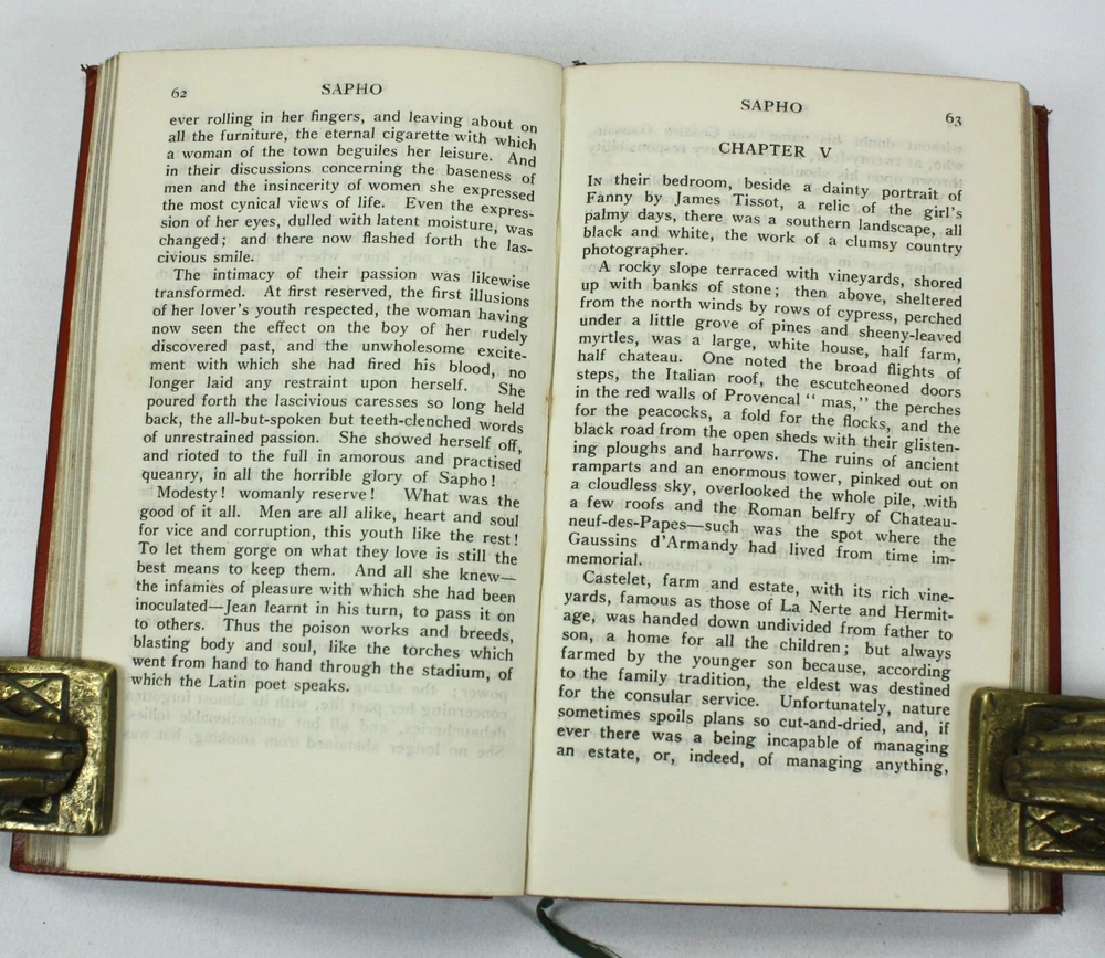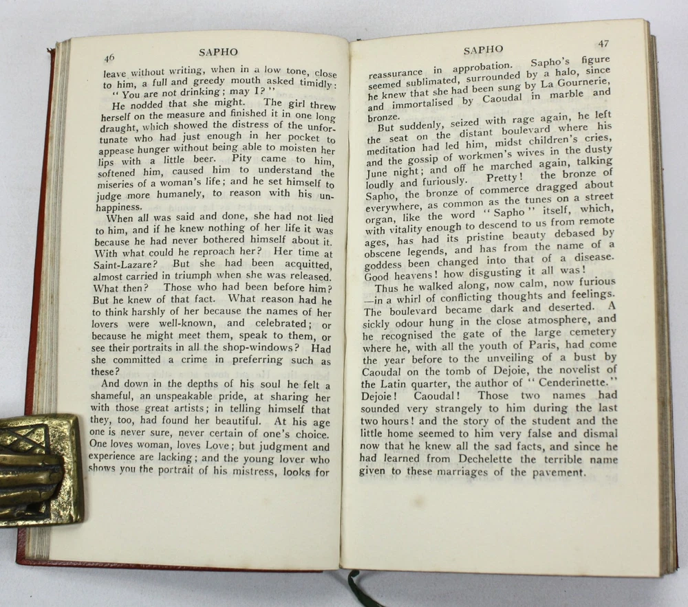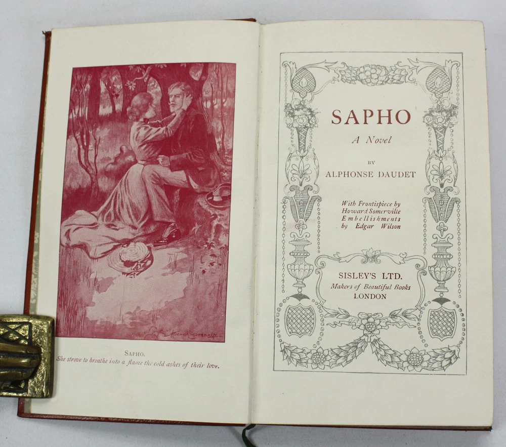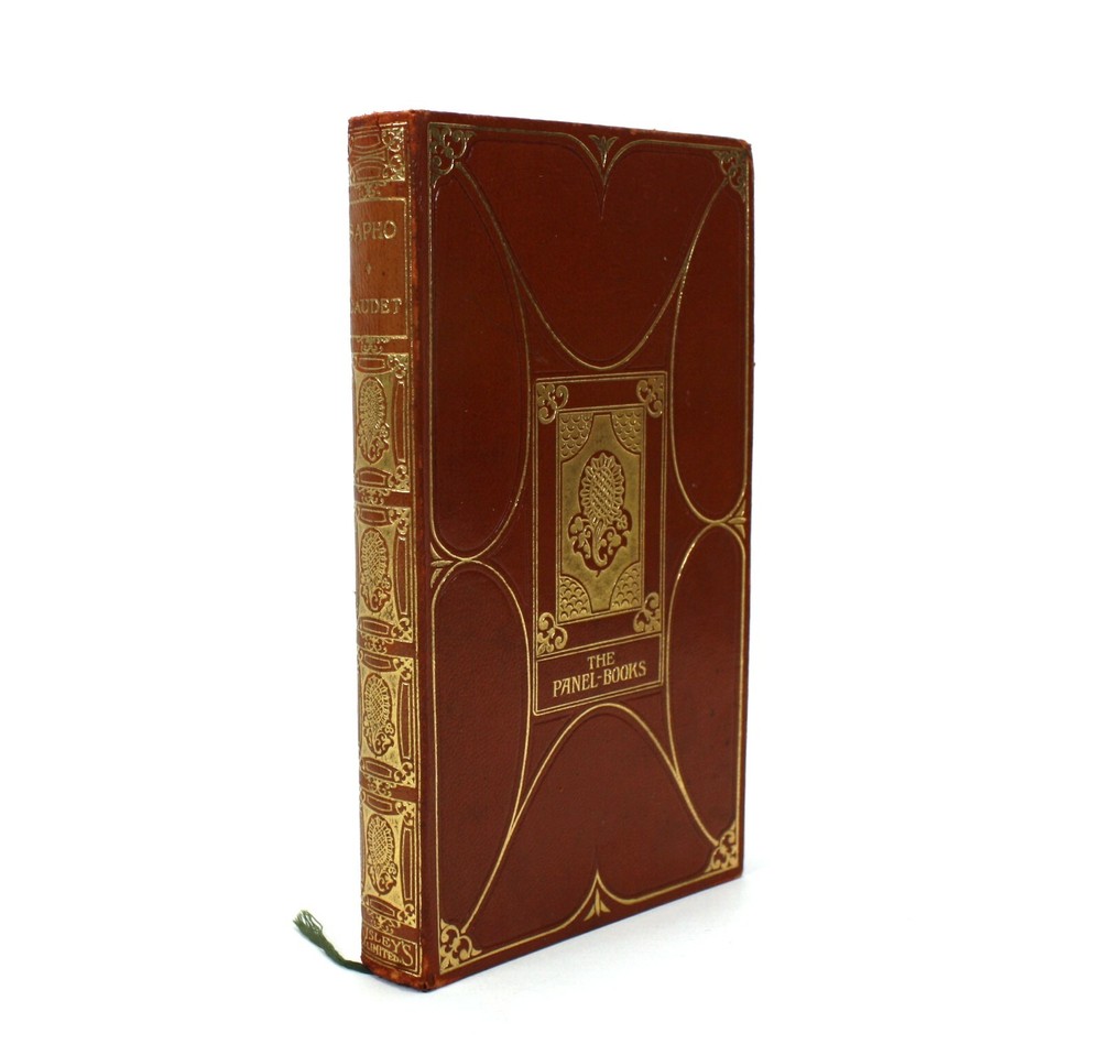 An attractive binding from a pocket-sized edition known as 'The Panel Books', and with a 'The Times Book Club' label to rear pastedown. Sapho; A novel, by Alphonse Daudet. With Frontispiece by Howard Somerville. embellishments by Edgar Wilson. Published by Sisley's Ltd, Makers of Beautiful Books, London. Undated, but c. 1907-08, based on other entries on Worldcat. An uncommon edition. A very good hardback bound in tan limp pleather with gilt decoration. Some scuffing and wear to extremities. Pictorial endpapers with bookplate of Parnham Phillips of Wendover to first pastedown. Text is clean and bright throughout with occasional scattered spotting. Gilt edges to textblock (now a little dulled). With page marker ribbon. Text in English. 224pp including frontispiece. Dimensions: Approximately 170mm high x 99mm wide x 20mm deep. Weight: Approximately 159g. An attractive binding from a pocket-sized edition known as 'The Panel Books', and with a 'The Times Book Club' label to rear pastedown. Sapho; A novel, by Alphonse Daudet. With Frontispiece by Howard Somerville. embellishments by Edgar Wilson. Published by Sisley's Ltd, Makers of Beautiful Books, London. Undated, but c. 1907-08, based on other entries on Worldcat. An uncommon edition. A very good hardback bound in tan limp pleather with gilt decoration. Some scuffing and wear to extremities. Pictorial endpapers with bookplate of Parnham Phillips of Wendover to first pastedown. Text is clean and bright throughout with occasional scattered spotting. Gilt edges to textblock (now a little dulled). With page marker ribbon. 224pp including frontispiece. Dimensions: Approximately 170mm high x 9