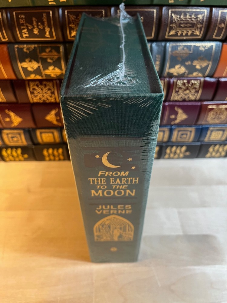 Author: Jules Verne Title: From the Earth to the Moon Publication: Easton Press, Limited/Numbered Deluxe Luxury Edition Description: Like New and still sealed in publisher's original shrink-wrap. Hardcover with Custom Crafted Clamshell Slipcase. Limited to 800 hand-numbered copies. 5 1/4" x 7 3/4". 496pp. About the Book: Verne's 1865 tale of a trip to the moon is (as you'd expect from Verne) great fun, even if bits of it now seem, in retrospect, a little strange. Our rocket ship gets shot out of a cannon? To the moon? Goodness! But in other ways it's full of eerie bits of business that turned out to be very near reality: he had the cost, when you adjust for inflation, almost exactly right. There are other similarities, too. Verne's cannon was named the Columbiad; the Apollo 11 command module was named Columbia. Apollo 11 had a three-person crew, just as Verne's did; and both blasted off from the American state of Florida. Even the return to earth happened in more-or-less the same place. Coincidence -- or fact!? We say you'll have to read this story yourself to judge. Features include: - Fully bound in genuine leather. - 22kt gold deeply inlaid on the “hubbed” spine. - Superbly printed on acid-neutral paper that lasts for generations. - Sewn pages – not just glued like ordinary books. - Satin-ribbon page marker. - Gilded page ends. - Bound in the USA. Imported materials. - Rigorous inspection at every stage ensures adherence to our exacting standards. - Superb craftsmanship and commitment to quality. All orders are packed carefully and shipped quickly. Photos are of the actual book you will receive. Please reach out with any questions.