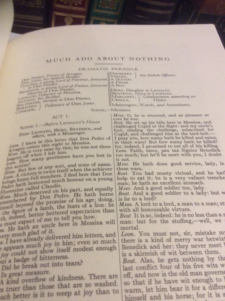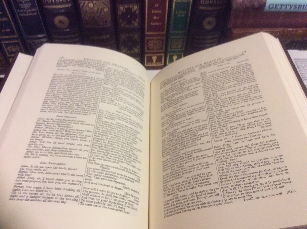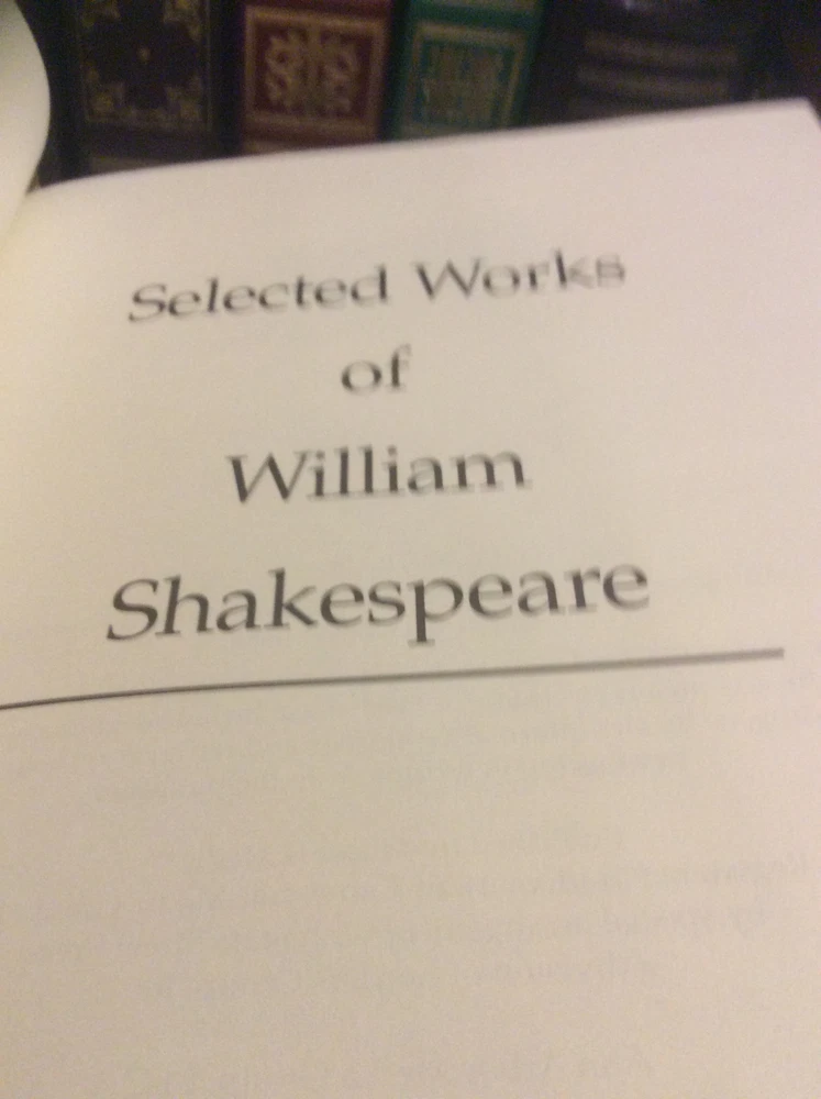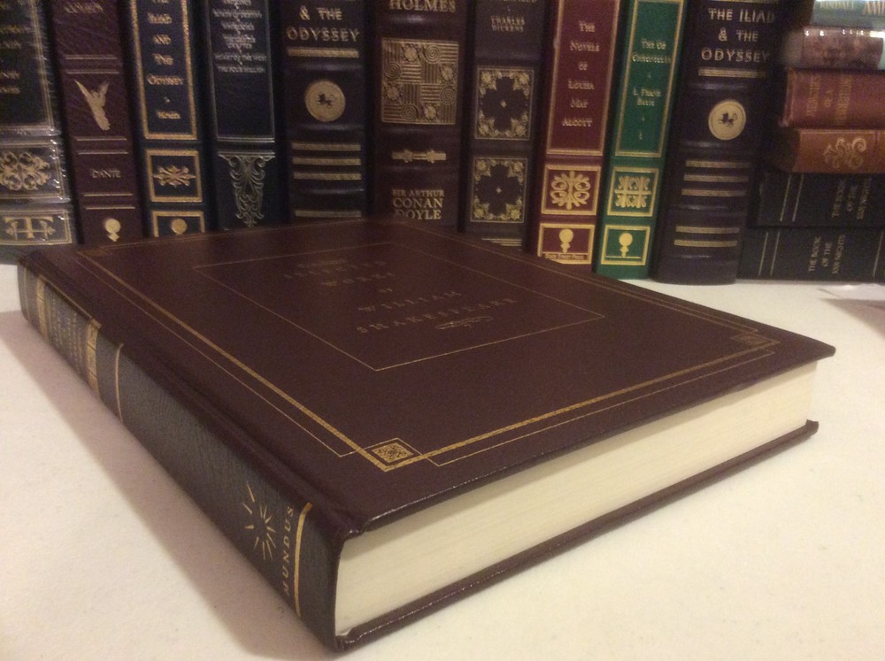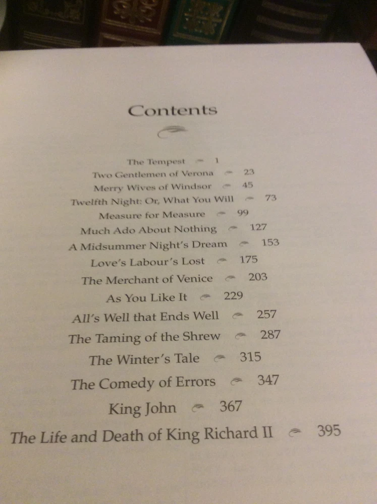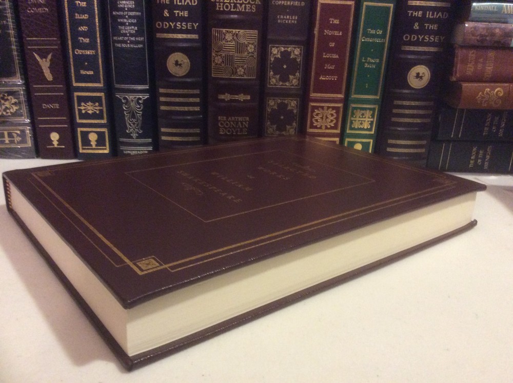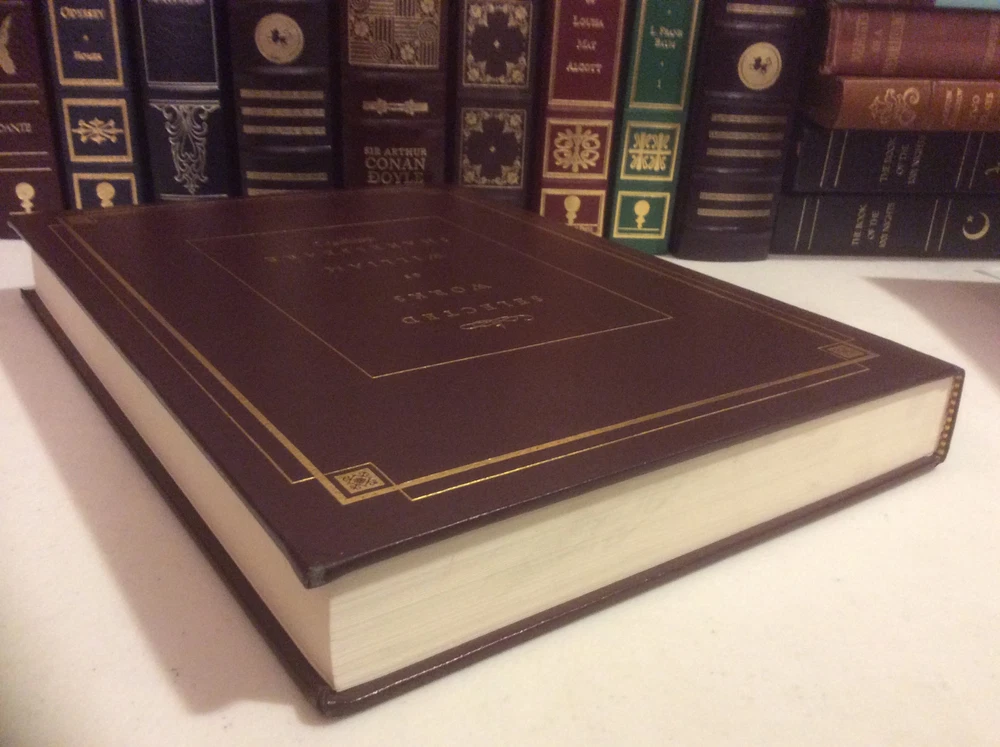 Selected Works of William Shakespeare bound in leather, with gold accents. The Tempest Two Gentlemen of Verona Merry Wives of Windsor Twelfth Night: Or, What You Will Measure for Measure Much Ado About Nothing A Midsummer Night's Dream Love's Labour's Lost The Merchant of Venice As You Like It All's Well that Ends Well The Taming of the Shrew The Winter's Tale The Comedy of Errors King John The Life and Death of King Richard II Item Condition: This oversize leather-bound book is in Very Good condition, with no names, bookplates, or stamps inside. The pages are clean and the binding is sound. Dimensions are approx: 12.25" x 9.25" x 1.25" This book will ship in a box, with bubble wrap. Photos are of the actual book that will be shipped.