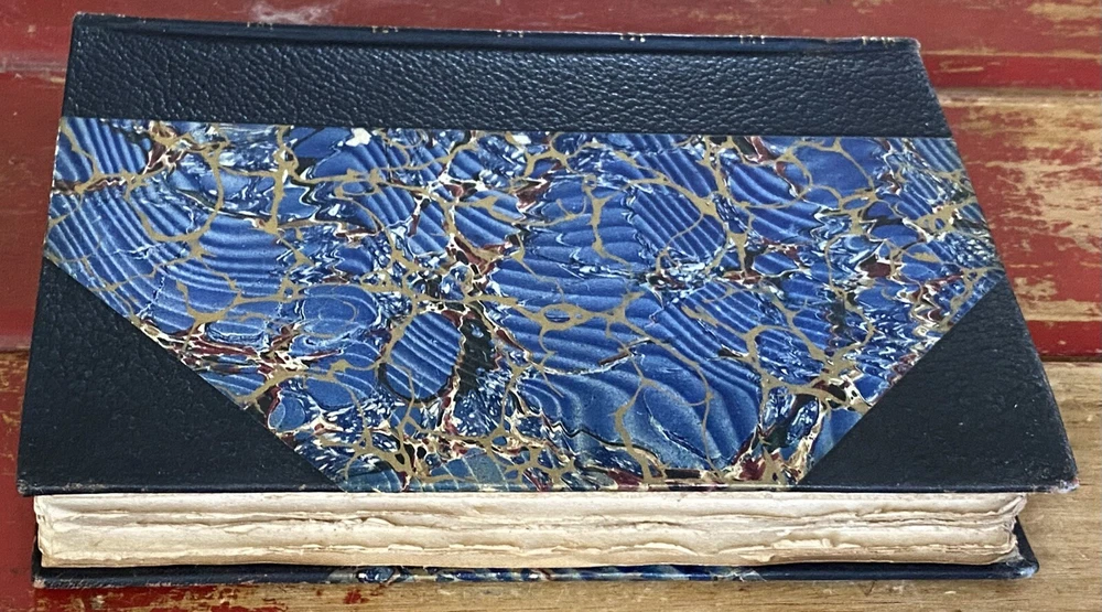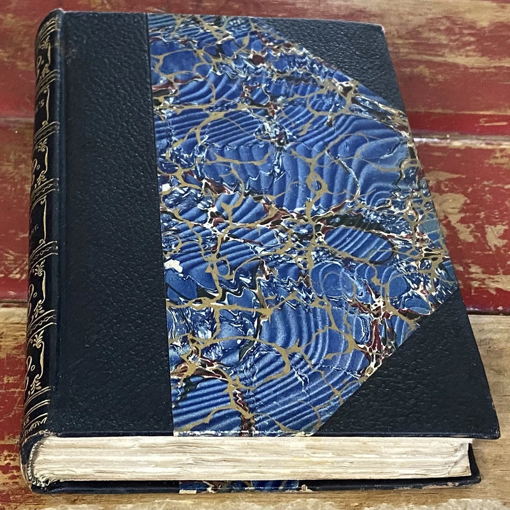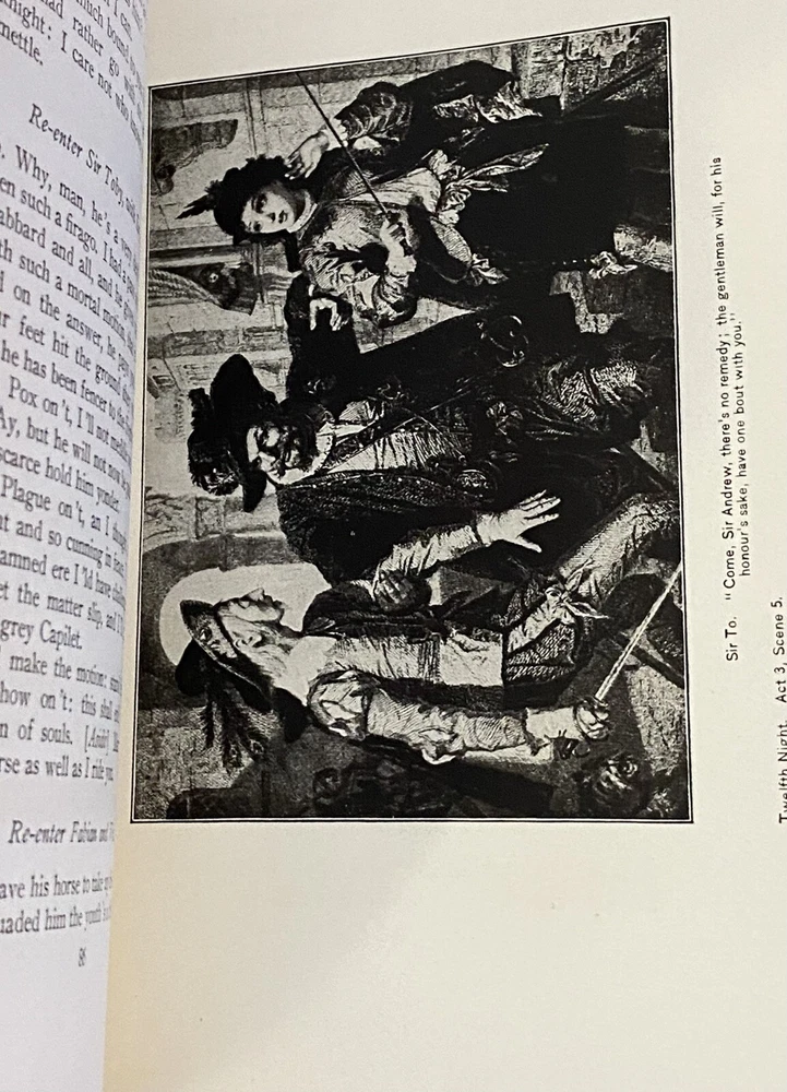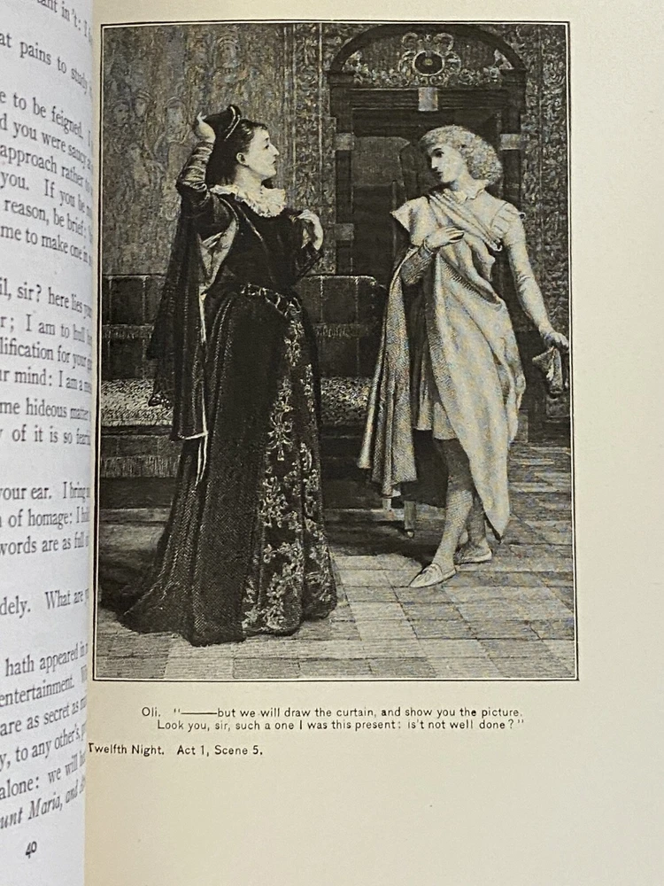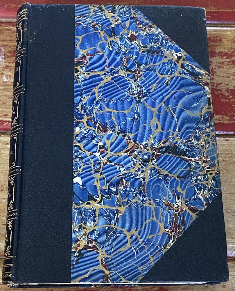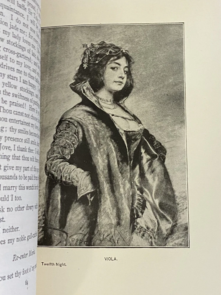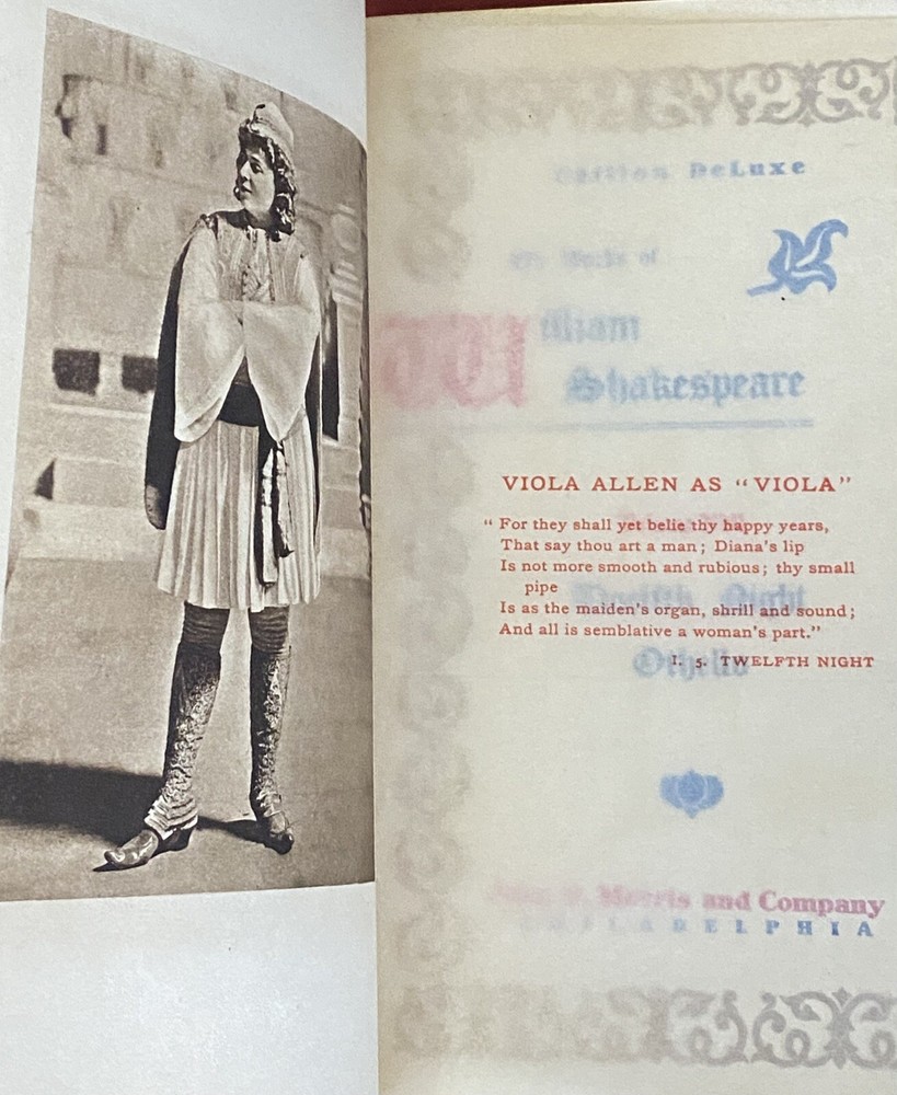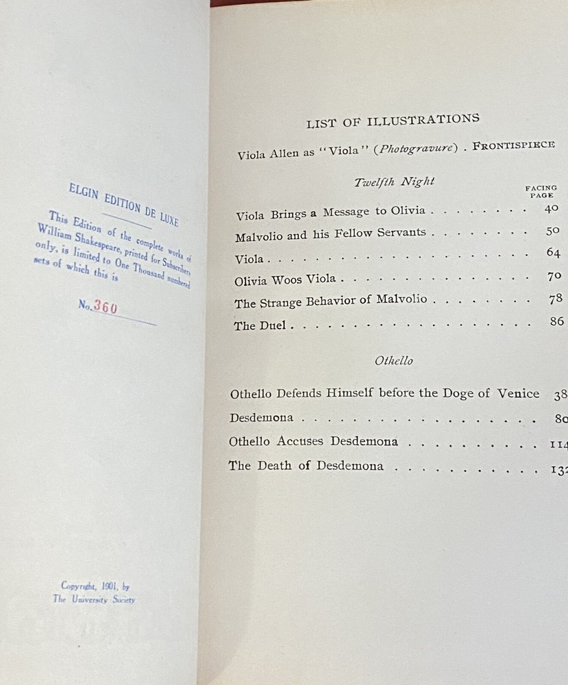 This rare Elgin Edition De Luxe of Shakespeare’s Works Vol. XVI printed for subscribers only is #360 of 1,000 numbered sets. Twelfth Night, Othello. Printed in 1901 for John D. Morris & Company, Philadelphia, Pa., illustrated with tissue protected frontis and other illustrations. Appears unread. Very tight binding with no staining, no missing loose or torn pages, no writing. Some uncut pages. Partial black leather binding with gold, blue, white and red marbled boards, gilt title and design to spine. Decorated endpapers. Gilt upper page edges, rough cut fore edges and lower edges of text block. Very clean crisp pages. Very minor wear to leather spine ends, tips, edges. Amazing condition considering age of this book. No writing, no missing loose or torn pages. Pages are bright and crisp. Some uncut pages.
