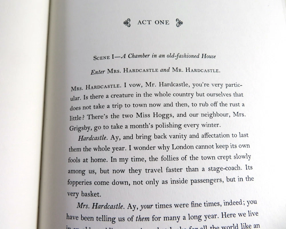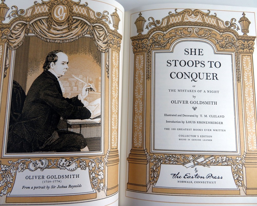 She Stoops To Conquer or The Mistakes Of A Night, Oliver Goldsmith, Easton Press Title: She Stoops To Conquer - or - The Mistakes Of A Night Author: Oliver Goldsmith Illustrations: T. M. Cleland Published: 1978, Easton Press, Norwalk CT Series: The 100 Greatest Books Ever Written About: Theater play. The script is an eighteenth-century farce which tells the story of the Hardcastle family's mishaps and adventures trying to marry off a single daughter. Physical Description: Navy leather over boards with gilt decorative front and spine. Raised bands on spine. All edges gilt. Silk moiré endpapers. Bound-in satin ribbon marker. Ghost of a removed bookplate inside front board. Pages: 121 Dimensions (inches): 11 x 8 Shipping weight: 3 lbs SKU: 6031 Powered by SixBit's eCommerce Solution