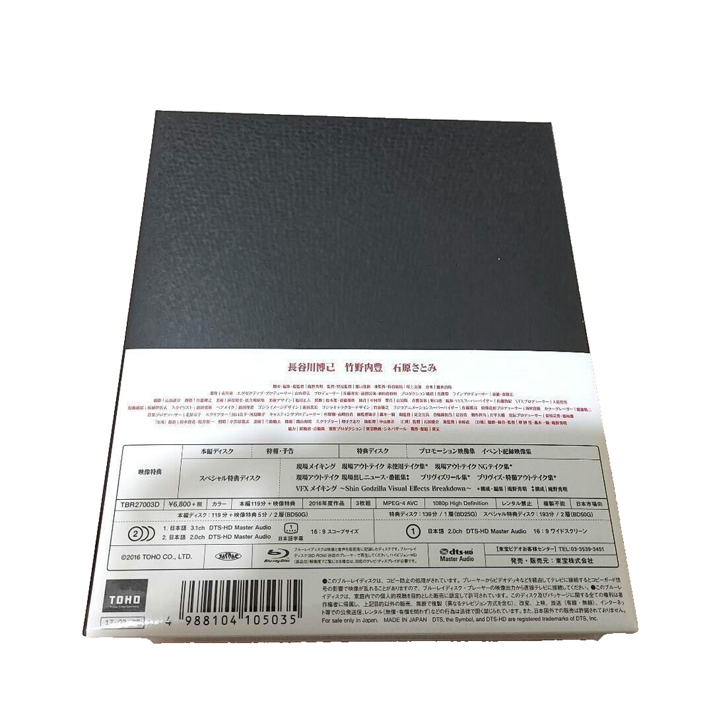 Title <Blu-ray> Shin Godzilla Special Edition (Blu-ray Disc) Manufacturer Toho Co., Ltd. Model number TBR-27003D Original title Shin Godzilla Release Country of production Japan / Release year 2016 Other \ [Picture] Cinemascope size = 16:9 [Sound] Original language Japanese / Original audio method dtsHD Master Audio 3.1ch Surround / Original language Japanese Product description Reality (Japan) vs. fiction (Godzilla). Genre Director: Anno Hideaki Cast: Hasegawa Hiroki, Takenouchi Yutaka, Ishihara Satomi, Kora Kengo, Matsuo Satoru, Ichikawa Mikako, Yo Kimiko <Included Bonuses> Digipak + outer case / Commentary book / Bonus disc 1 [Blu-ray] / Bonus disc 2 [Blu-ray] <Bonus disc contents> Promotional footage collection / Campaign footage collection / Making of / Outtakes / Previs reel / Previs outtakes / CG making of ※ This Disc Blue ray