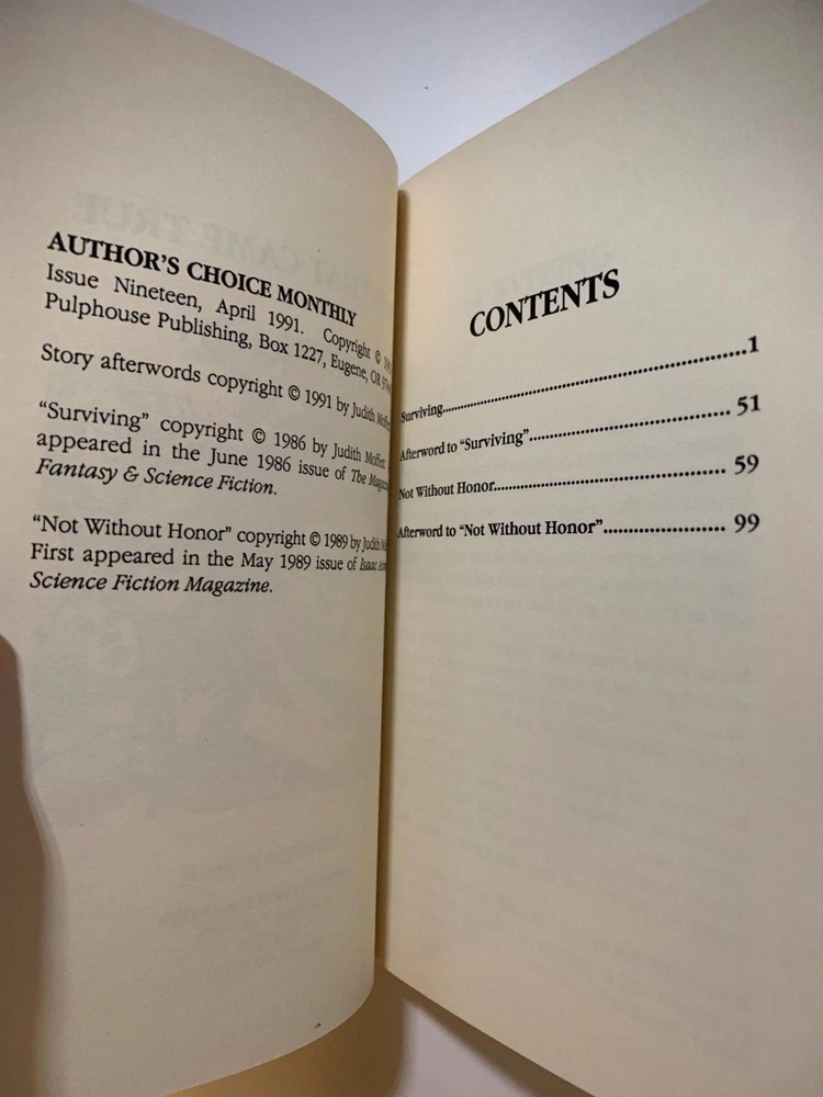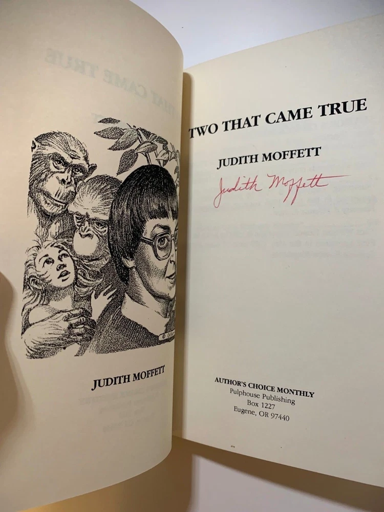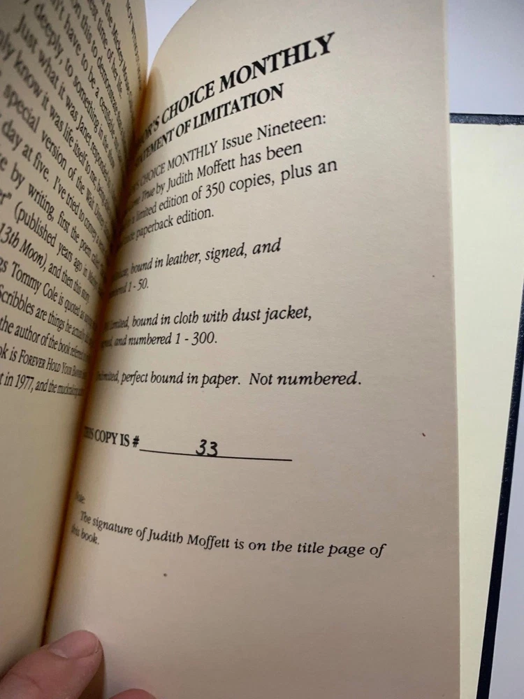 Judith Moffett. Author's Choice Monthly Issue 19, Two That Came True. Author's Choice Monthly, 1991. 105 pages. This is one of fifty signed and numbered copies bound in full leather over boards. Number may differ from that in photo as we have multiple copies. As new and unread. As new and unread. Shelf #7. About Us We have over seventy years combined experience buying, selling, collecting, shipping, and grading books. We are avid bibliophiles who rigorously grade our materials. If anything, we under grade. We love books, especially signed first editions, and we treat our books--eventually your books--with care and respect. Shipping All shipping costs are for inside the USA. For shipping outside of the USA, please contact us first. All books are packaged extremely well to preserve the book's condition. All books are shipped with USPS tracking via Media Mail unless other arrangements are made. Books are shipped within 3 business days of payment clearing. Returns If the book arrives and you have questions or concerns, please contact us immediately so we can work things out. If the condition is not as described, we are happy to refund your money and shipping both ways. If you simply want to return the book because you do not want it anymore, we will refund the purchase price of the book but not shipping. All returns must be handled within 30 days of receiving the book. Again, if you have any questions, please contact us immediately.