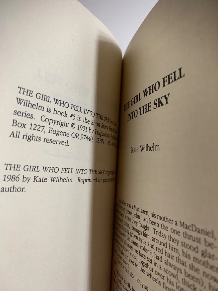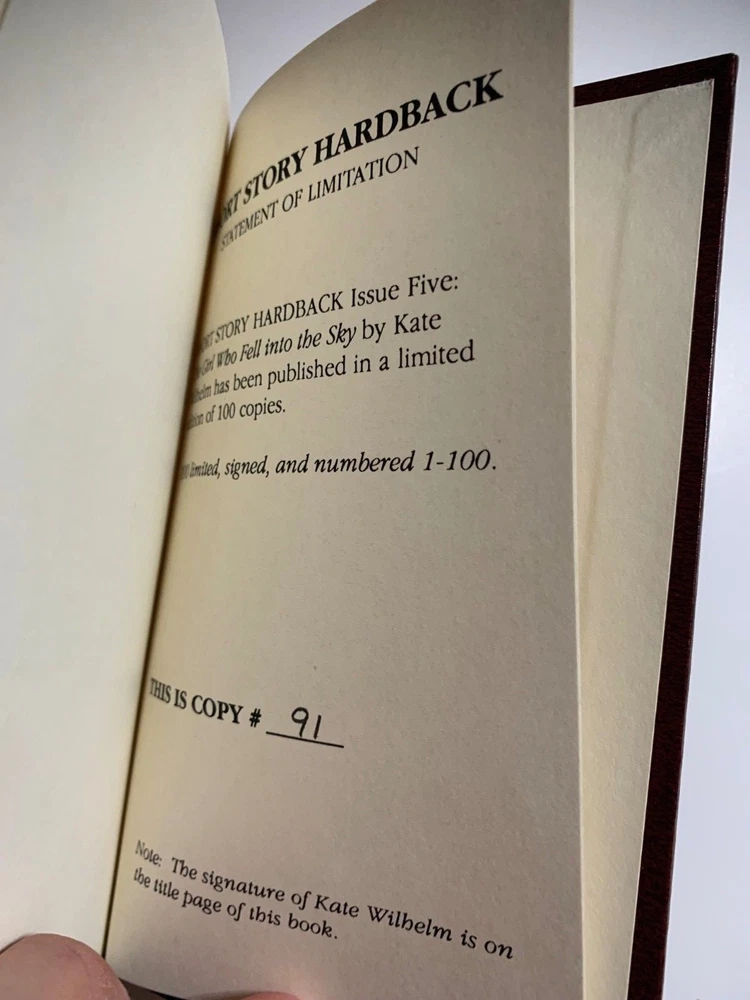 Kate Wilhelm. The Girl Who Fell Into the Sky. Pulphouse. 1991. 53 pages. Signed limited first edition leather bound. One of 100 numbered copies of the Short Story Hardback Series. Number may differ from that in photo as we have multiple copies. These hardbound books are small in size and measure aprox. 4.25" X 7". Fine and unread. As new. We ship all our books in boxes! About Us We have over seventy years combined experience buying, selling, collecting, shipping, and grading books. We are avid bibliophiles who rigorously grade our materials. If anything, we under grade. We love books, especially signed first editions, and we treat our books--eventually your books--with care and respect. Shipping All shipping costs are for inside the USA. For shipping outside of the USA, please contact us first. All books are packaged extremely well to preserve the book's condition. All books are shipped with USPS tracking via Media Mail unless other arrangements are made. Books are shipped within 3 business days of payment clearing. Returns If the book arrives and you have questions or concerns, please contact us immediately so we can work things out. If the condition is not as described, we are happy to refund your money and shipping both ways. If you simply want to return the book because you do not want it anymore, we will refund the purchase price of the book but not shipping. All returns must be handled within 30 days of receiving the book. Again, if you have any questions, please contact us immediately. Pulphouse Axolotl