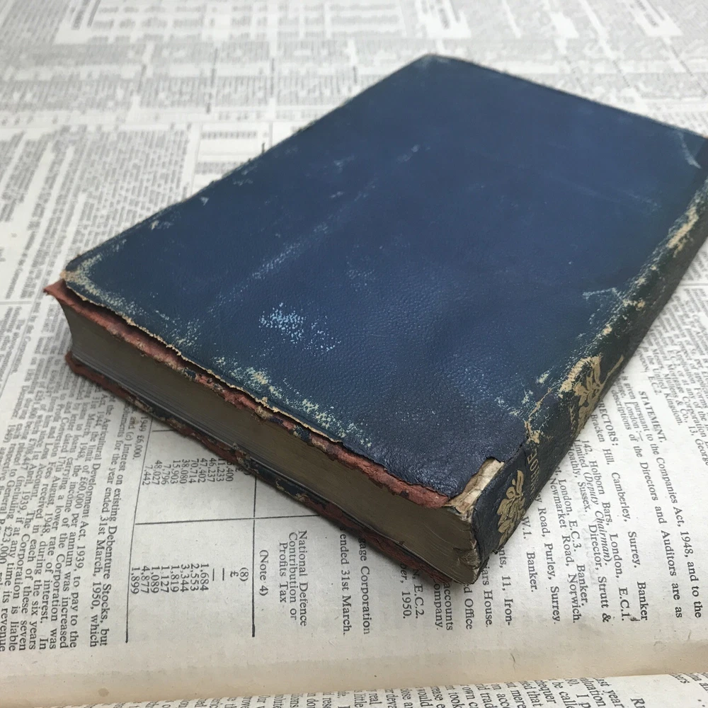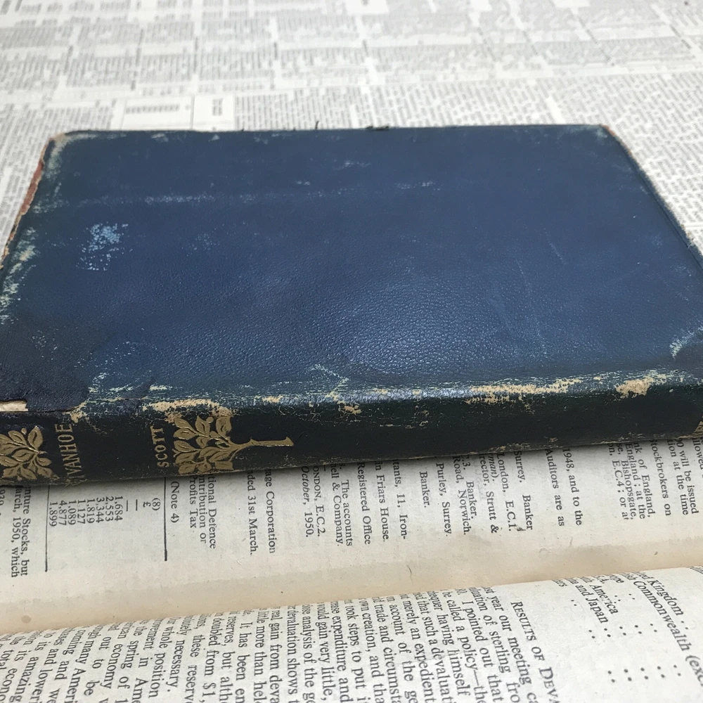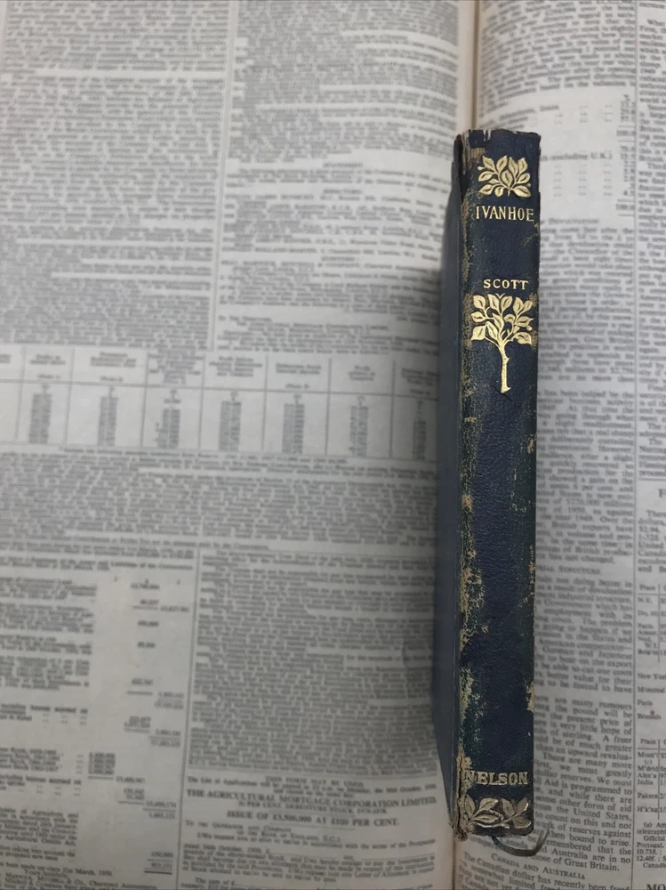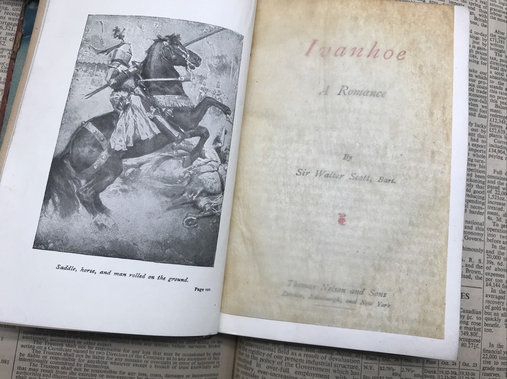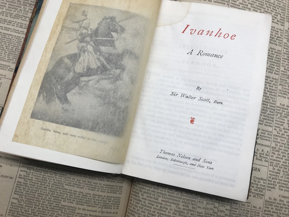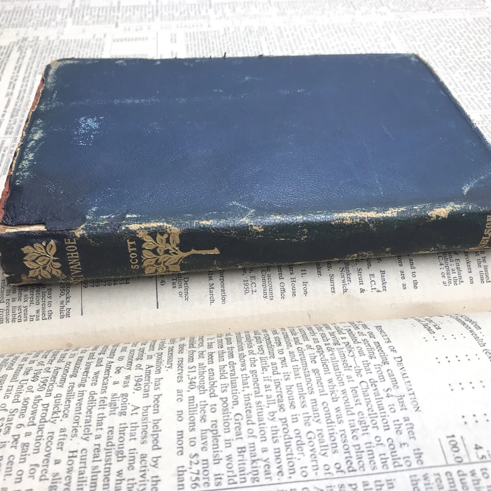“I’ll woo her as a lion wooes his bride.” This is a leather softcover copy of Sir Walter Scott's Ivanhoe, published by Thomas Nelson and Sons in New York in 1924. The book contains a special Christmas inscription of 1924 and covers the topic of medieval romance and history. Written in English, this book is a great addition to any collection of antiquarian and collectible books. Book binding is sound but the book shows much wear. See photos. The leather front has separated from the cover almost all the way to the spine. 3/4 the way, perhaps. Chips, splits, tears, etc. a water stain permeates the top left corner of the spine, and can be seen most of the way through the book. See photos. Beautiful Christmas inscription of 1924 inside front. Fabulous endpapers. Study notes hand written in rear. Dark blue ribbon bookmark. Book measures 6.25 x 4.25 x .5” and weighs 7 oz. Note: Although we try to show and describe our items in detail, please take into consideration that these items are vintage and may carry marks of their age and history, including ‘Old Book Smell’. Zoom pictures for greater detail and feel free to contact us with questions.