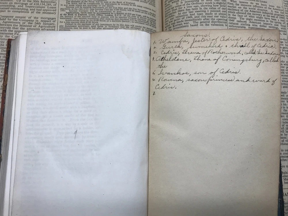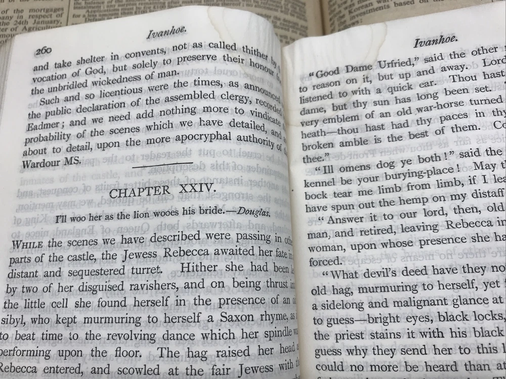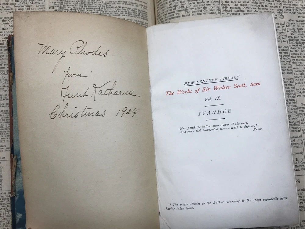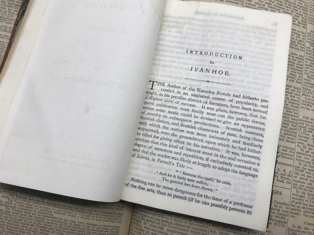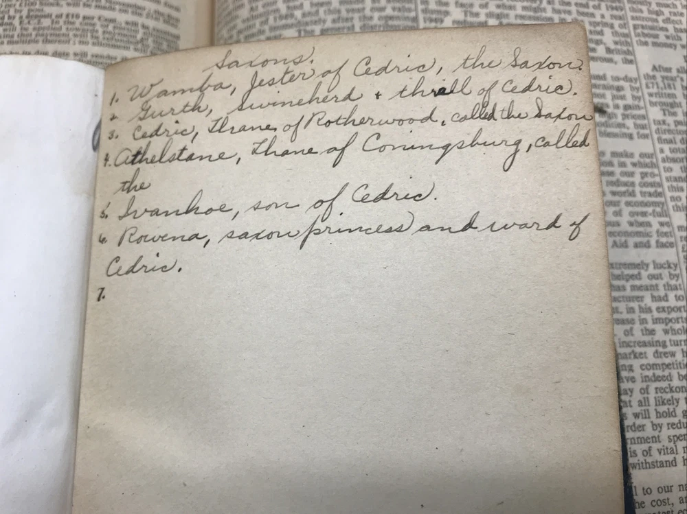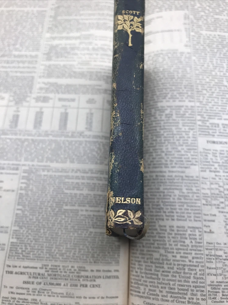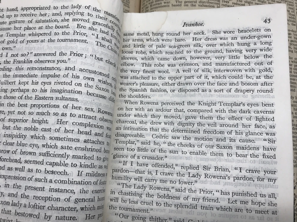 “I’ll woo her as a lion wooes his bride.” This is a leather softcover copy of Sir Walter Scott's Ivanhoe, published by Thomas Nelson and Sons in New York in 1924. The book contains a special Christmas inscription of 1924 and covers the topic of medieval romance and history. Written in English, this book is a great addition to any collection of antiquarian and collectible books. Book binding is sound but the book shows much wear. See photos. The leather front has separated from the cover almost all the way to the spine. 3/4 the way, perhaps. Chips, splits, tears, etc. a water stain permeates the top left corner of the spine, and can be seen most of the way through the book. See photos. Beautiful Christmas inscription of 1924 inside front. Fabulous endpapers. Study notes hand written in rear. Dark blue ribbon bookmark. Book measures 6.25 x 4.25 x .5” and weighs 7 oz. Note: Although we try to show and describe our items in detail, please take into consideration that these items are vintage and may carry marks of their age and history, including ‘Old Book Smell’. Zoom pictures for greater detail and feel free to contact us with questions.