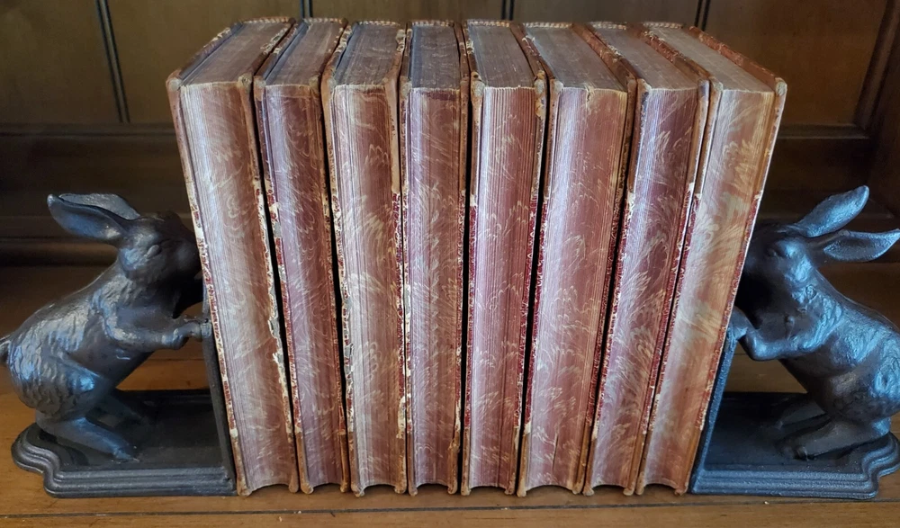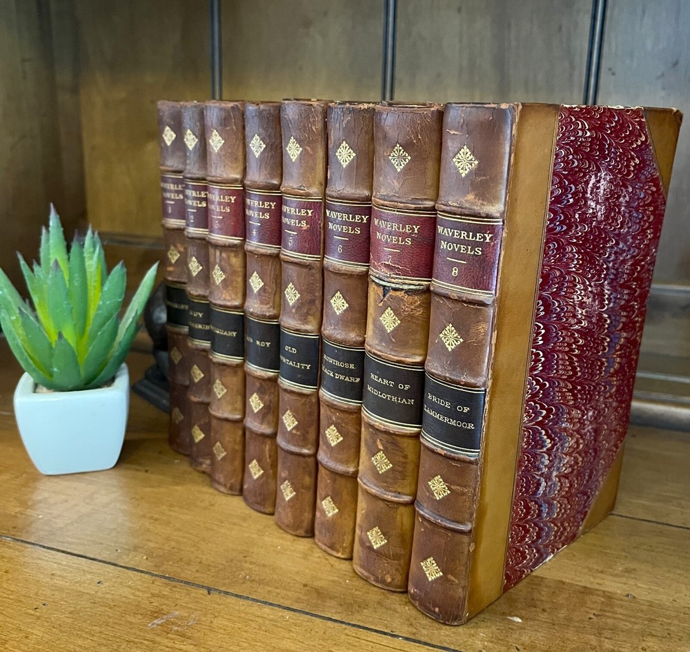 Up for sale is a very nice lot of 8 matching half leather books, volumes 1-8 in order and ideal for decorative / staging purposes. All are from the Sir Walter Scott Waverley series and this set has publication dates of 1886 . A nice solid and attractive set with the books measuring 7" tall. CONDITION: The books are in Very Good plus condition with solid bindings but some rub off to the front edges on a few and light chipping here or there to the leather spines or covers. NOTE: This is our 20t h year selling on eBay with a 100% satisfaction rating, so buy with confidence! Please check Our Ebay Store for many other great rare, collectible books and popular author series! SHIPPING: U.S. mainland buyers ONLY. We ship all items well packed in a box with tracking, via U.S.P.S. Media Mail, FREE of charge!