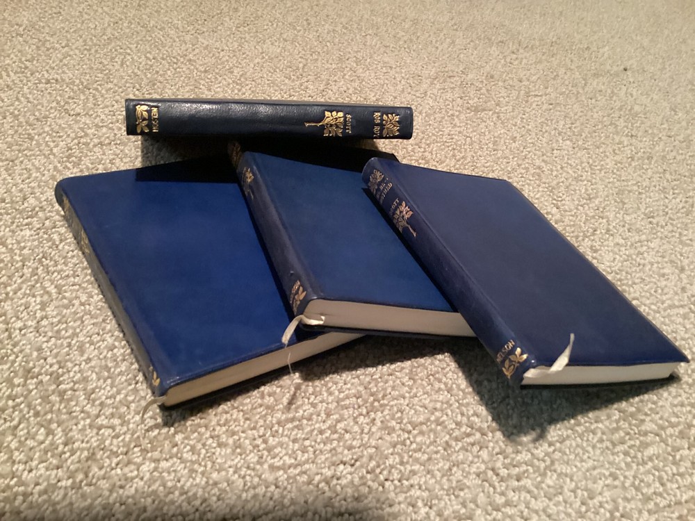 Sir Walter Scott's Novels, Thomas Nelson & Sons, publisher, 25 volume soft leather bound, gilt top, illustrated books. The 25 volume set is in the original box, box has some damage, all books are in very fine condition.