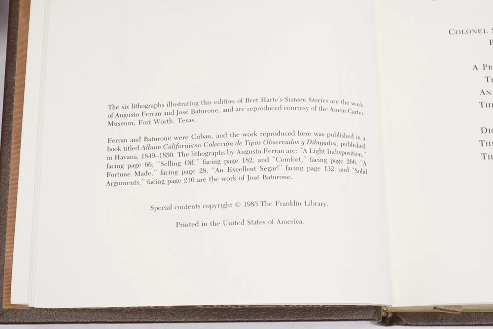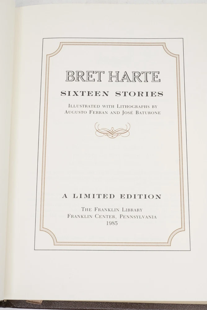 Sixteen Stories by Bret Harte | 1985 | The Franklin Library | Leather Bound Hardcover | Collector's Library of The World's Best-Loved Books Excellent vintage copy with a sturdy binding, light handling wear, embossed gilded leather covers & spine, gilded page ends with some spotting, and unmarked pages. Ships Securely Boxed. See photos for details. | You will receive the actual item pictured. WE SHIP QUICKLY! Items often leave the same day but normally the next business day. If you have any problem with your order, please do not leave negative feedback. Message us ASAP and we will work to make sure your issue is resolved quickly. Thank you for shopping with us on eBay!